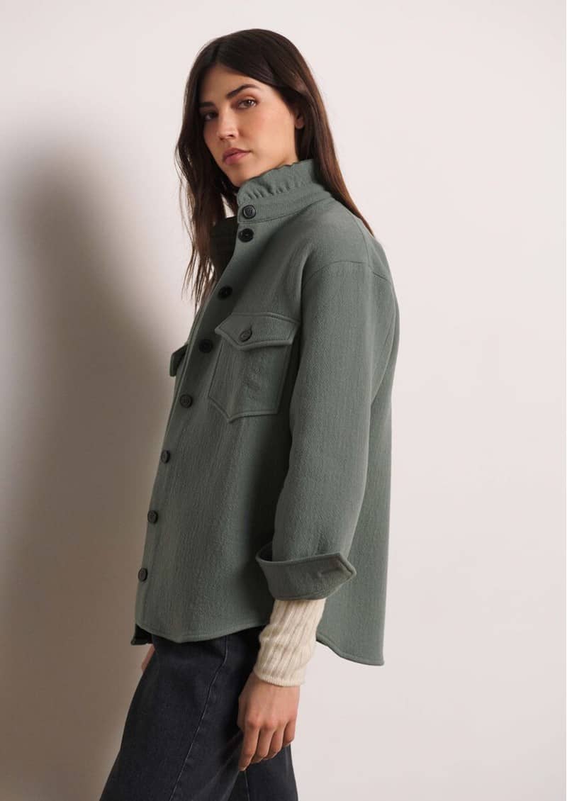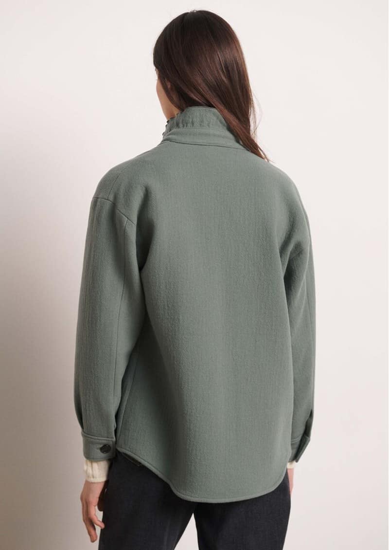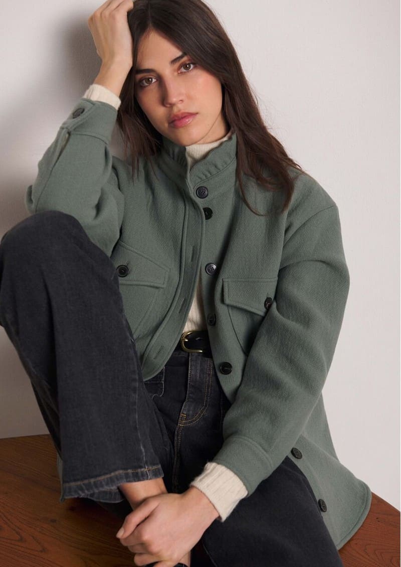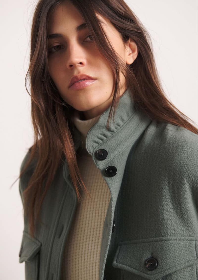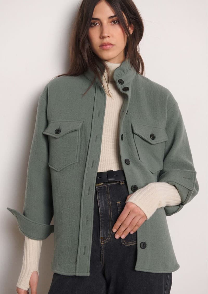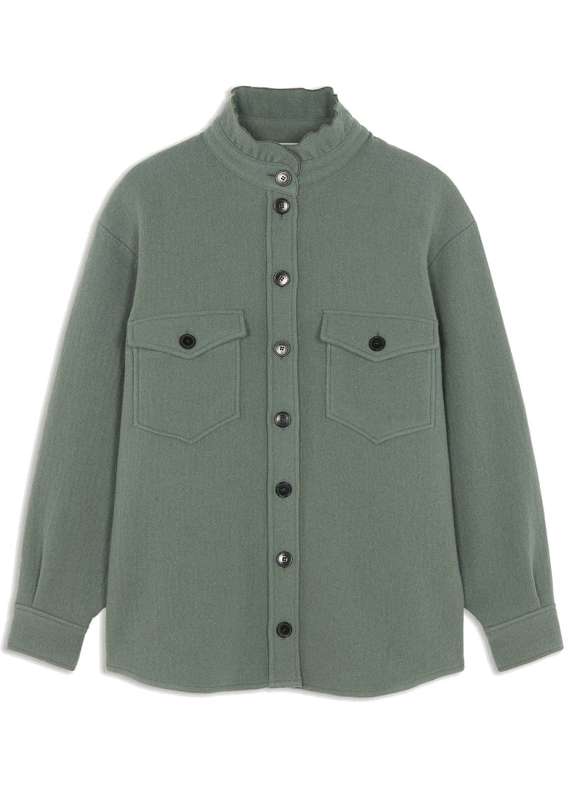 The BA&SH Aya shirt in green is a stylish shirt/jacket in woven wool. The loose fitting jacket has a stand up frill collar, front chest pockets and button front fastening. This shirt is the perfect layering piece to take you into AW21, layering over fitted long sleeve t-shirts and team with straight leg jeans for the perfect stylish day look.
