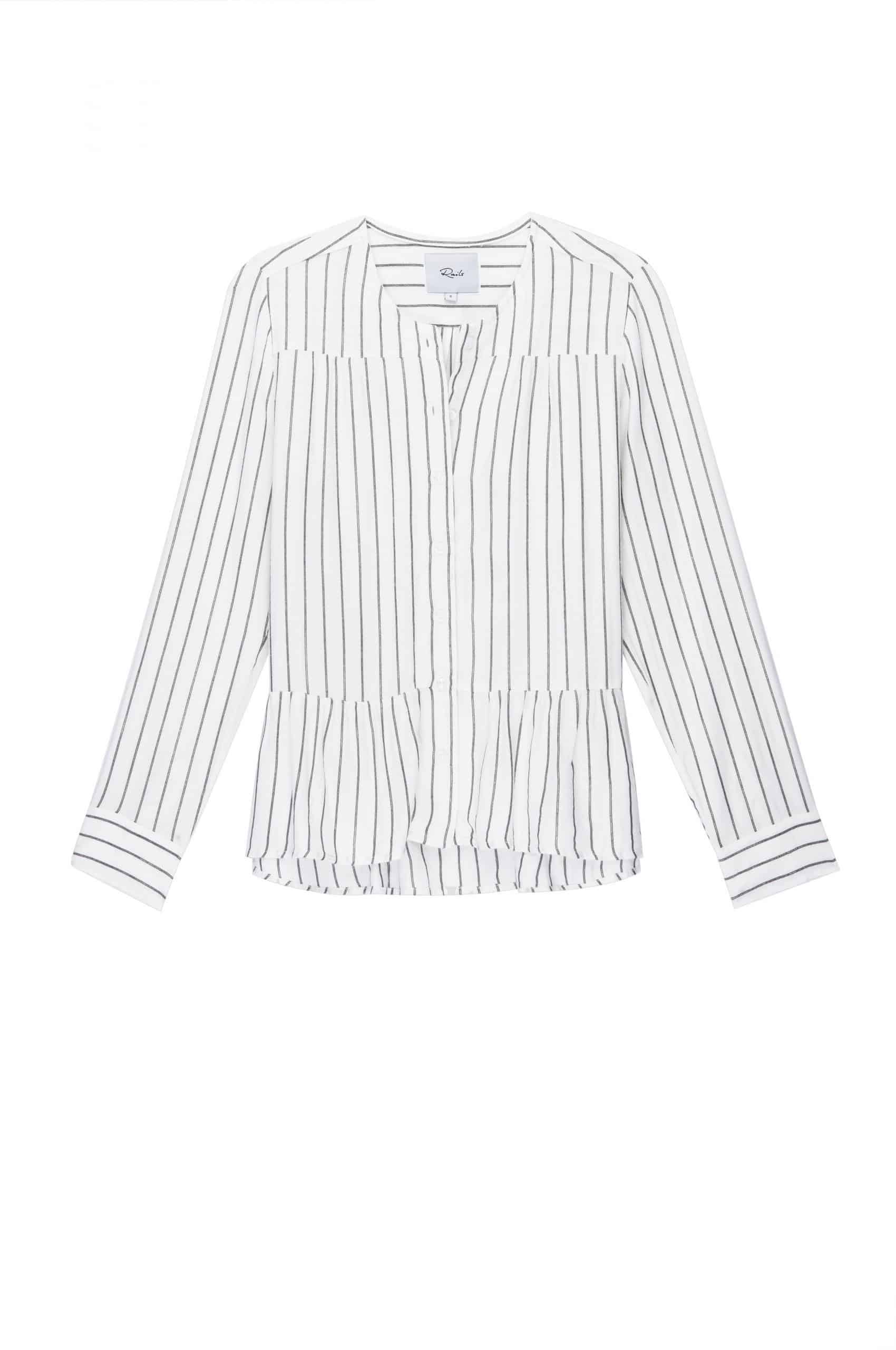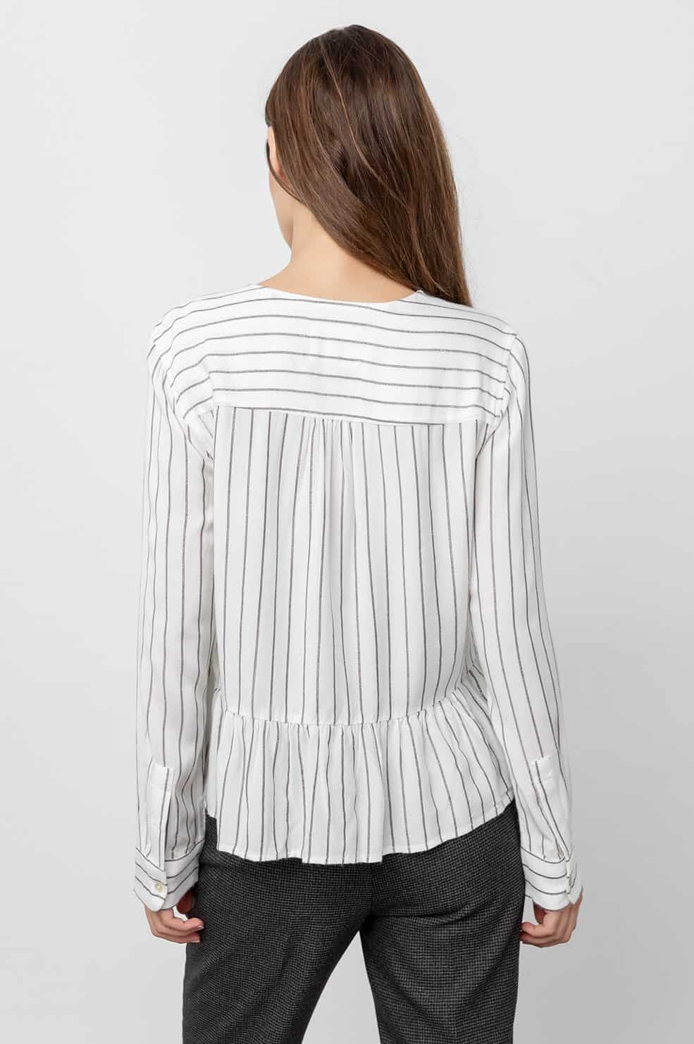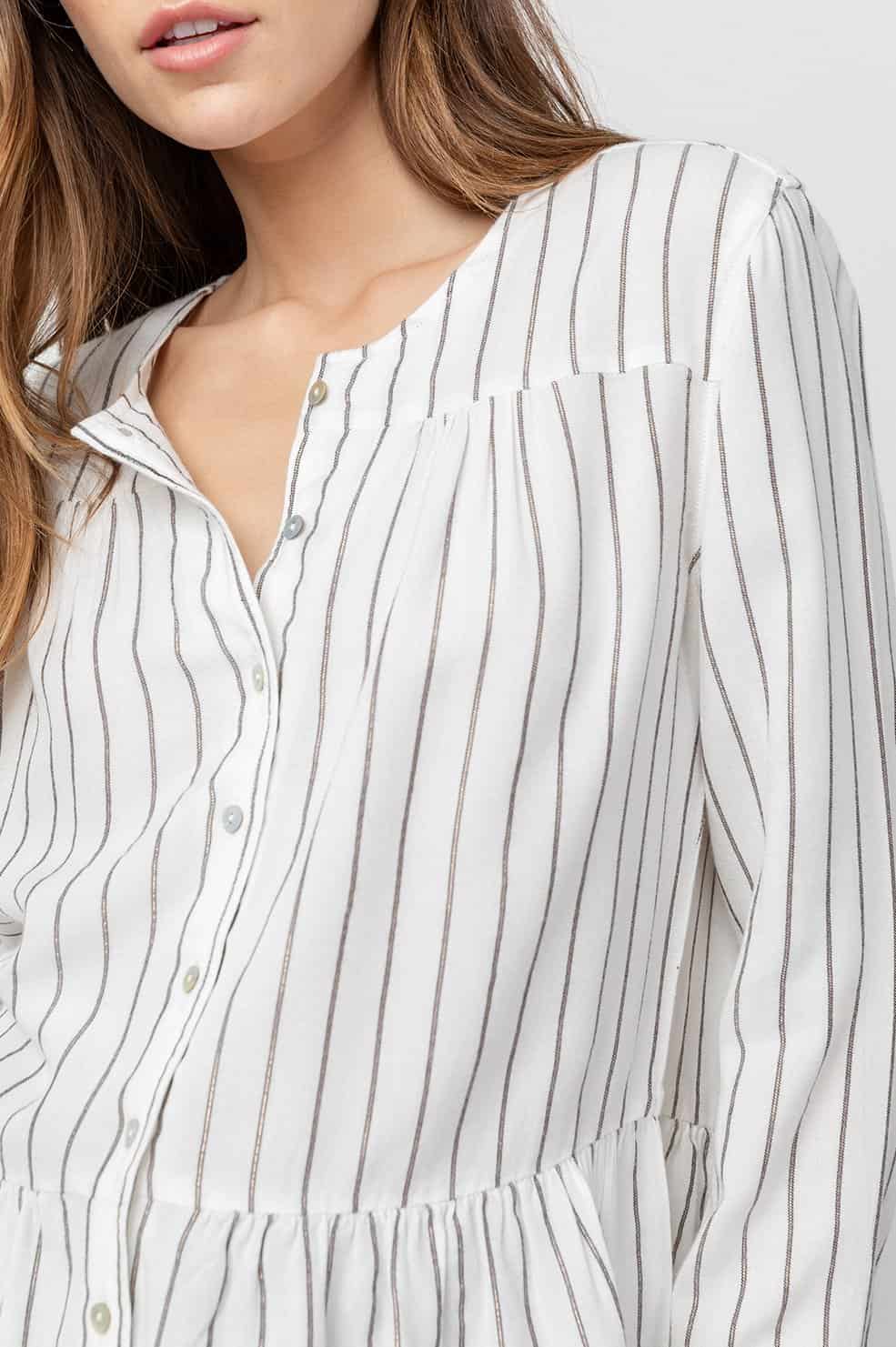 This Rails Ruby Shirt in San Marino Stripe is a collarless, long sleeve, lightweight soft linen, white peplum top featuring gold metallic Lurex pinstripes and shell buttons. A polished yet relaxed fit top that flatters any shape. A perfect work-to-weekend option you can wear all year-round.