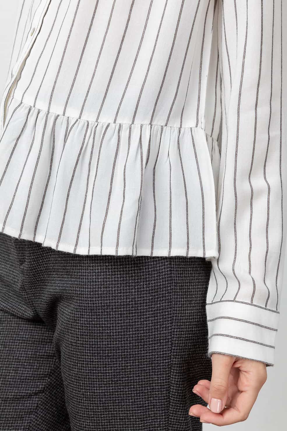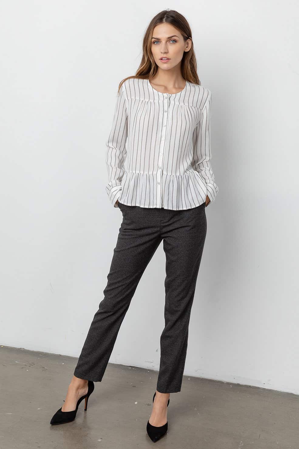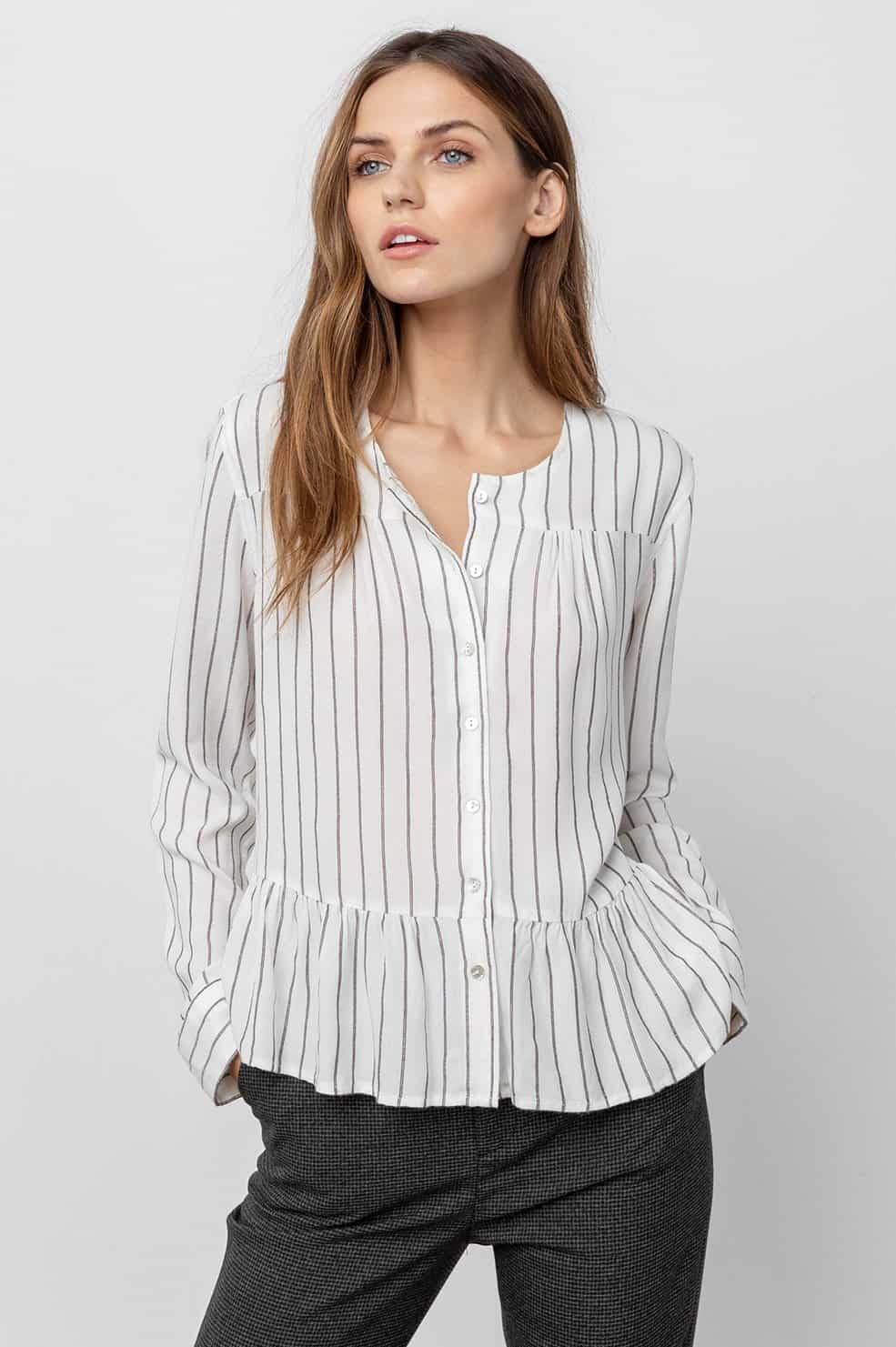 This Rails Ruby Shirt in San Marino Stripe is a collarless, long sleeve, lightweight soft linen, white peplum top featuring gold metallic Lurex pinstripes and shell buttons. A polished yet relaxed fit top that flatters any shape. A perfect work-to-weekend option you can wear all year-round.
