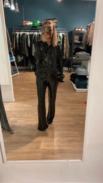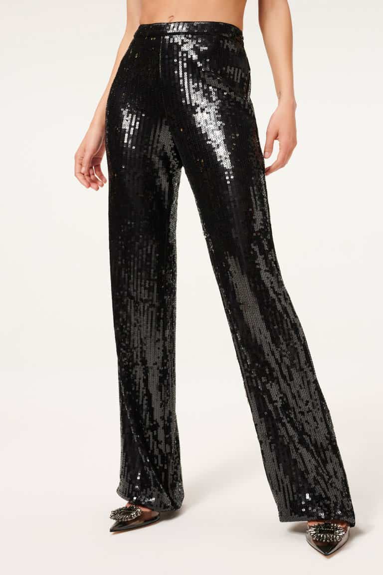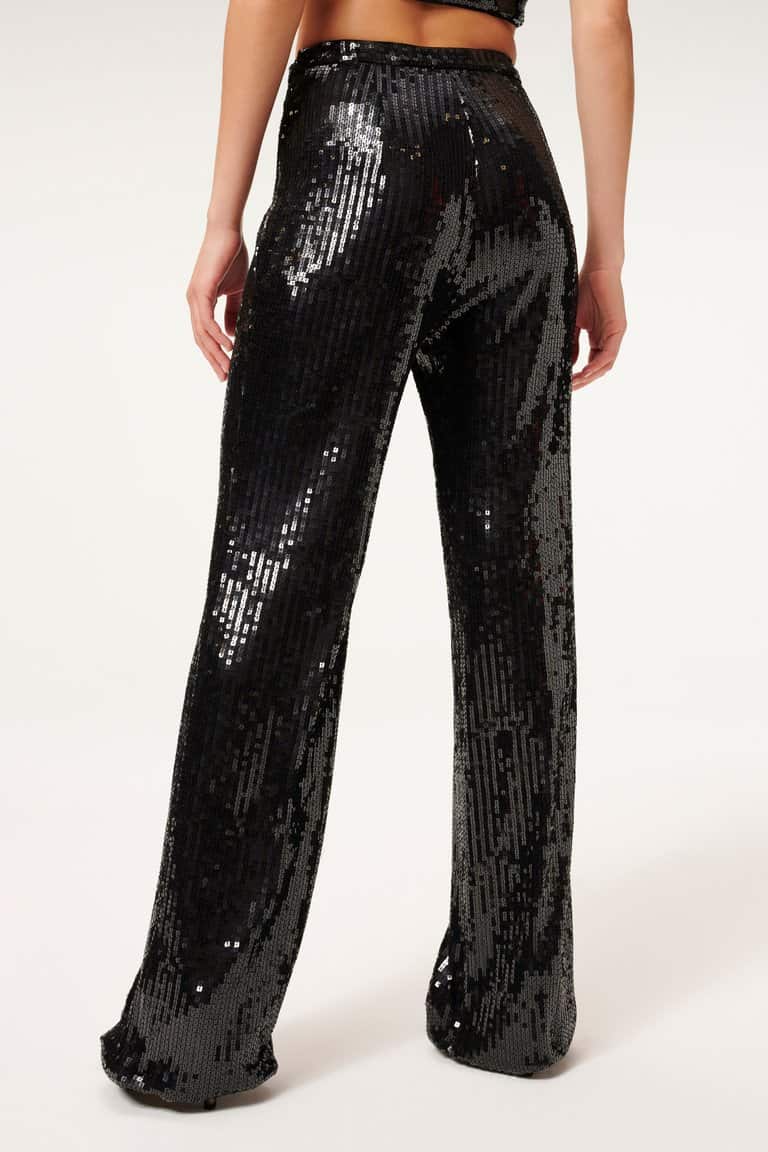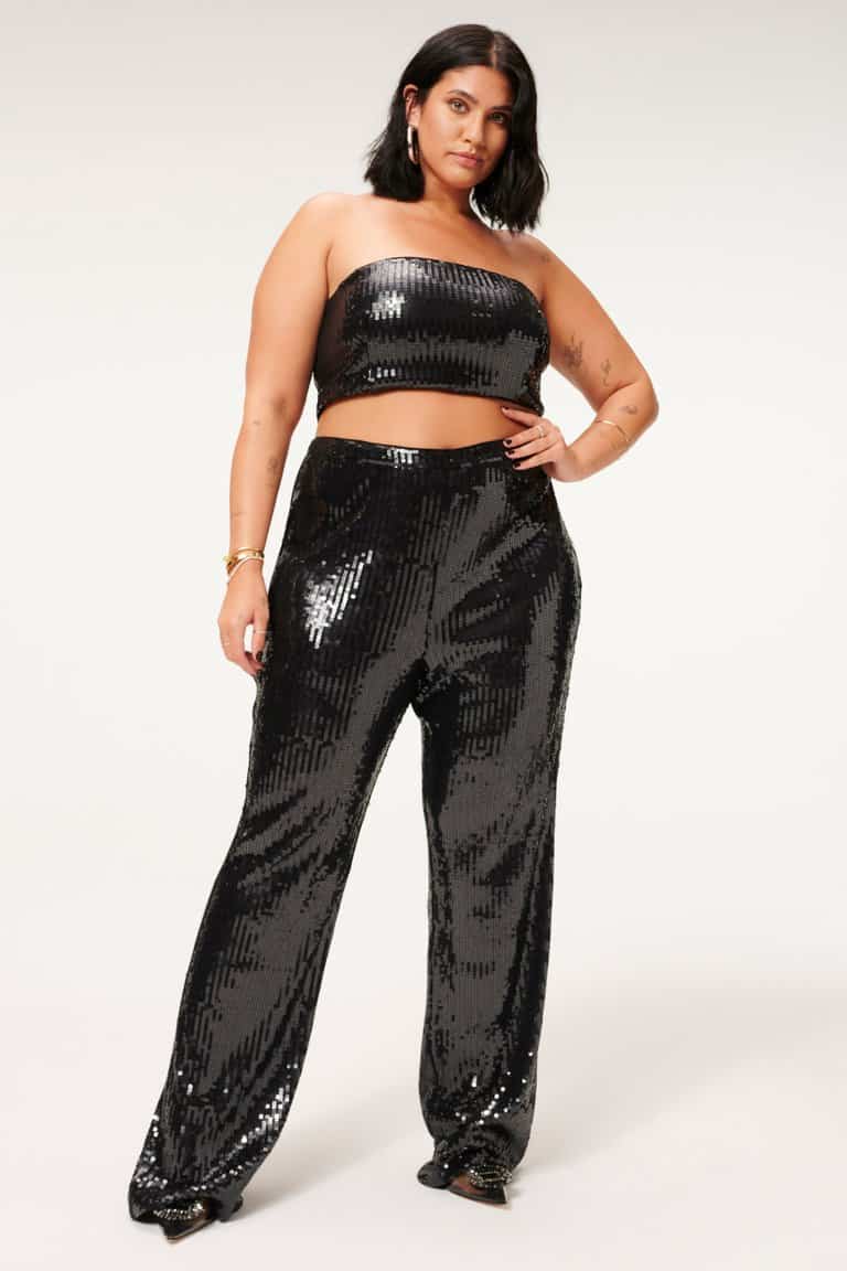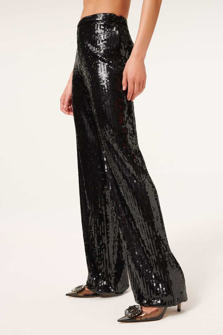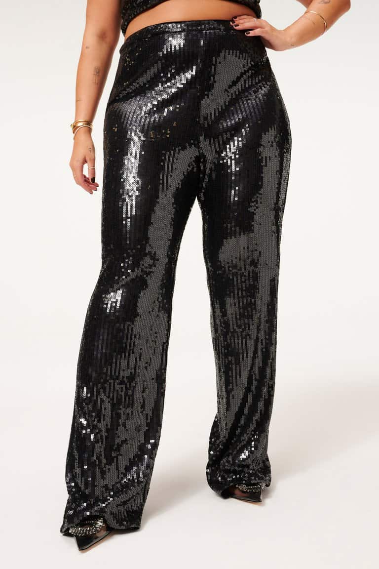 The Good American Sequin wide leg trousers in black are stunning pair of statement party trousers. The high rise and concealed side zip make these super flattering when on and guaranteed to make you stand out on your nights out. Dress them down with heels and a t-shirt or for that unrivalled party outfit wear with the coordinating sequin party shirt.