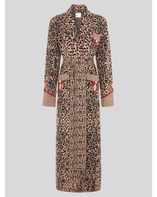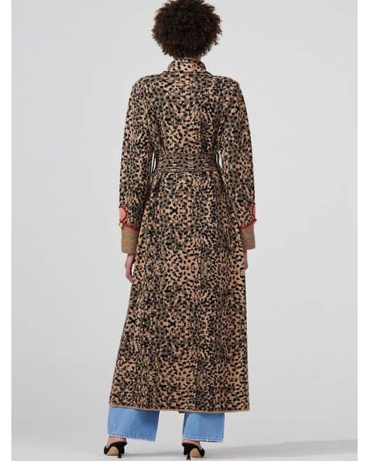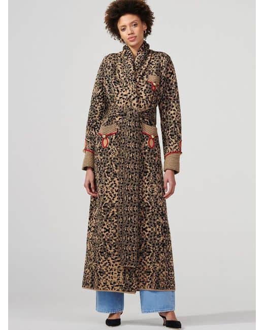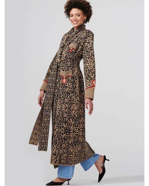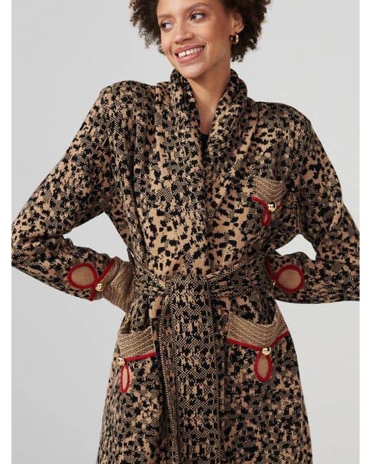 The Hayley Menzies Hari Merino Jacquard Smoking Robe in camel/black is 100% woolmark-certified merino was used in the knitting. Over 7 hours are required to produce one hari smoking robe, this comes back for the new year with a striking cheetah print. The large wide knit belt that comes with this maxi cardigan coat is intended to be worn belted. Buttons with a gold dome design, luxury is in the details, as seen by the piping and hand-finished red contrast piping. This smoking robe embodies carefree elegance.