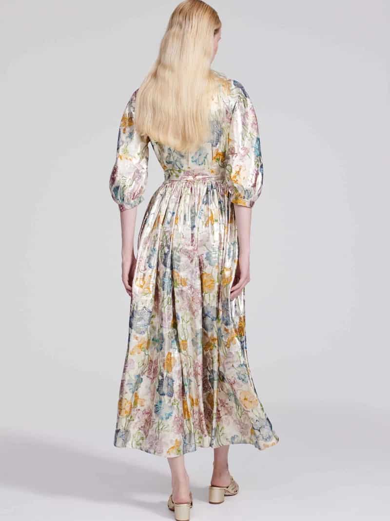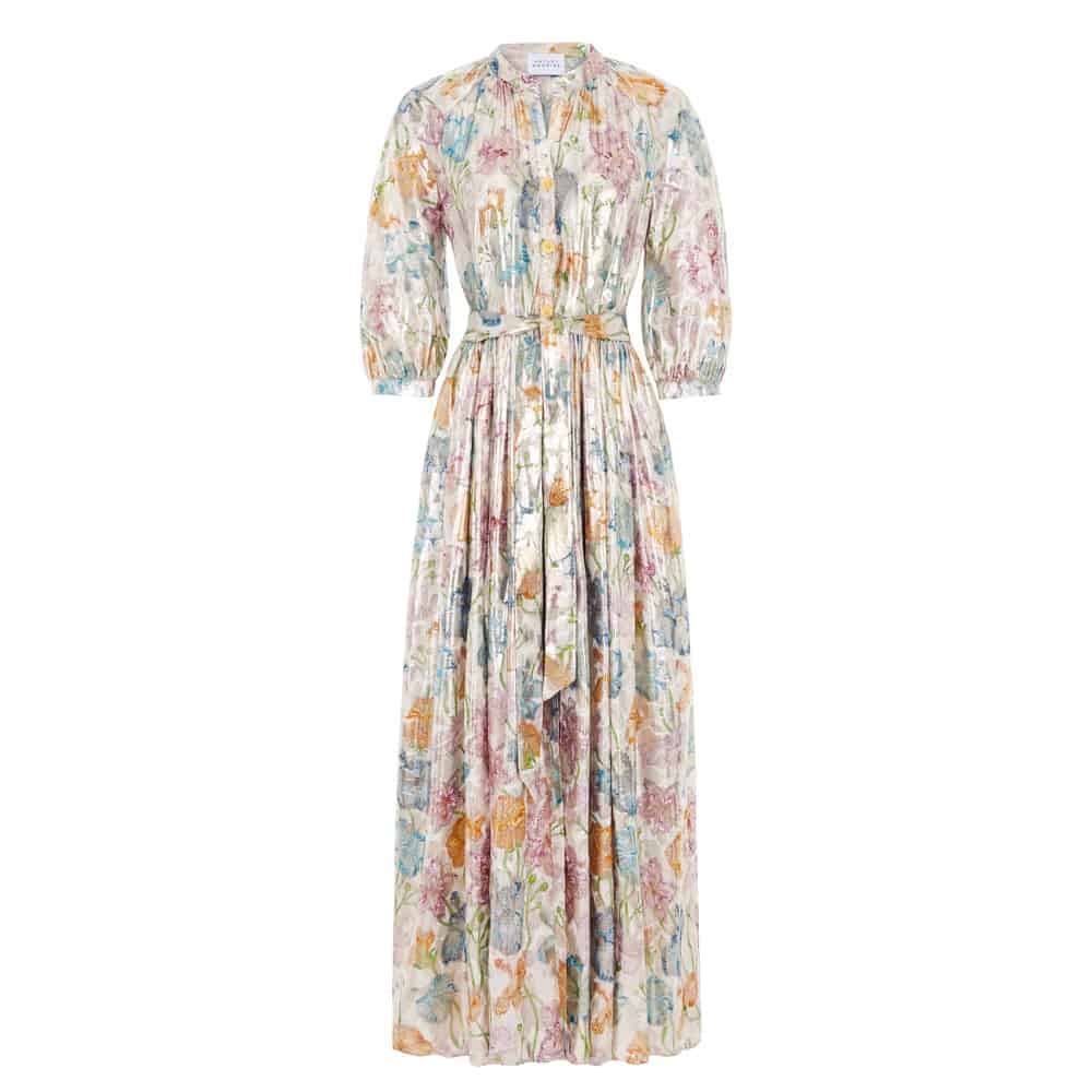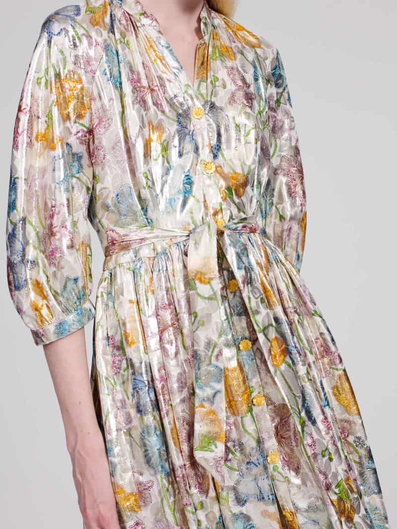The Hayley Menzies shimmering bonita shirt dress in gold is the most amazing dress guaranteed to get you noticed. The silk jacquard dress is a vision of layered textures and prints, with a v neck, gold daisy button fastening down the centre front, 3/4 sleeves and a self fabric belt that allows you to wear it belted or not. The skirt is slightly more fitted at the top and gathered at the waist whilst the skirt is voluminous helping to create the flattering silhouette. This dress is one of our favourites from this season's collection, wear it loose with sandals for an elevated day look or tie at the waist and add heels for a stunning evening look.