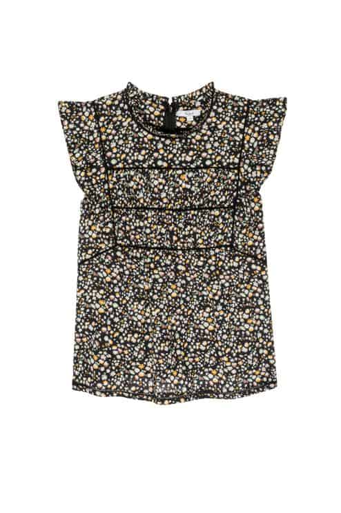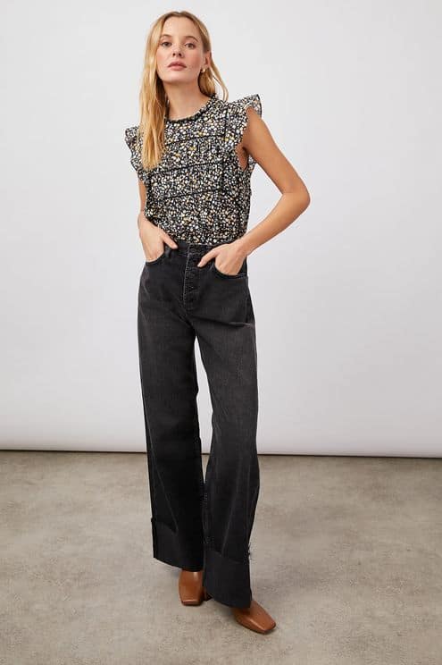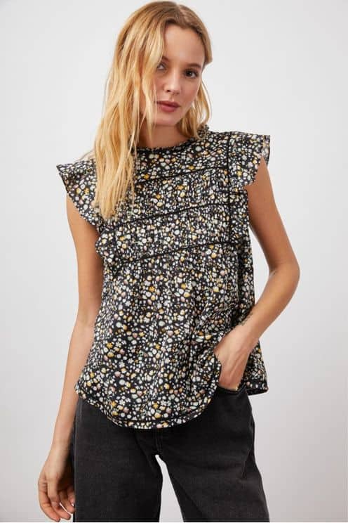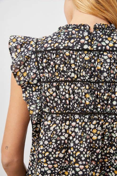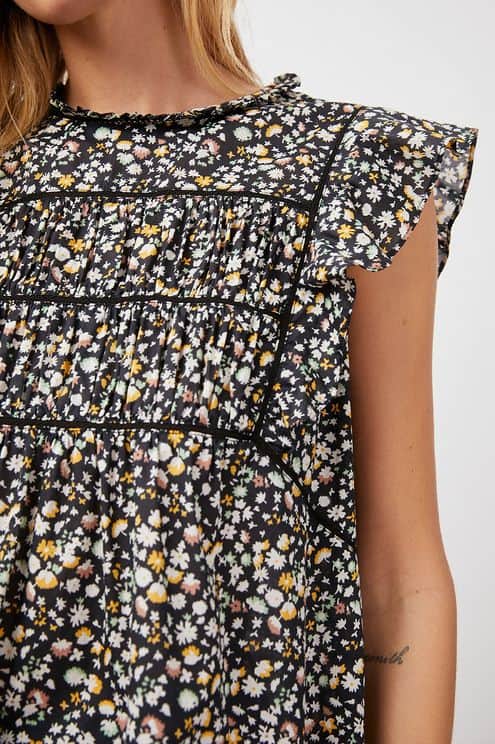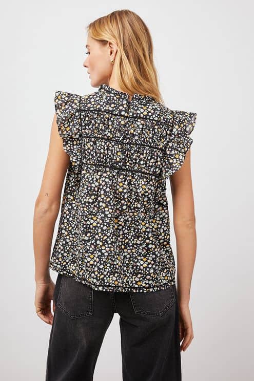 The Rails Filomena Top in black mini floral is a stunning summer top. This gorgeous shirt has a pull-on design with a single button closure at the nape of the neck. For a simple, daily outfit, pair with white jeans. For cocktails with the girls, add a pair of leather joggers and heels. This blouse is simple to match with your wardrobe thanks to its ditsy "small" flower pattern in white, green, yellow, and light brown on a black backdrop. The design detail on this blouse is gorgeous with a sweet ruffle collar, ruffle sleeves, pintuck detail on the chest and back, and lovely black cotton net inserts.