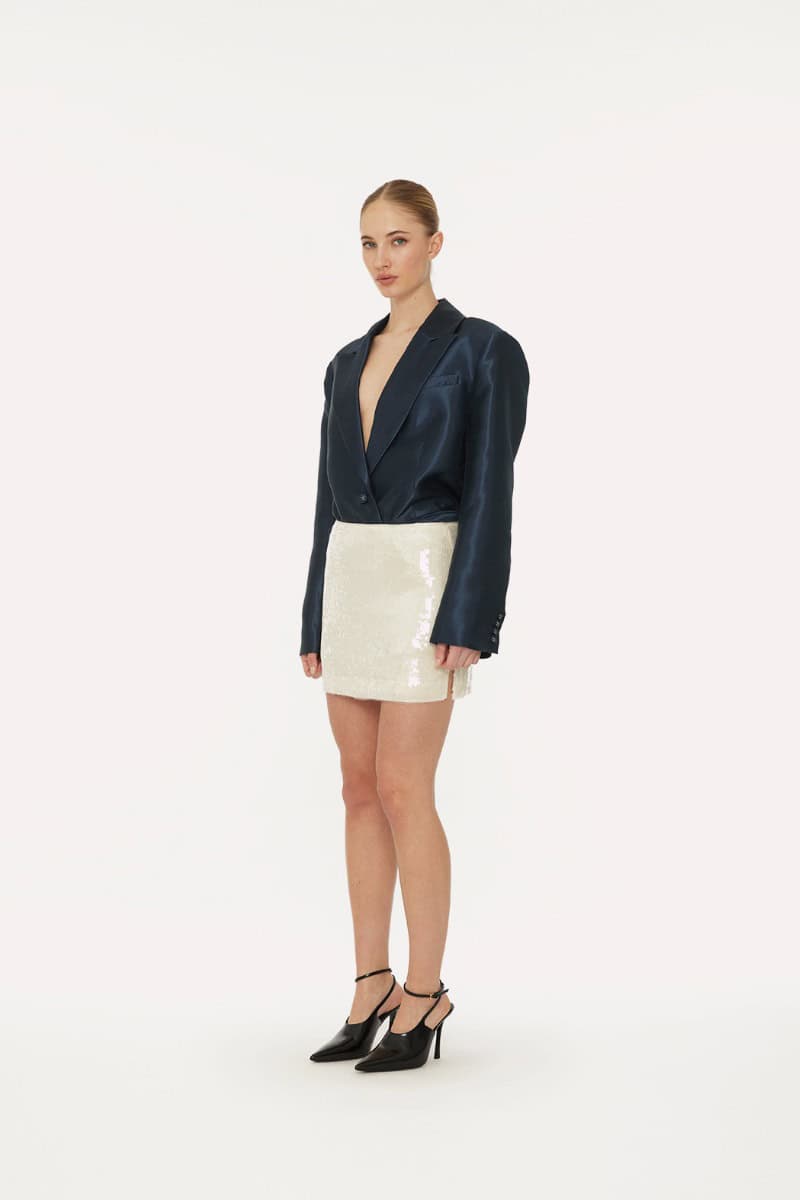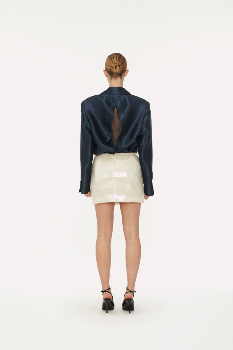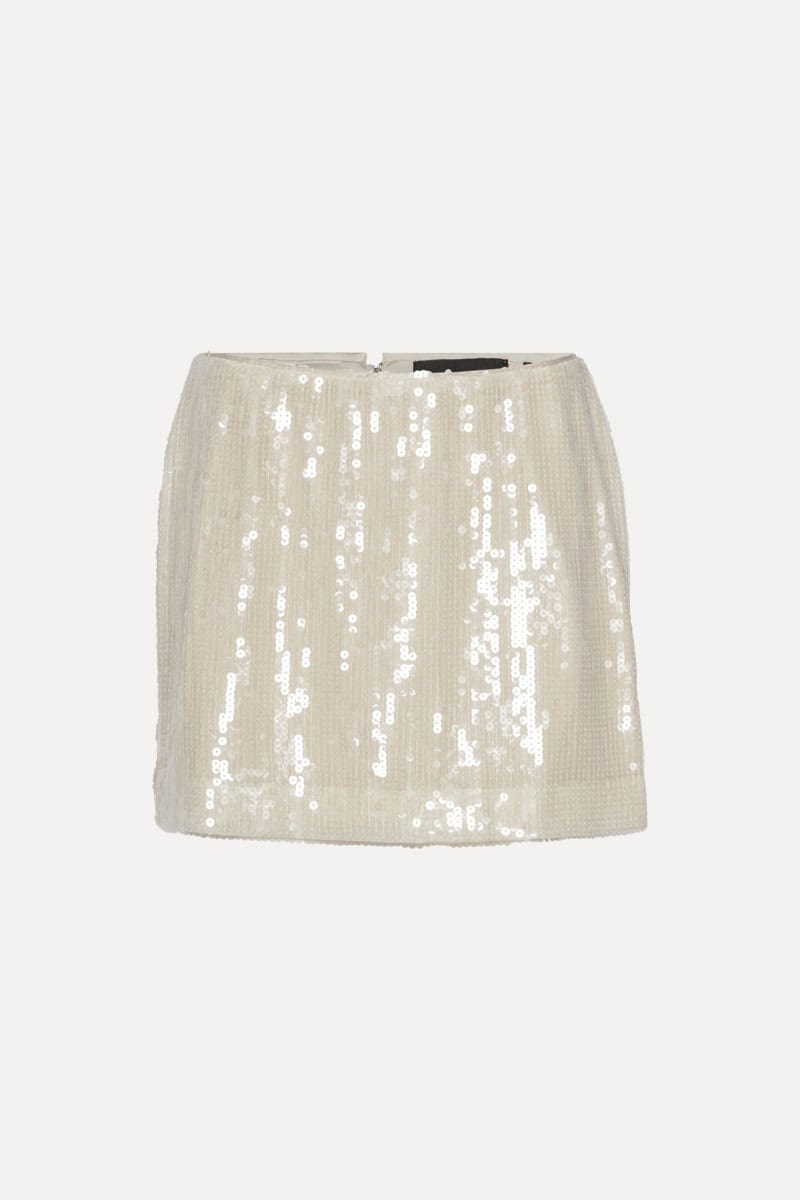 The Rotate Birger Christensen Sequin mini skirt in ecru is the perfect item to add some glamour to your outfit. The skirt is covered in transparent sequins and oversized rounded embellishments with a low waisted design and a slit in the seam for effortless charm. It can easily take you from day to night and looks equally amazing with trainers and a t-shirt as it does with heels and a fine knit jumper.