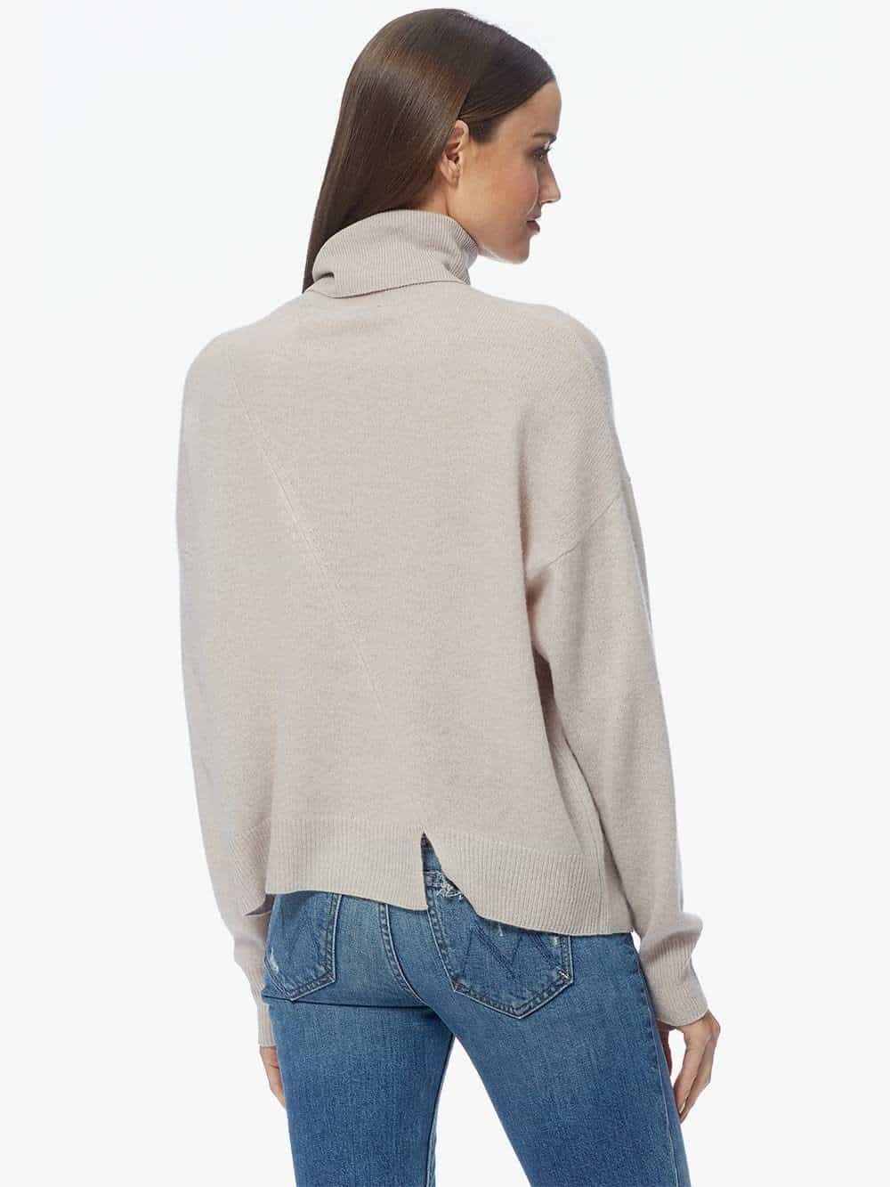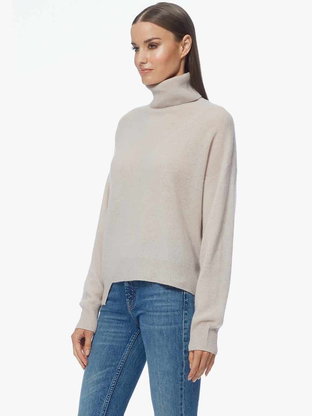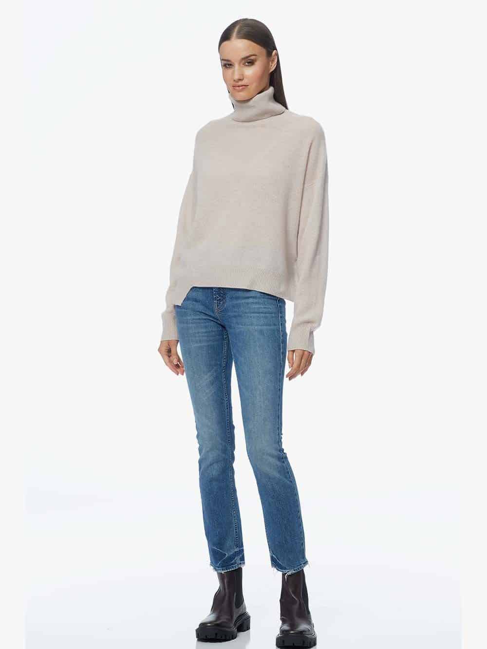 The 360 Cashmere Christine jumper in sheepskin is a stunning staple in a tonal colour perfect for elevating your outfit. The relaxed style has an asymmetrical hemline with a cut out on the back, as well as rib detailing on the cuffs, hemline and neck, and a diagonal seam on the front and back. Style it with your favourite denim for a perfect paired back look.