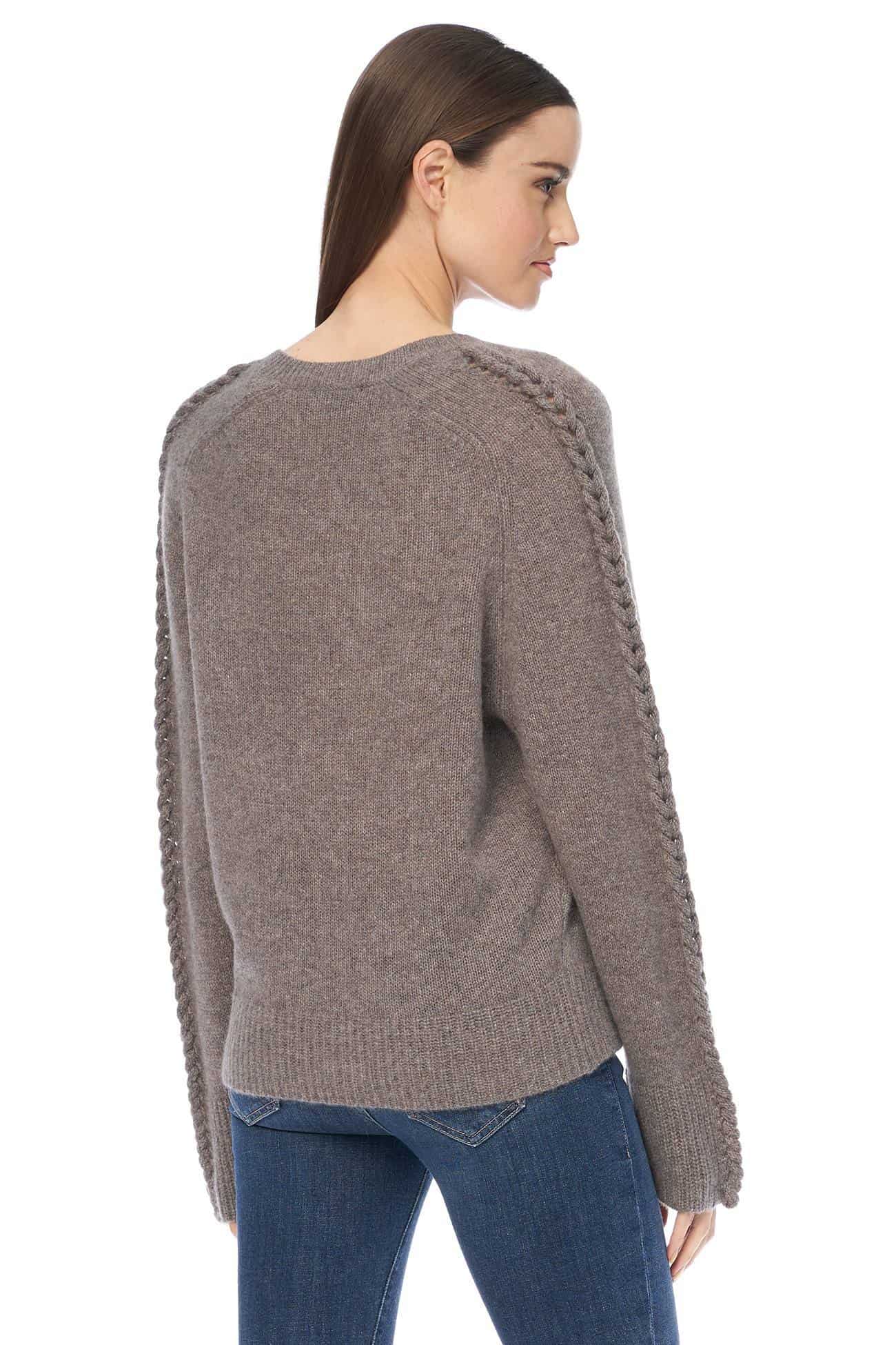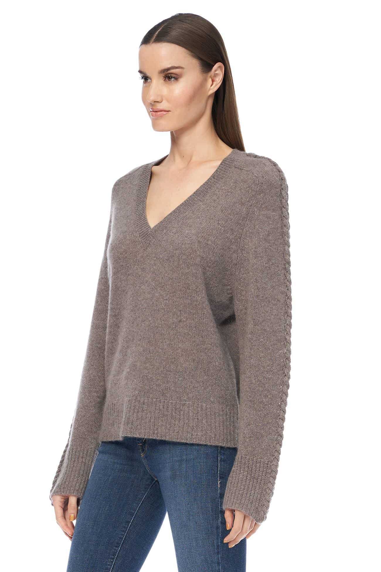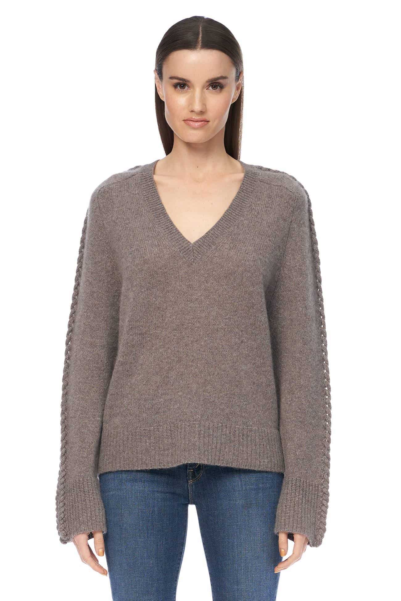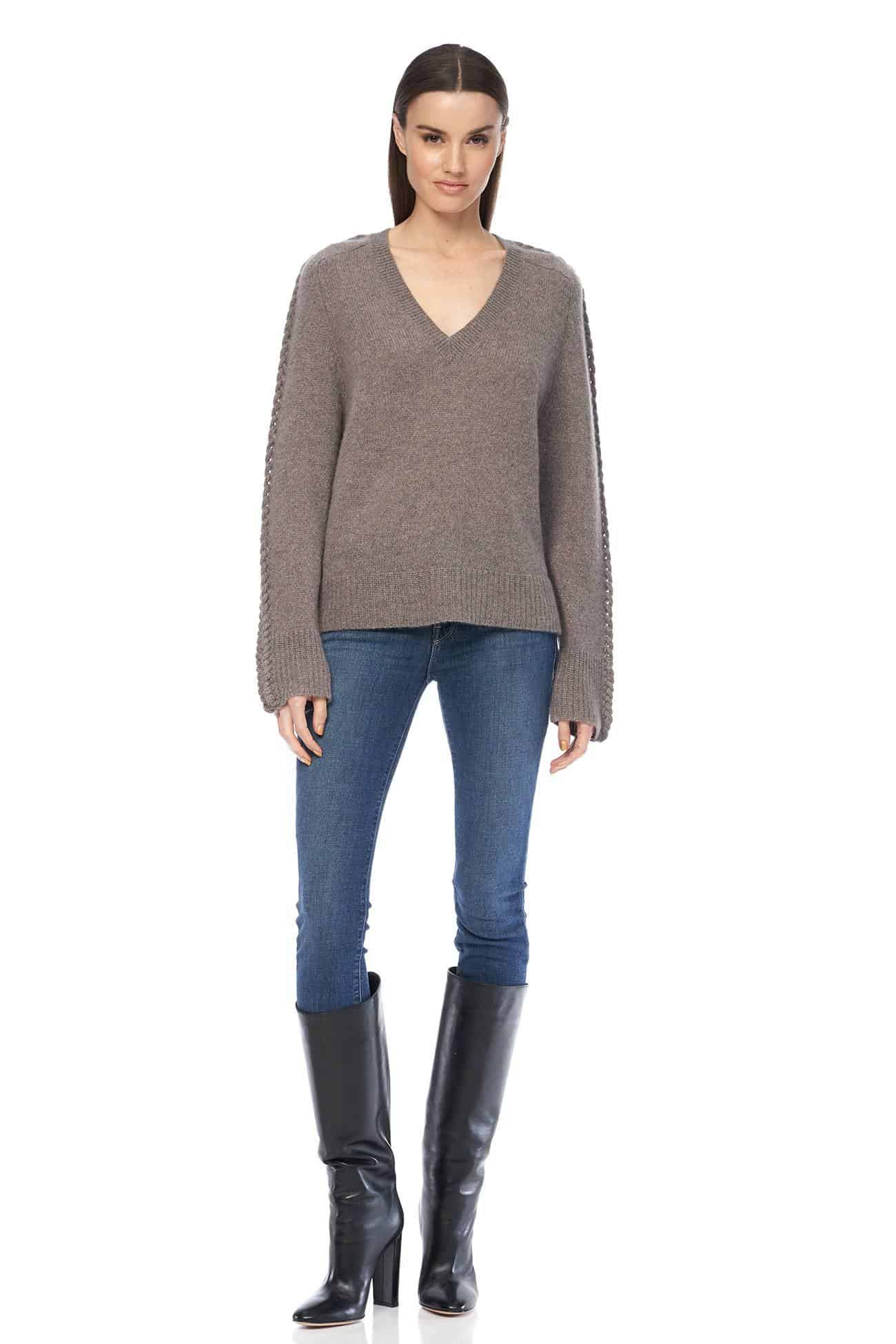 The 360Cashmere Kandice Jumper in Porcupine has a fresh take on the classic relaxed V-neck pullover. Featuring a braid detail down the sleeve as a beautiful subtle accent. Complete with wide sleeves and rib trim detailing.