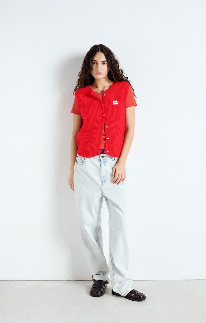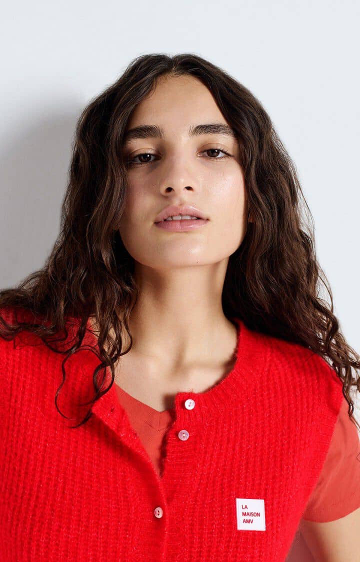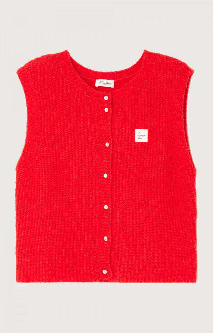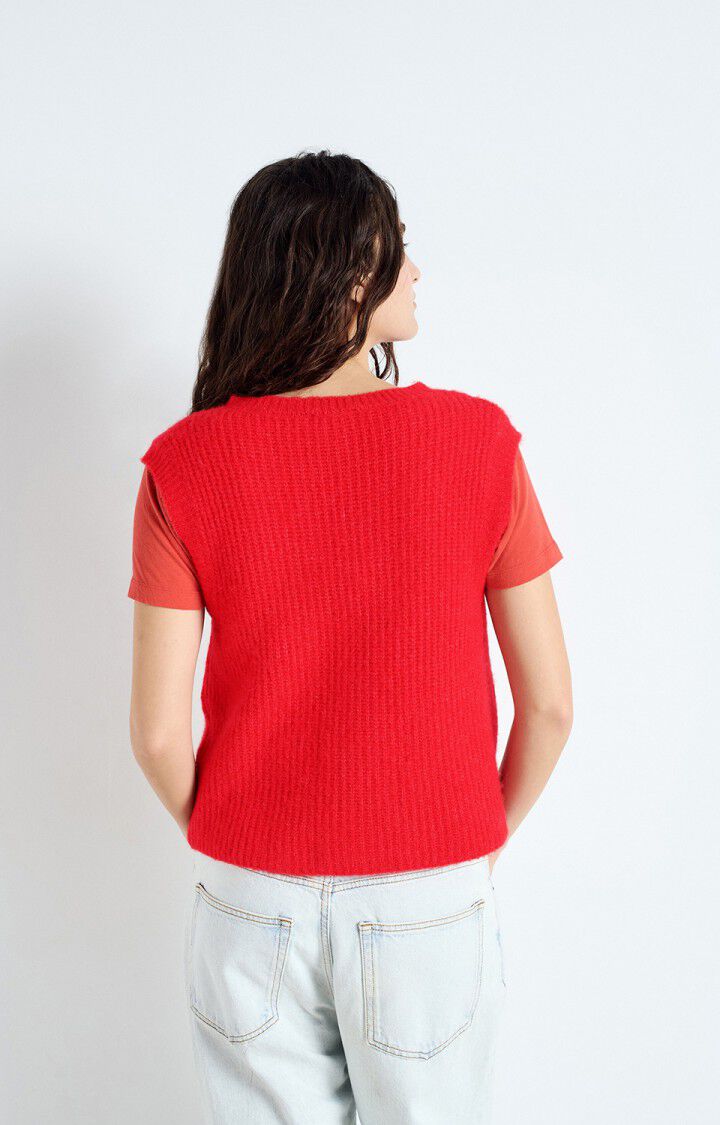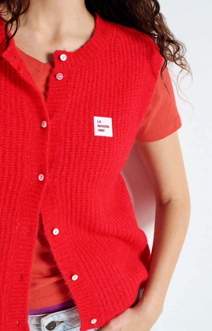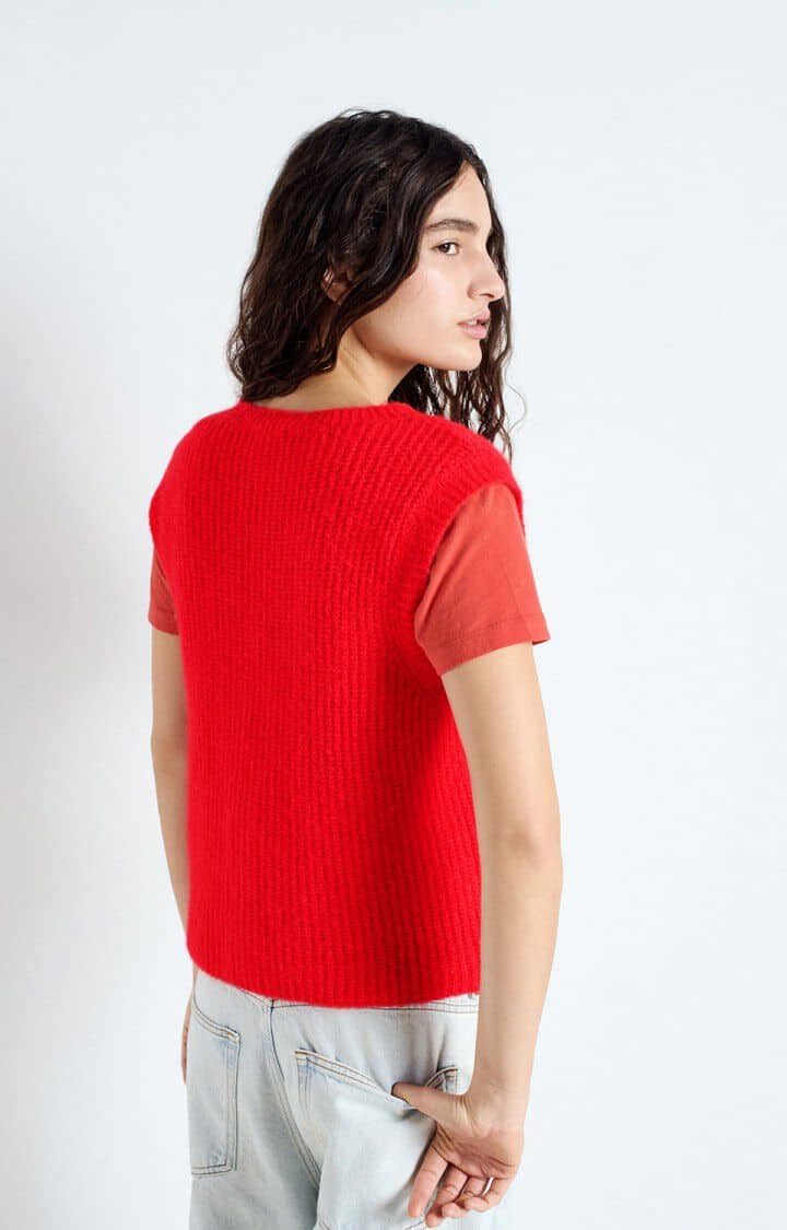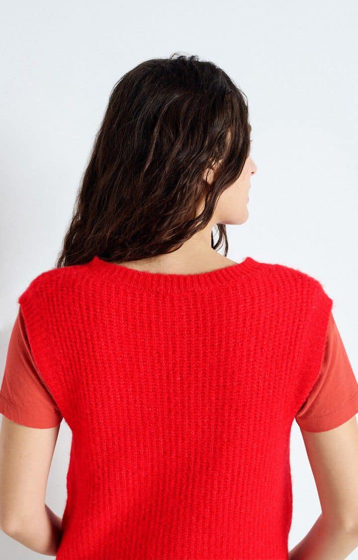 The American Vintage East sleeveless vest in melange pepper is the perfect piece of knitwear to layer over t-shirts when it gets that bit cooler. In the gorgeous statement red colour,this vest adds colour to your casual outfits and looks amazing when teamed with blue denim or leopard print trousers.