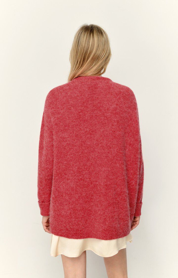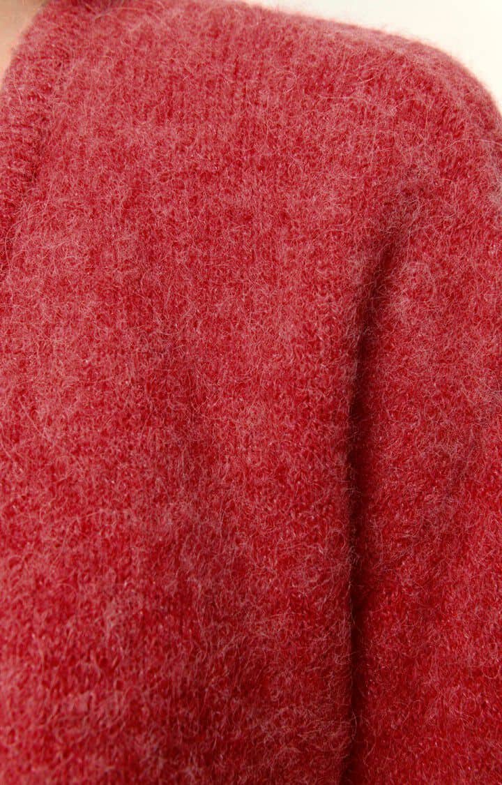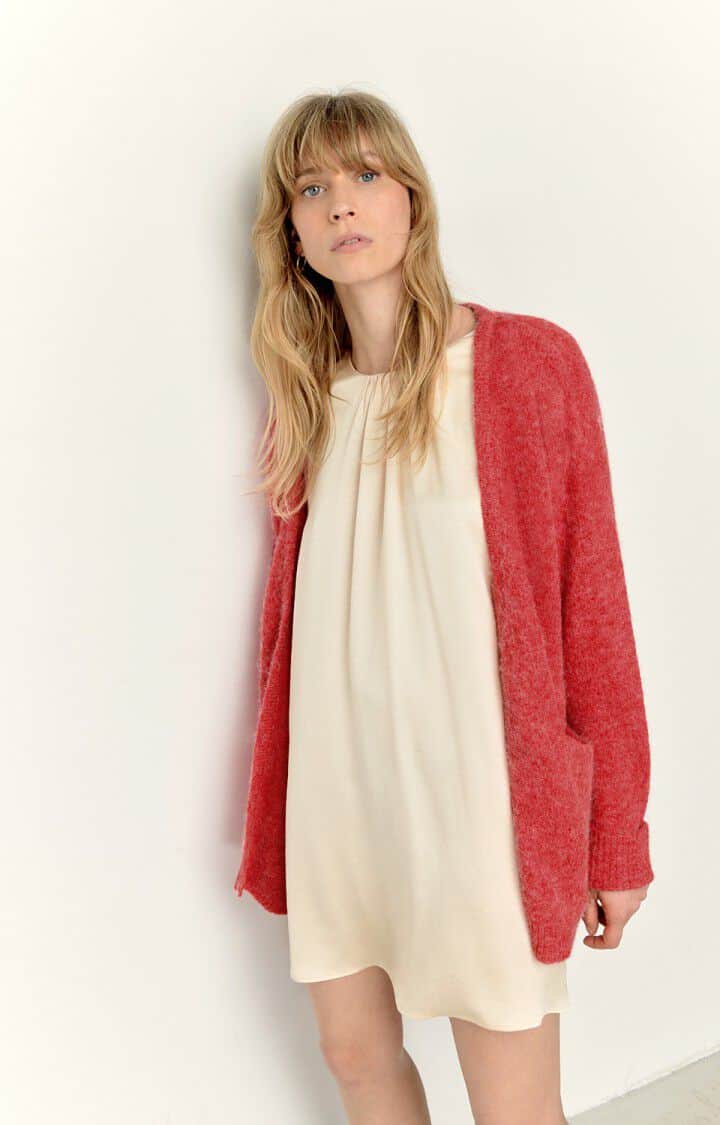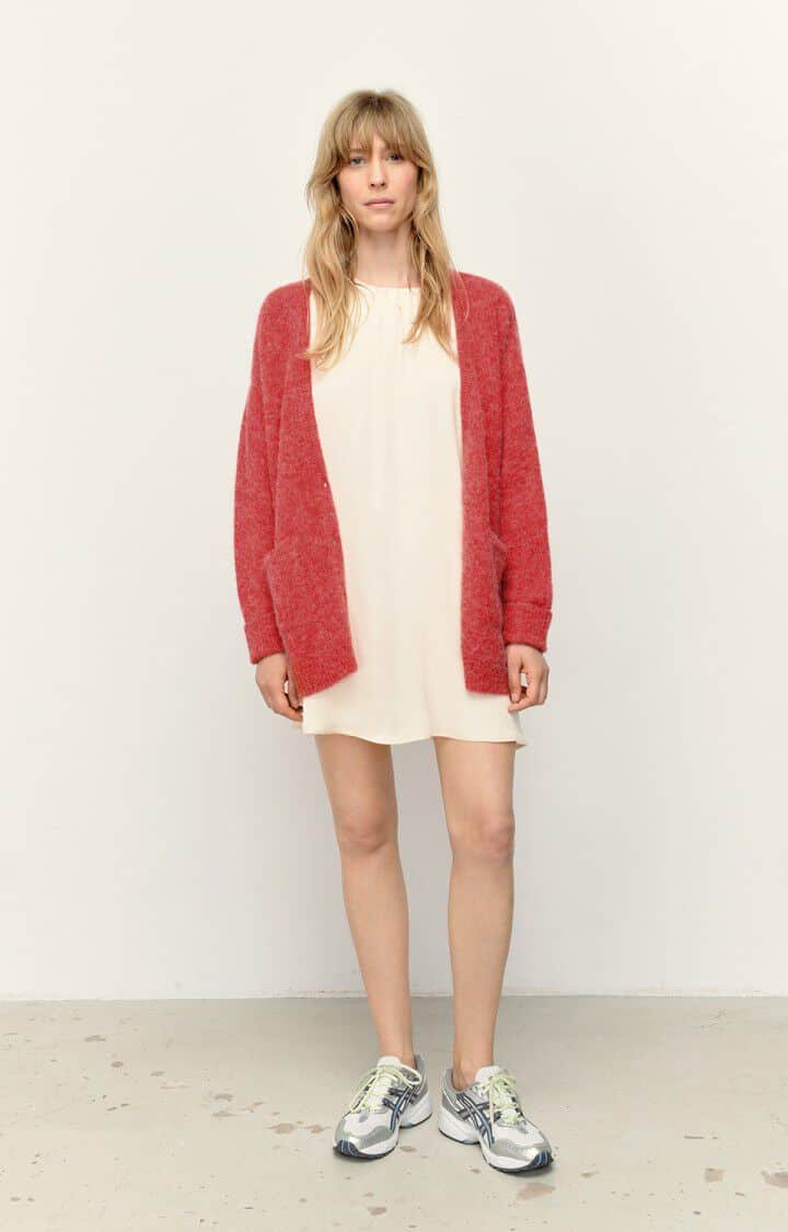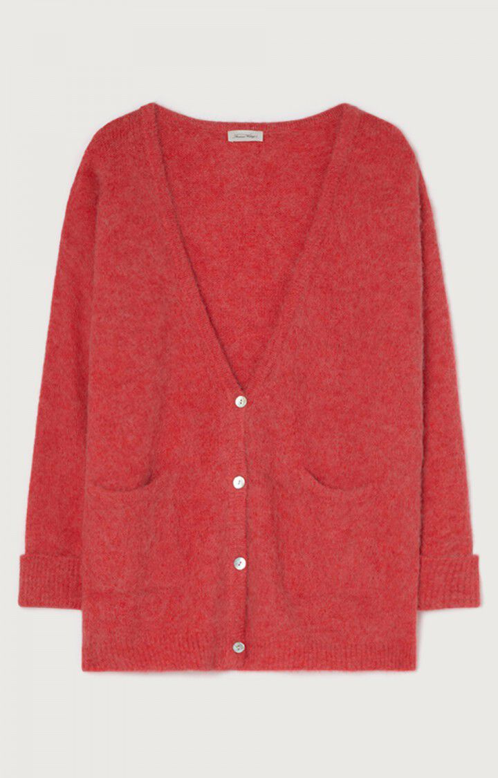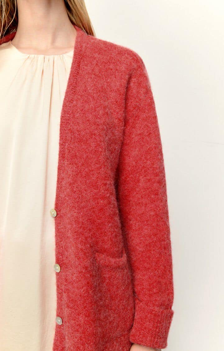 The American Vintage EAST19E cardigan in strawberry melange is a gorgeous cardigan made from ribbed, soft alpaca blend yarn in a subtly heathered strawberry red colour. The relaxed fit and lowered shoulder seams perfectly match the brand's laid-back aesthetic. Featuring buttons down in a luxurious mother-of-pearl.