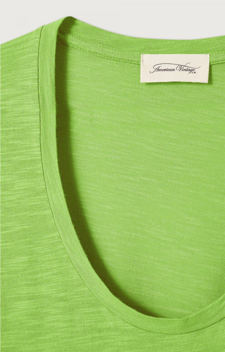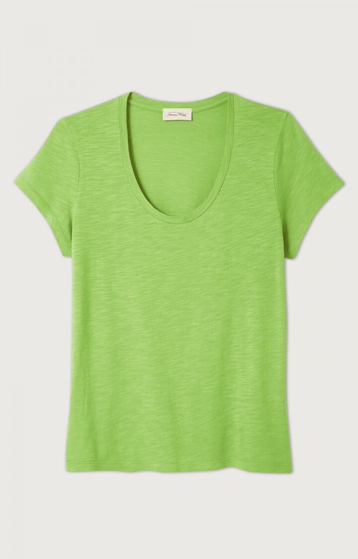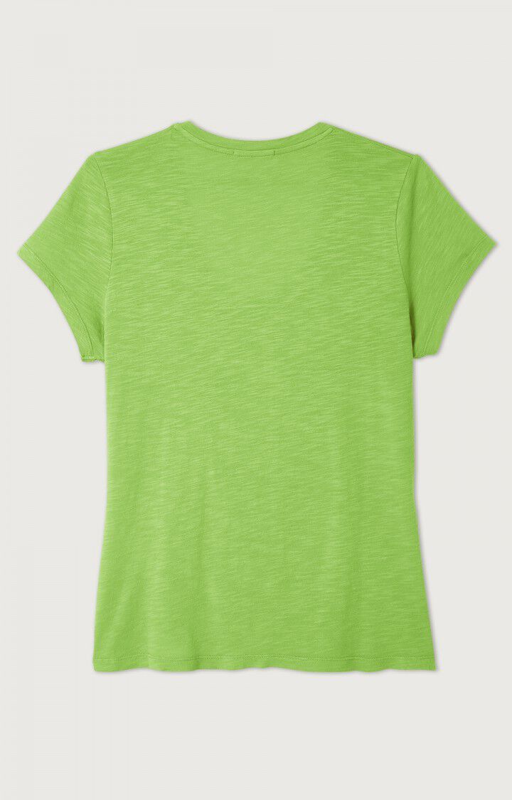 The American Vintage T-Shirt in granny smith apple features a flattering V-neckline and short sleeves. The organic cotton makes this top super comfortable to wear and the cool and bright colours are a season must have.