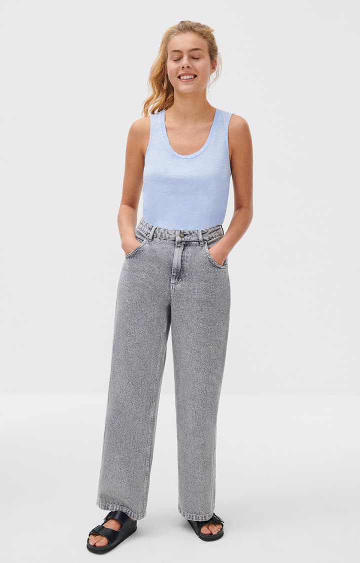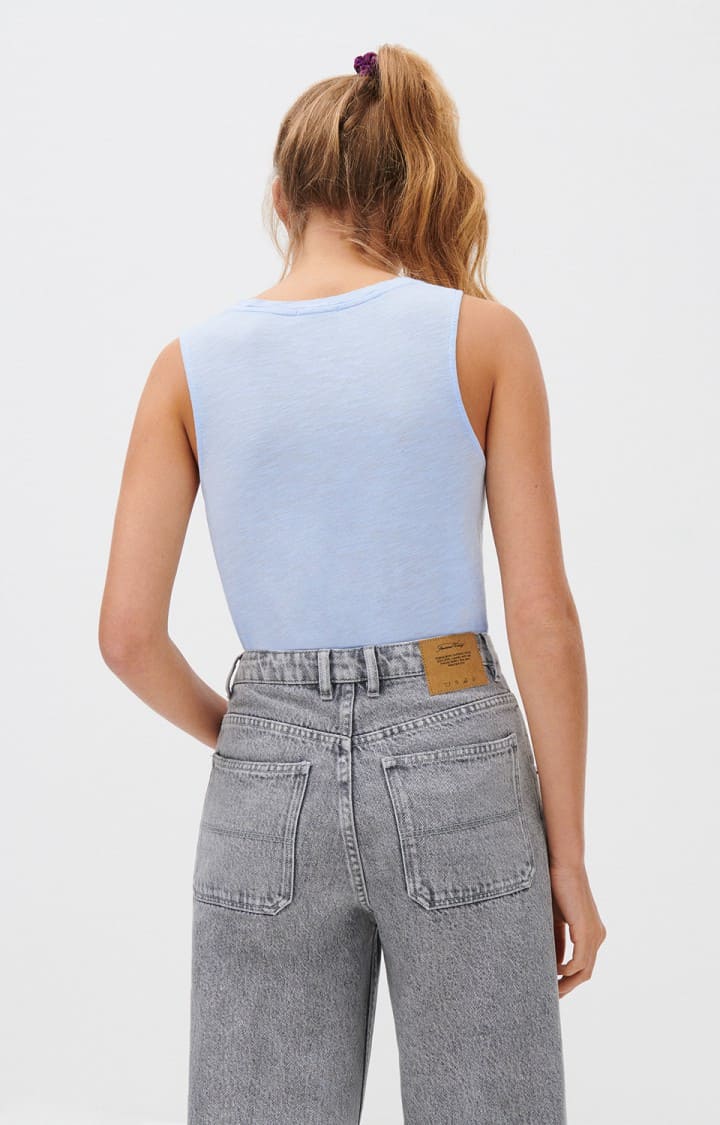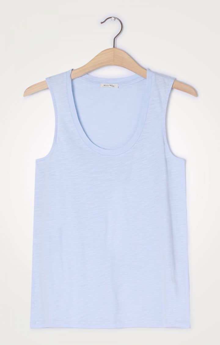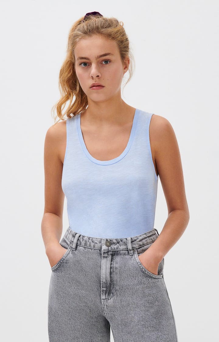 This American Vintage JAC47 Jacksonville tank top in vintage blue sky is a must have for any summer wardrobe. Made from a soft slub cotton and viscose blend this scoop neck tank is perfect for layering or wearing with high waisted jeans.
