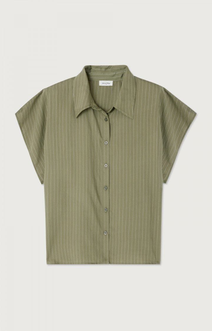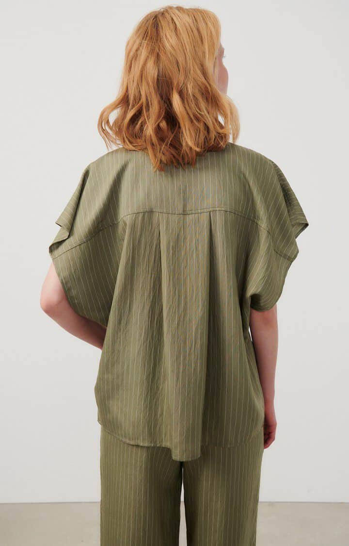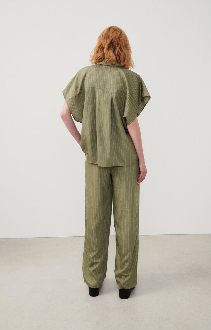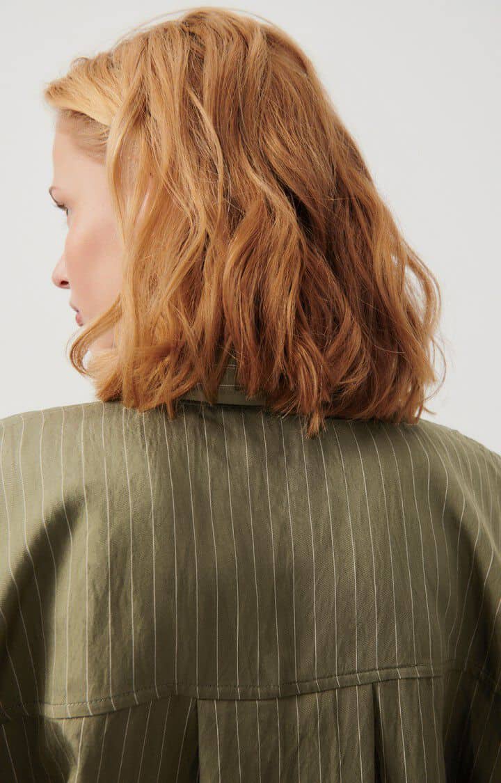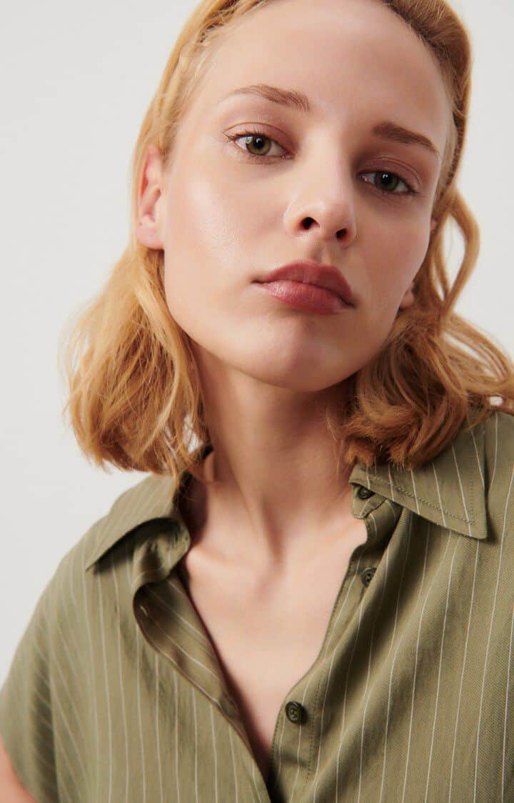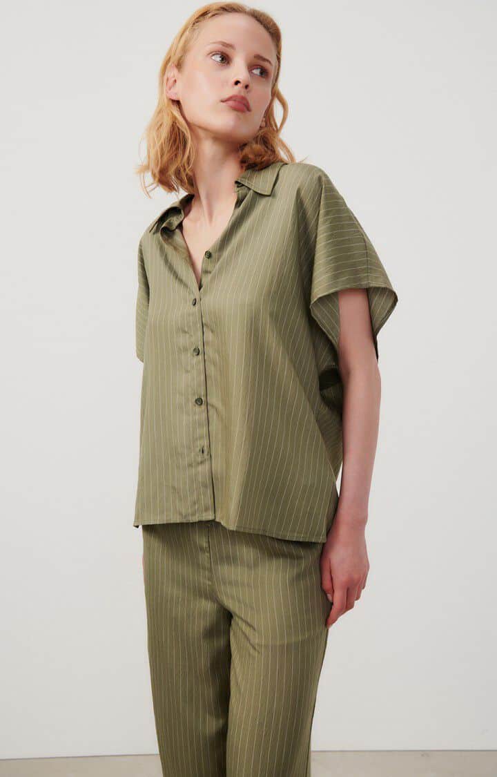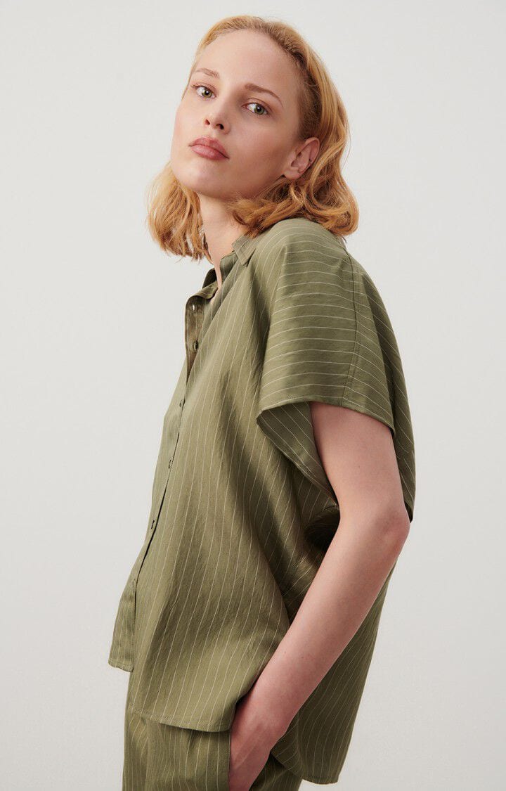 The American Vintage Okyrow shirt in olive stripes is a stylish short sleeve shirt. The shirt has cream stripes on an olive background and can be worn open or fastened depending on the look that you want to achieve. Style with the coordinating American Vintage Okyrow Trousers Olive Stripes and sandals for an effortlessly stylish look.