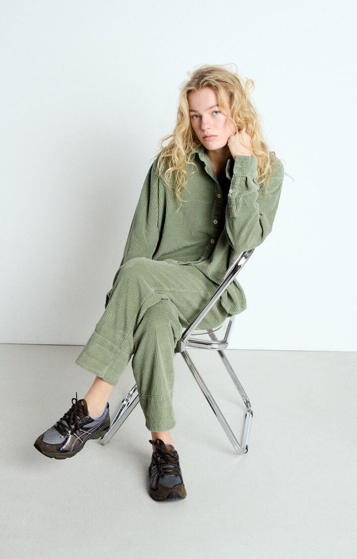 The American Vintage Padow cord trousers in vintage shore are made from the brand's iconic corduroy. They have a loose fit, elasticated waist and a carrot leg shape, making them the perfect combination of style and comfort. Style them with a t-shirt for a cool day look or wear with the American Vintage Izubird sweater for the perfect casual style.