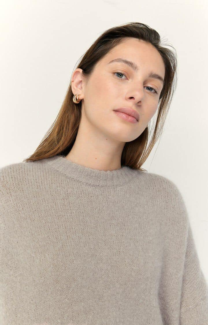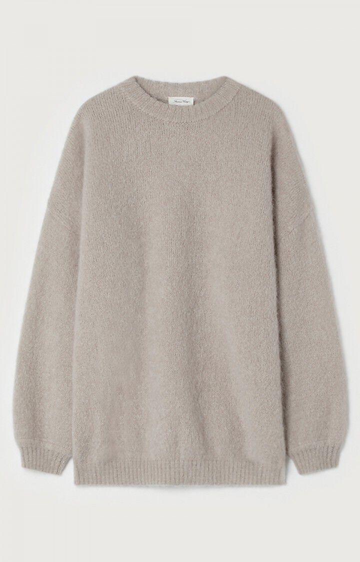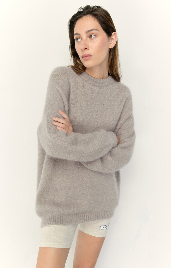 The American Vintage Pinoberry Lama Jumper is a gorgeous a fluffy beige knitted jumper with a round neck and long sleeves. Slouchy and oversized this neutral brown pullover has dropped shoulders and ribbing on the cuffs and hem.