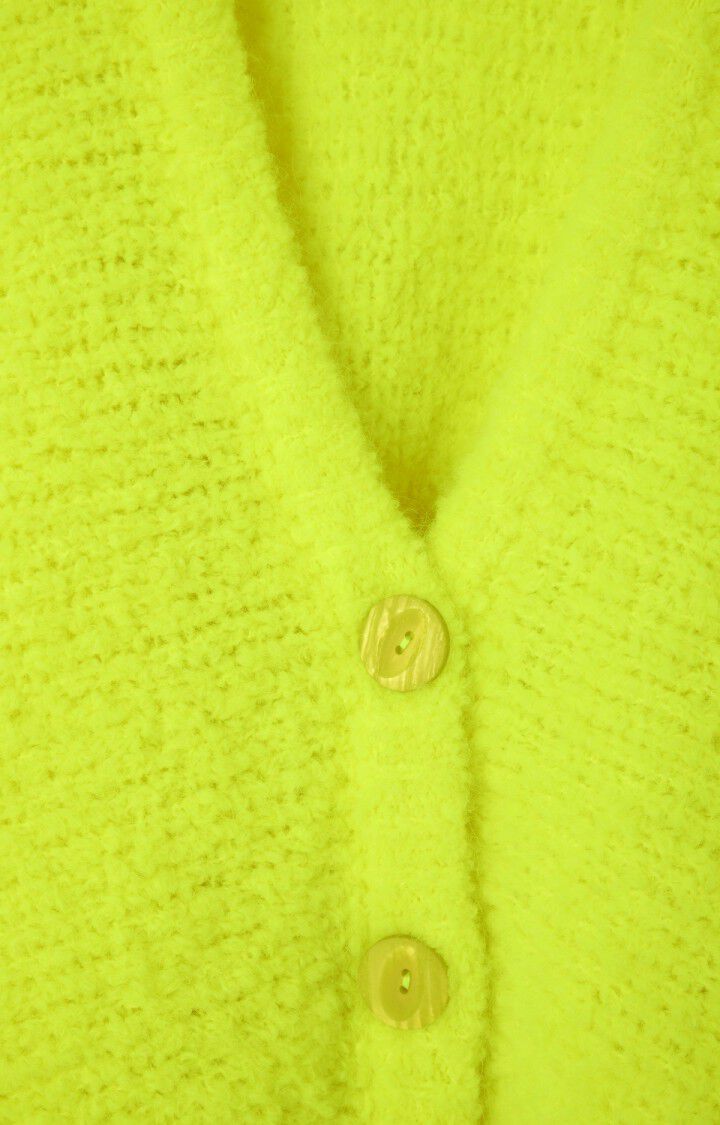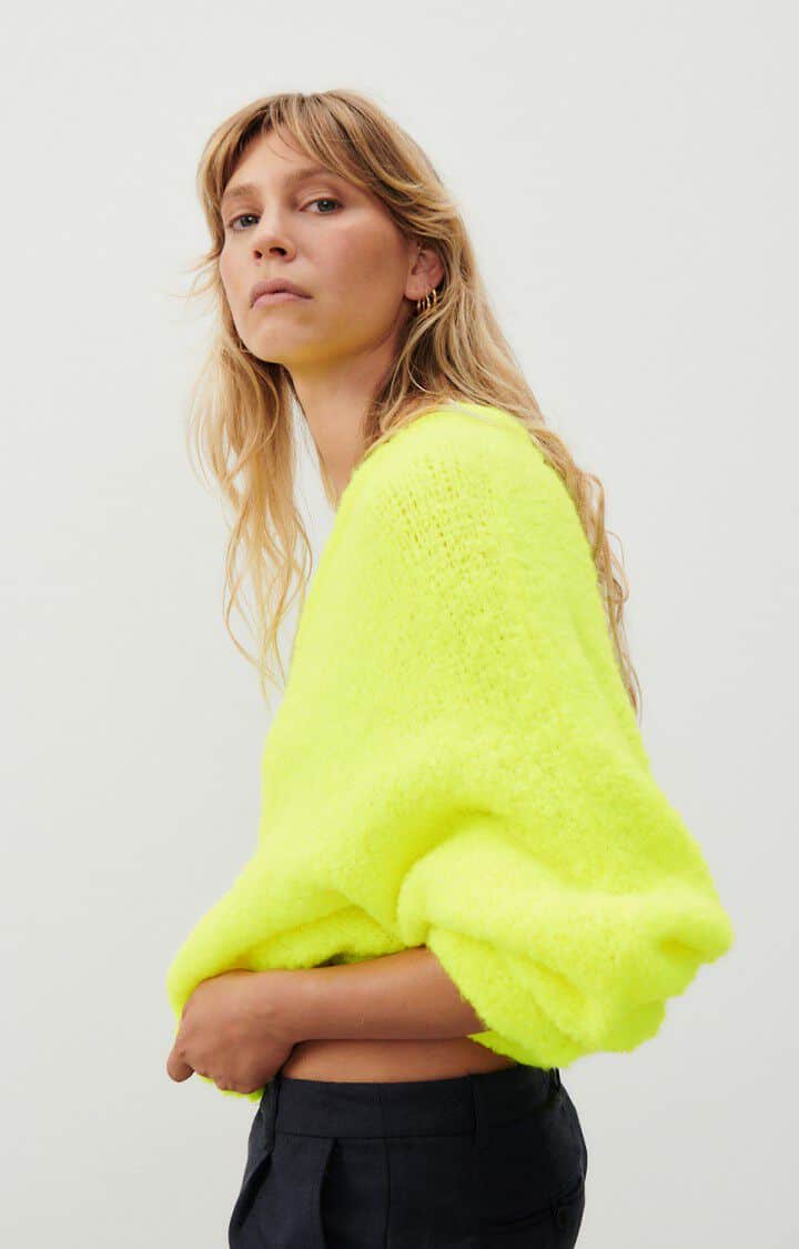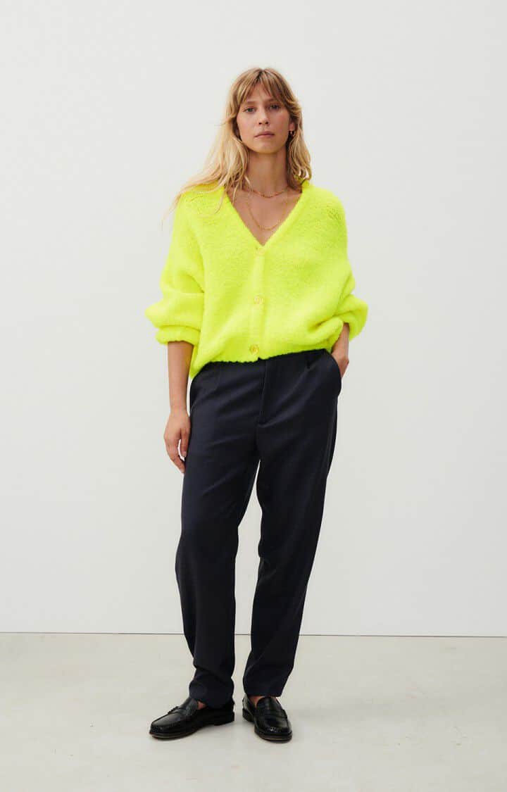 The Zolly Cardigan fluorescent yellow is a cosy essential in a new statement colour. While the silhouette of style Zolly is inspired by that of the classic V-neck button-up cardigan, the oversized fit with extra-long batwing sleeves and a slightly cropped length gives it a contemporary vibe. Made from a medium-weight wool blend knit with bouclé yarns: a texture that adds an extra dimension to every look. Style over dresses or paired down with Fabienne Chapot Blake Loose Tapered Vintage Blue