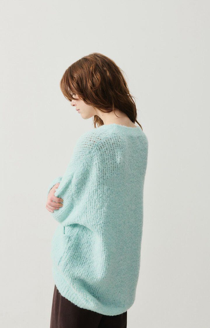 The American Vintage Zolly Cardigan Ice Cold Glacial Ice Cold with its cuddly knit, is perfect for adding a touch of comfort and warmth to your wardrobe. Its fluffy knit is both light and soft, creating a feeling of well-being while adding a cosy dimension to your outfit in a fluffy textured boucle-style knit.