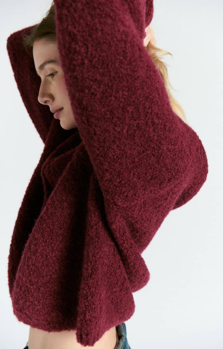 The American Vintage Zolly Cardigan in Pomegranate Melange, this season’s colour, is the ultimate cosy-chic knit. Crafted from a soft, luxurious blend of wool, alpaca, and synthetic fibers, it offers warmth, comfort, and a beautifully textured finish.