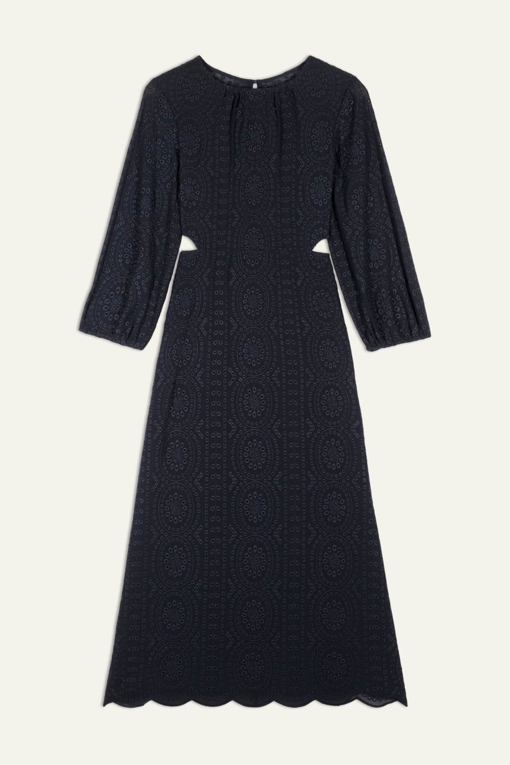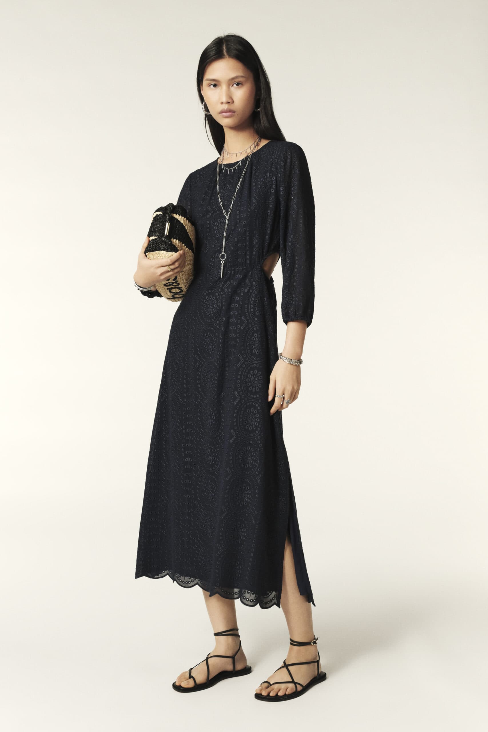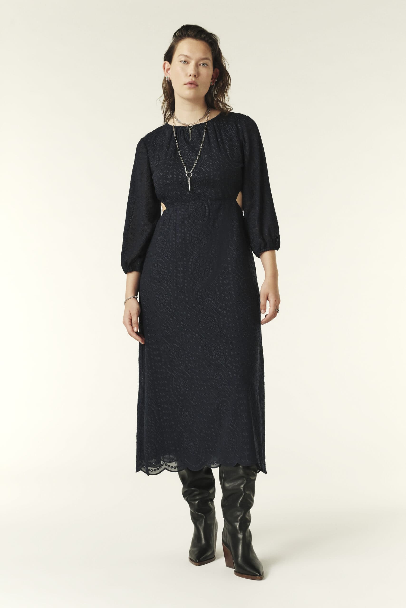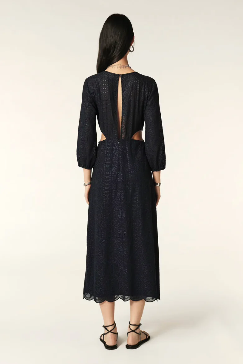 The BA&SH Bettina Dress Marine has a 70s feel. This midi-length design in broderie anglaise fabric features a striking cut-out at the waist and a slit at the back for an ultra-glamorous look. With its fluid, elegant cut, this chic dress is perfect for a wedding, garden party or a cocktail reception. Style it with a scarf in your hair, big sunglasses, a stack of bracelets and flat sandals.