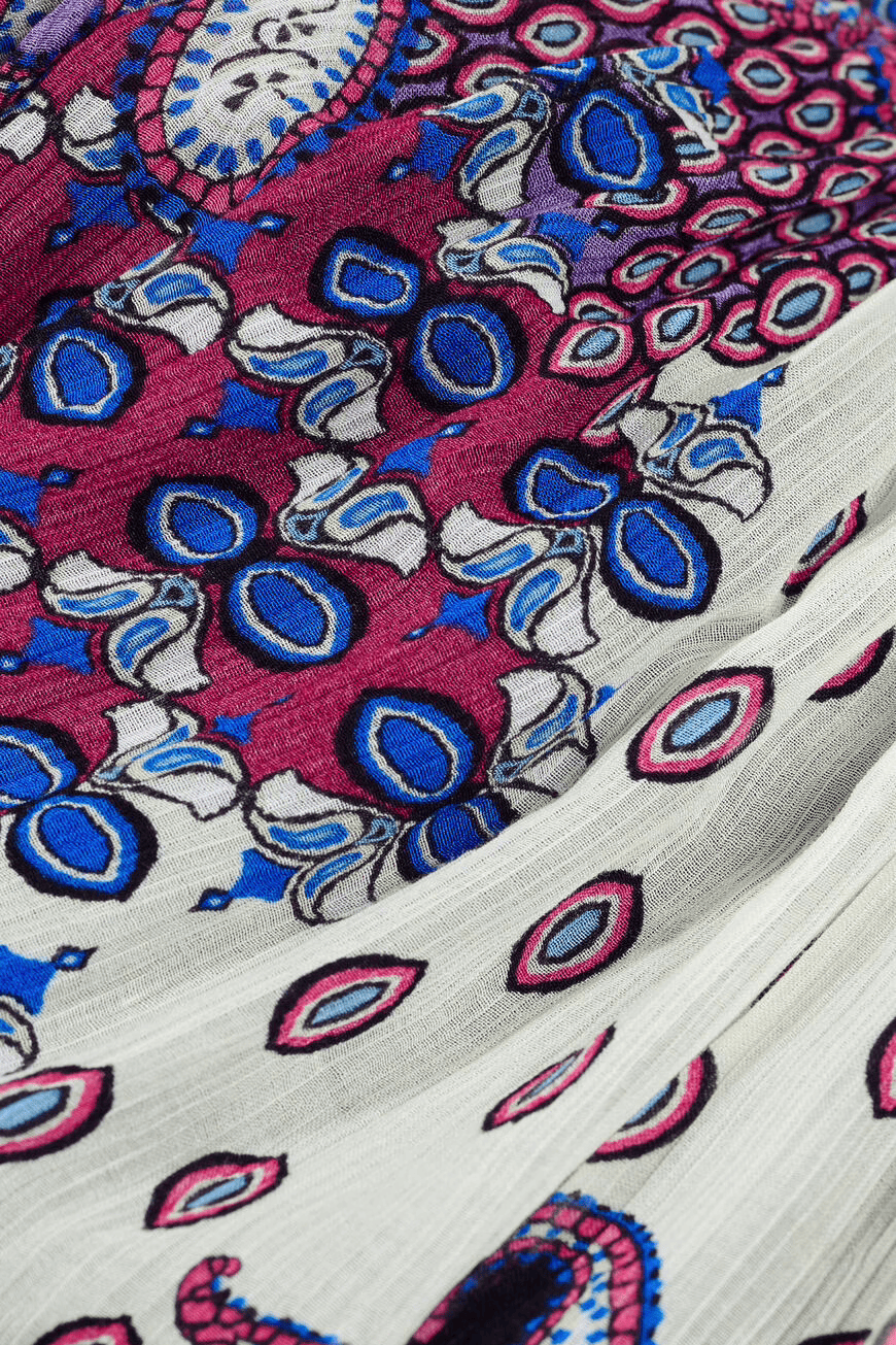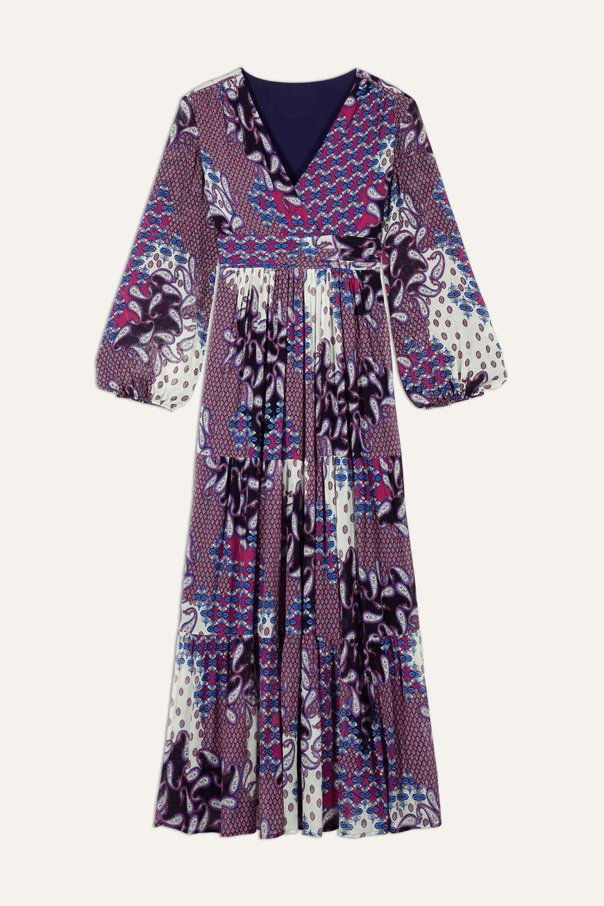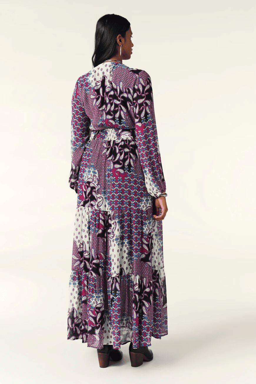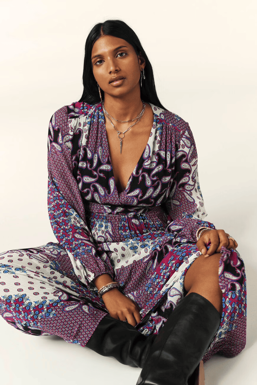The BA&SH Bossy Dress Violet is a beautiful violet printed Bossy maxi dress from Ba&sh. This dress is perfect for an event or holiday as can be styled with accessories as you wish. The dress features a v-neck cross over top with loose long sleeves, a long floaty tiered skirt and is completed by an integrated belt with smocked back. The viscose in this garment is made from wood pulp sourced from sustainably managed forests.
