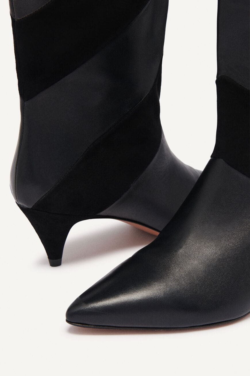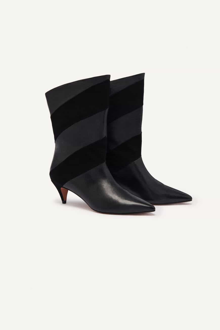 The BA&SH cutty boots in black are a beautiful material mix design. Wide strips of leather and suede alternately offer a stunning appearance and matrix vibe. They are ideal for a professional look because of their short heel and pointed toe but are also great for a night out. We adore the angled ankle cut, which will definitely draw attention! Wear them with form-fitting pants to highlight their amazing features.