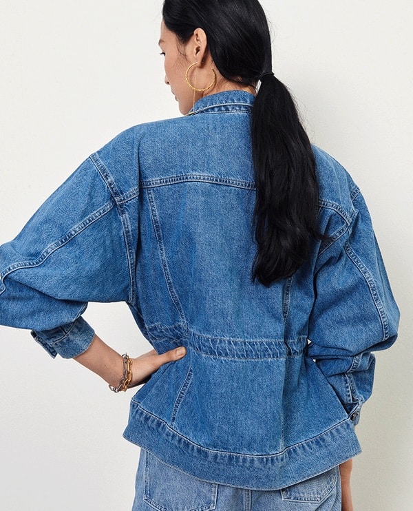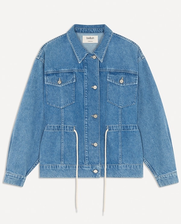 BA&SH Mandie dress with the sleeves rolled up.\n\n<ul>\n<li>Long sleeves</li>\n<li>Collar</li>\n<li>Tie belt at the waist</li>\n<li>Loose fit</li>\n<li>Metal button front fastening</li>\n<li>100% Cotton</li>\n<li>Machine washable</li>\n</ul>"}" data-sheets-userformat="{"2":769,"3":{"1":0},"11":4,"12":0}">The BA&SH Edson denim jacket in light used blue is a gorgeous boxy fit denim jacket with a drawstring tie at the waist to give it a more cinched in look when required. The relaxed fit is perfect for throwing on over dresses and looks amazing for a full denim look when teamed with your favourite jeans. Whether you wear it fastened or open, this is a stylish piece that you will wear again and again. For the perfect look, wear open over the BA&SH Mandie dress with the sleeves rolled up.