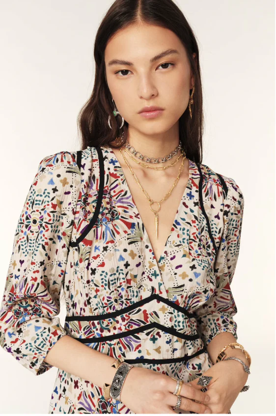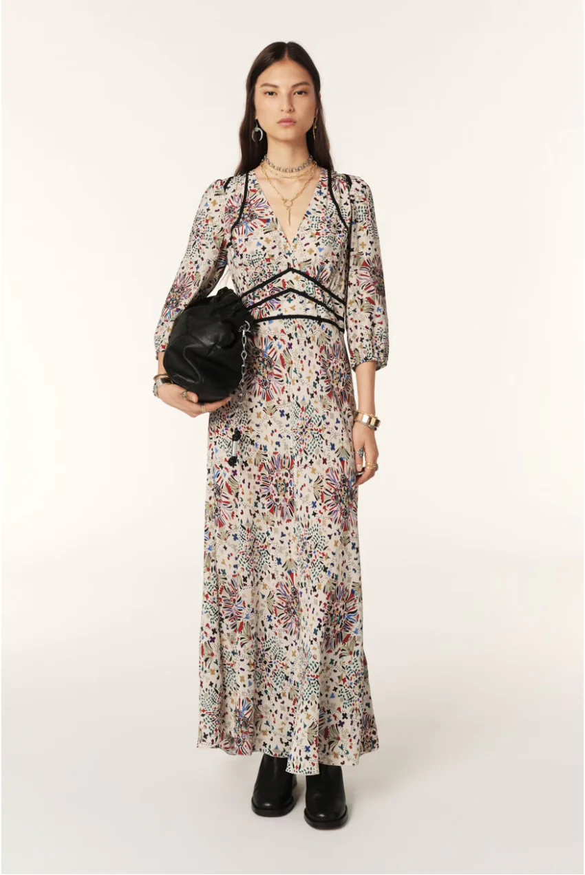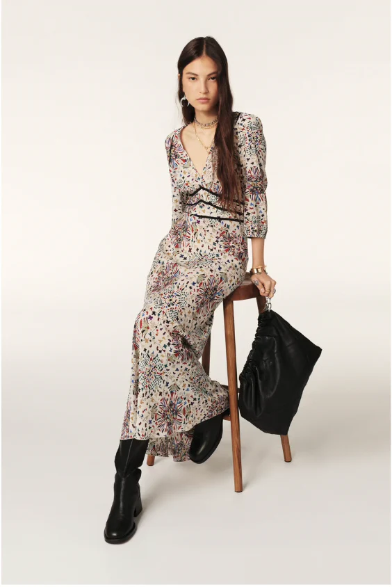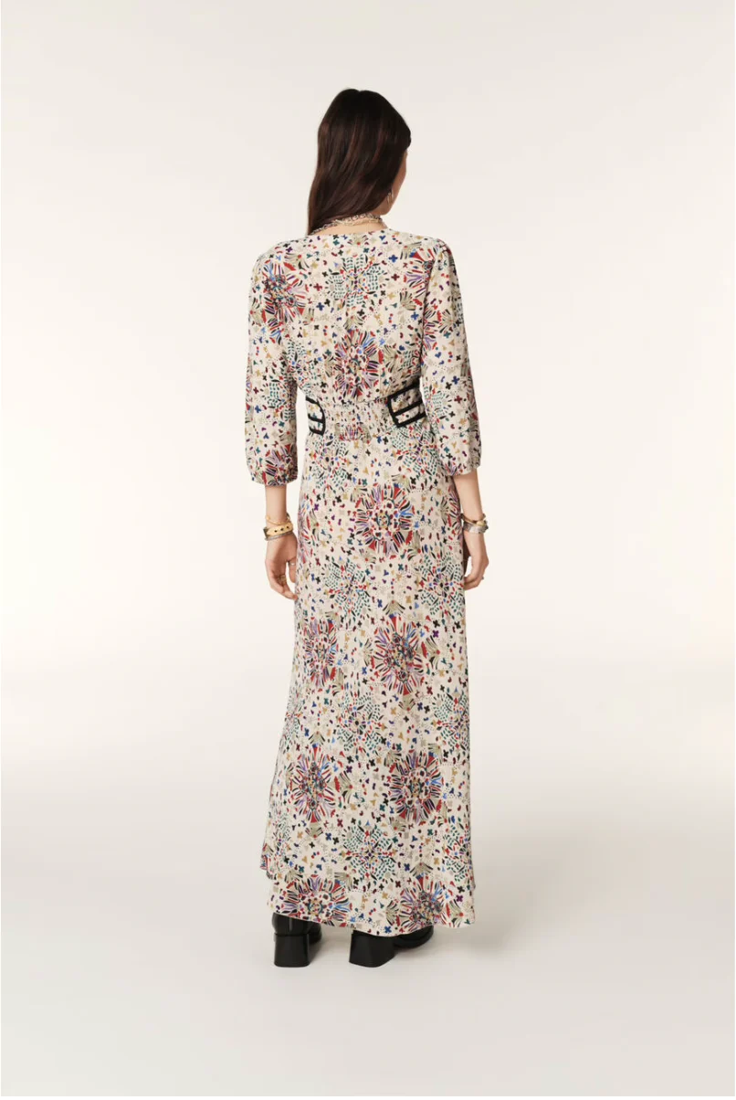 The BA&SH Fazia Dress Beige is a stunning new arrival for Autumn Winter 24. A classic ba&sh style that features and all over graphic print in multi colours on a beige base, this dress has a deep V neckline with a corset style detail under the bust. Created with a shirred panel at the rear waist for comfort, the bias cut skirt then falls to a midaxi length which looks as good worn with a chunky boot as it does with a heel. Dress yours up with layered jewellery and a clutch for a night out, or throw over a chunky knit.