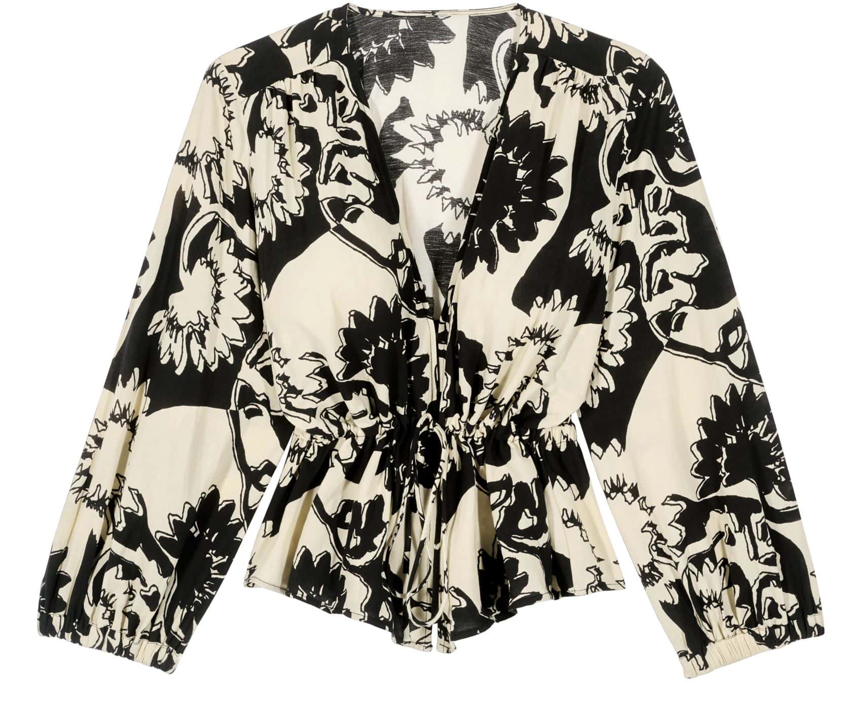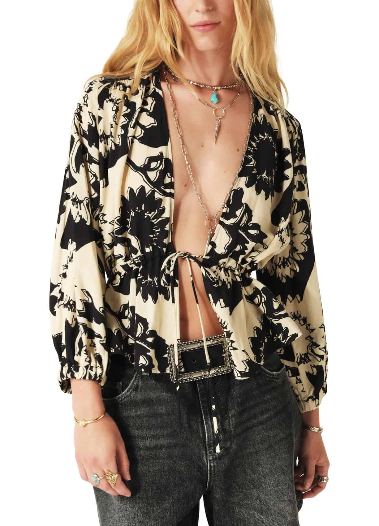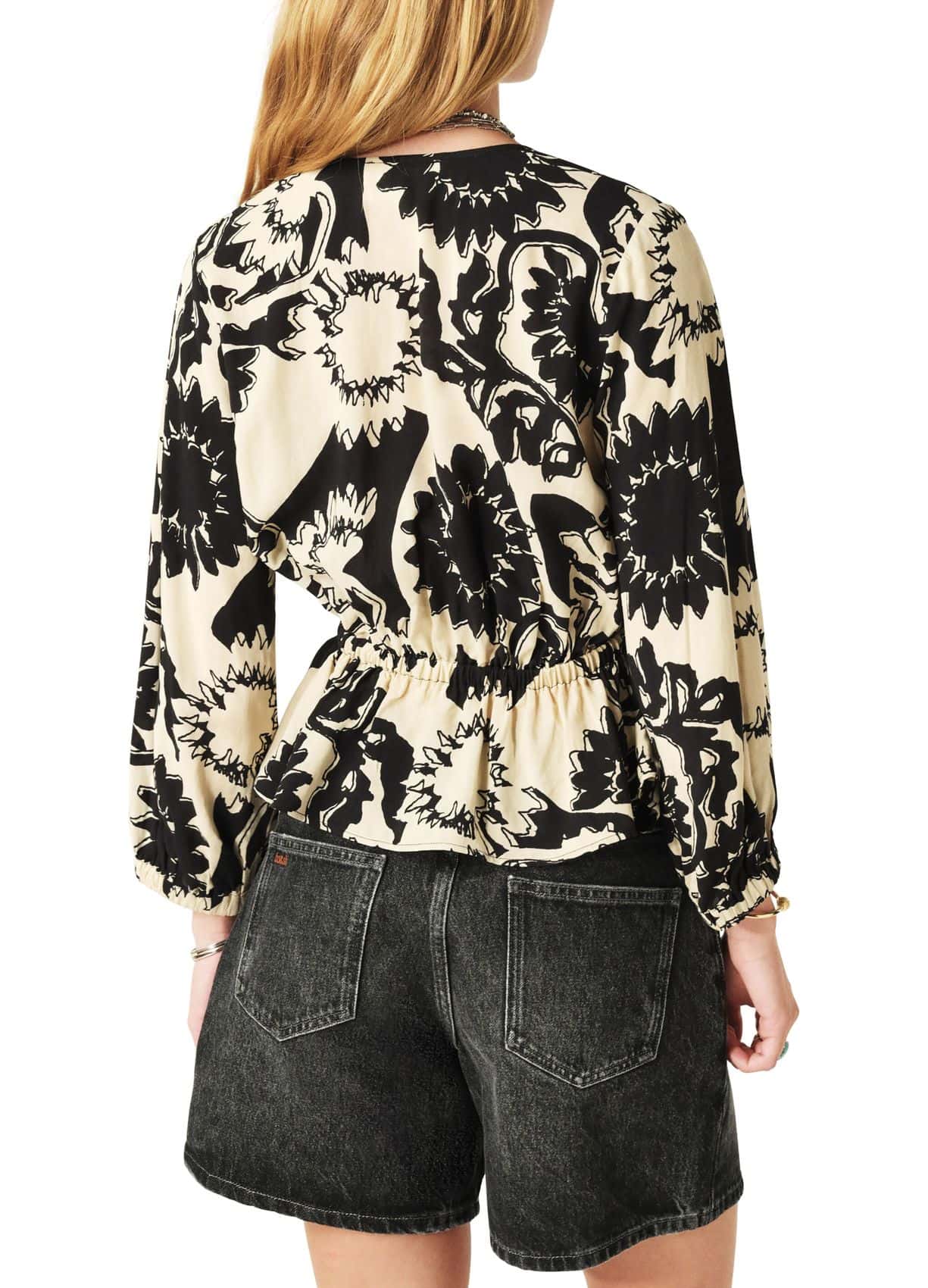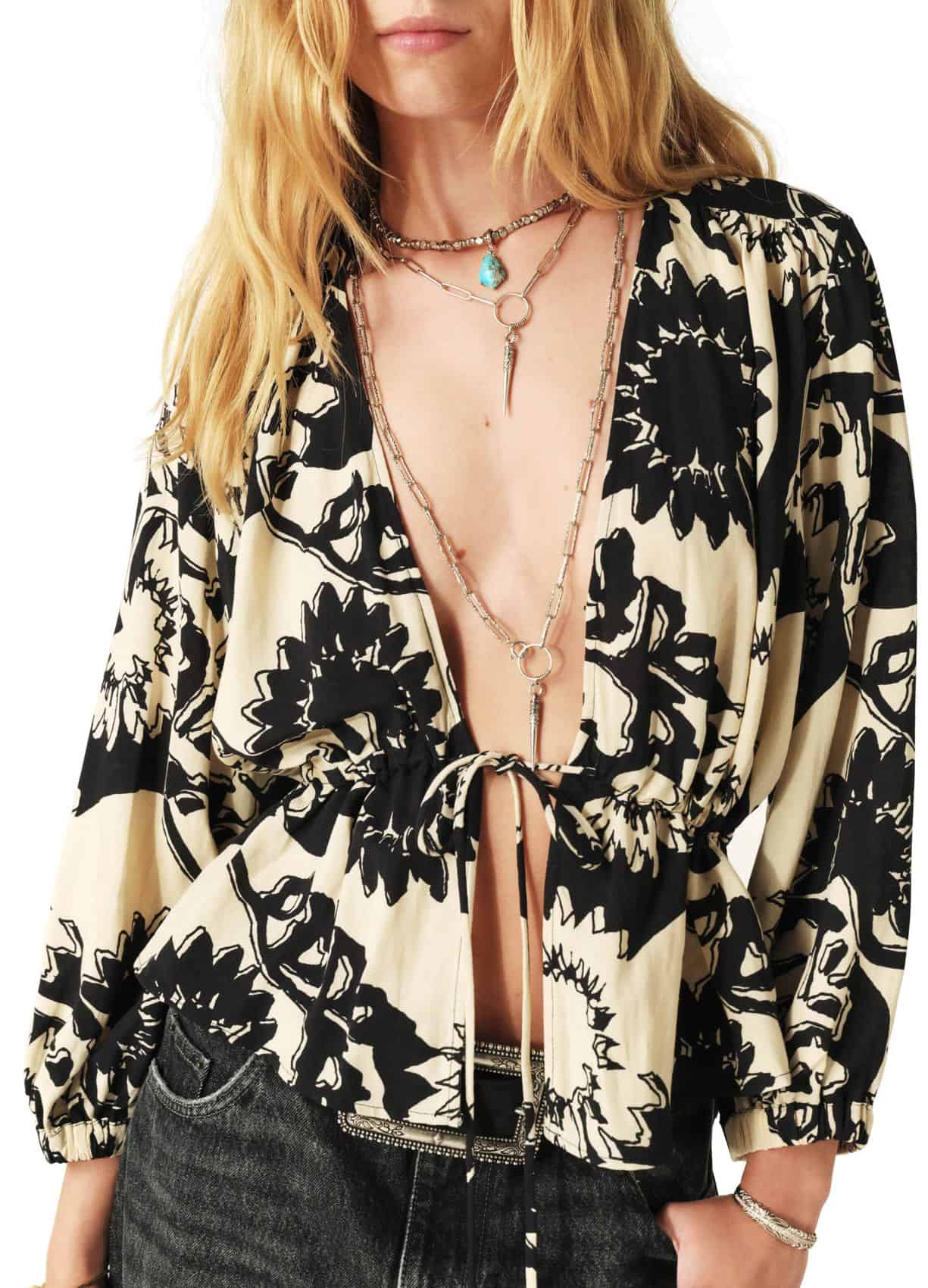 The BA&SH Filea Blouse Black is the perfect party season top. Made from a bi-material with long-sleeved, plunging neckline and all-over floral print. Turn heads in this versatile piece, style with denim and boots for a daytime look or dress up with a maxi skirt and heels.