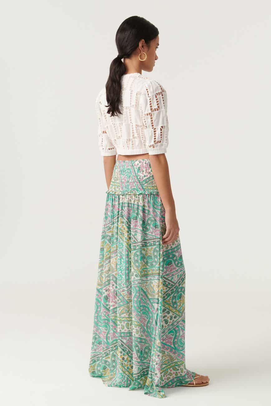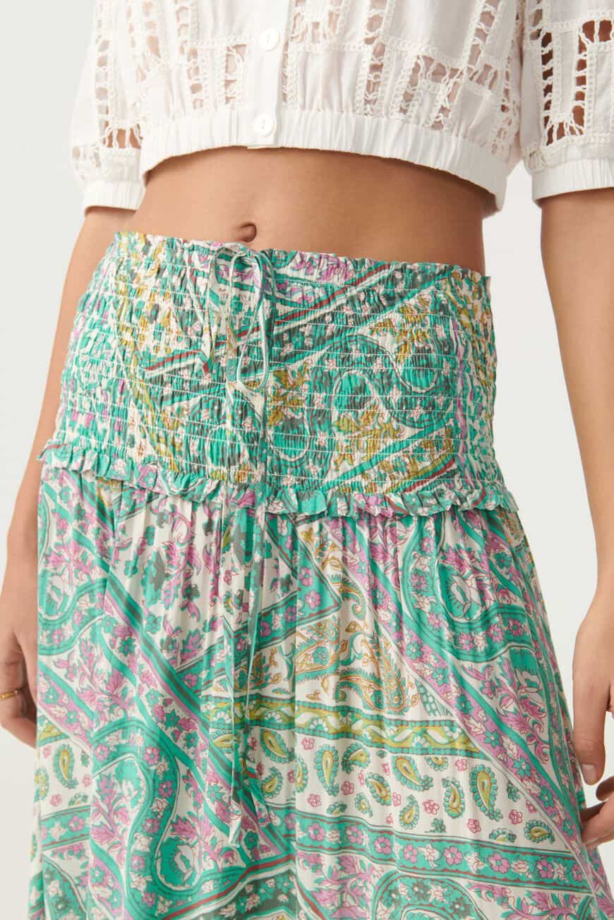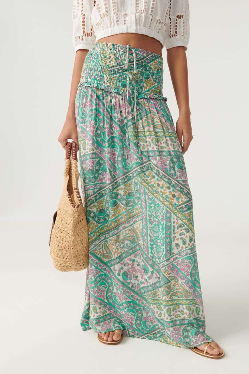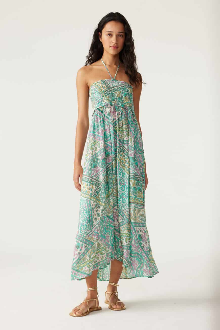 The BA&SH Friska Dress Vert is the dress that can do both! This strapless dress with a shirred bust is amazing- it also has ties to fasten around your neck so it stays perfectly in place. It is highly comfortable and sways as you move, so every step you take is accentuated. The cherry on top? Move your midi dress down to your waist and it becomes a maxi skirt! Pair this incredible dress with your most beautiful heels to create an unforgettable look. This style contains viscose from sustainably managed forests.