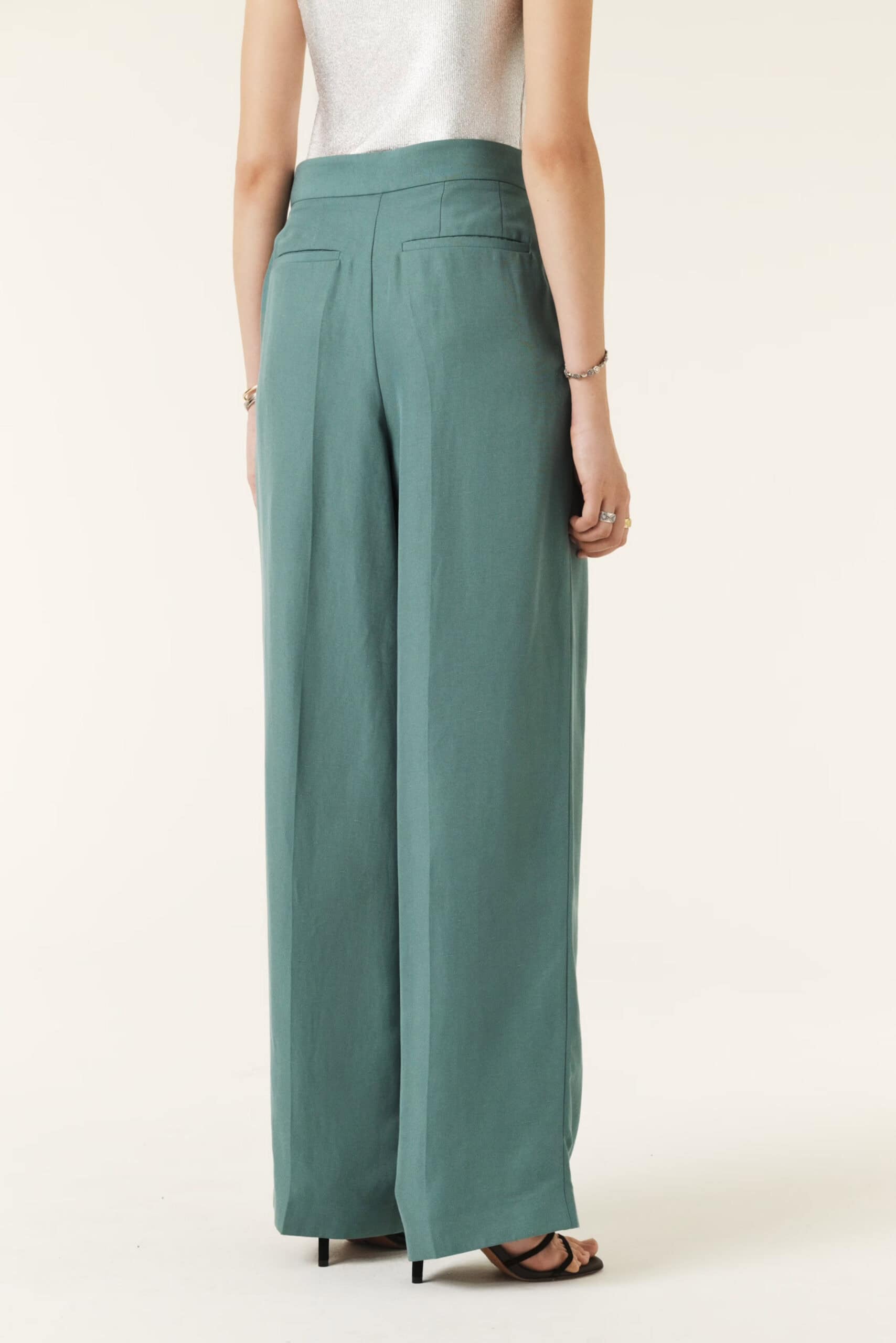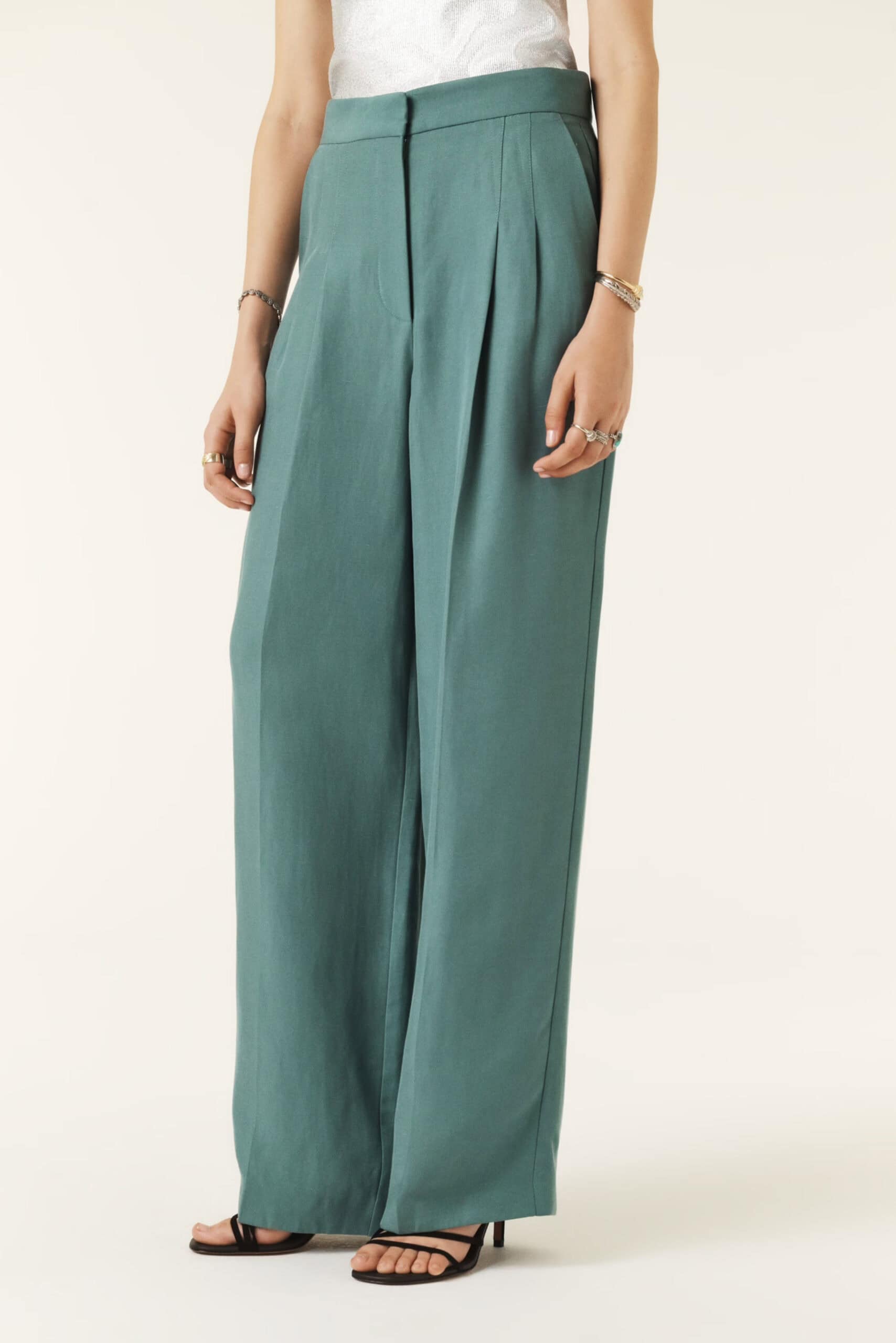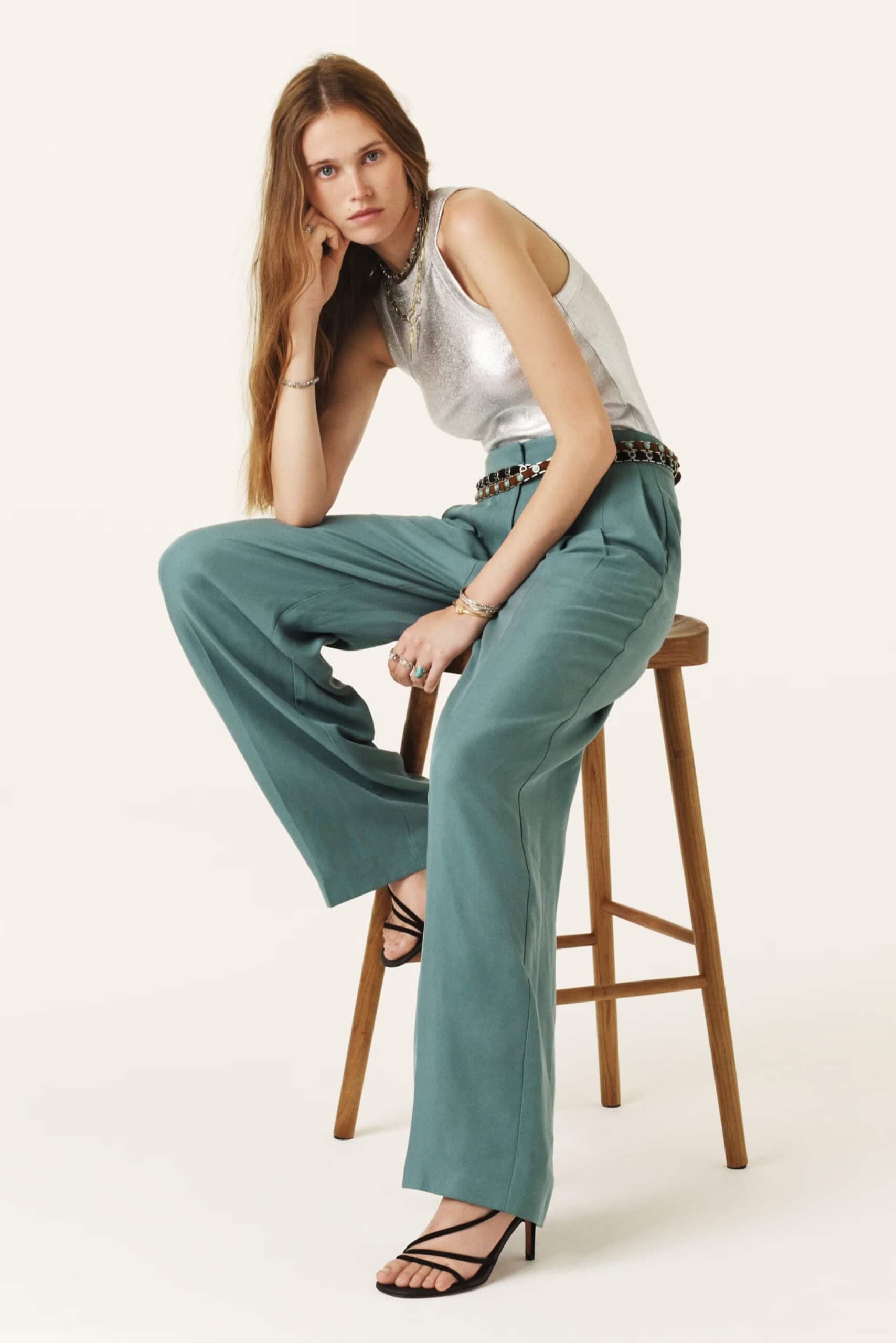 The BA&SH Gadwin Trousers Vert is a cross over between formal and stylish. The trousers are in a beautiful turquoise blue-green made from a lyocell-linen blend slub texture. Featuring a flattering wide leg with pleated detail, pair perfectly with the BA&SH Gayne Jacket for a perfect co-ord.