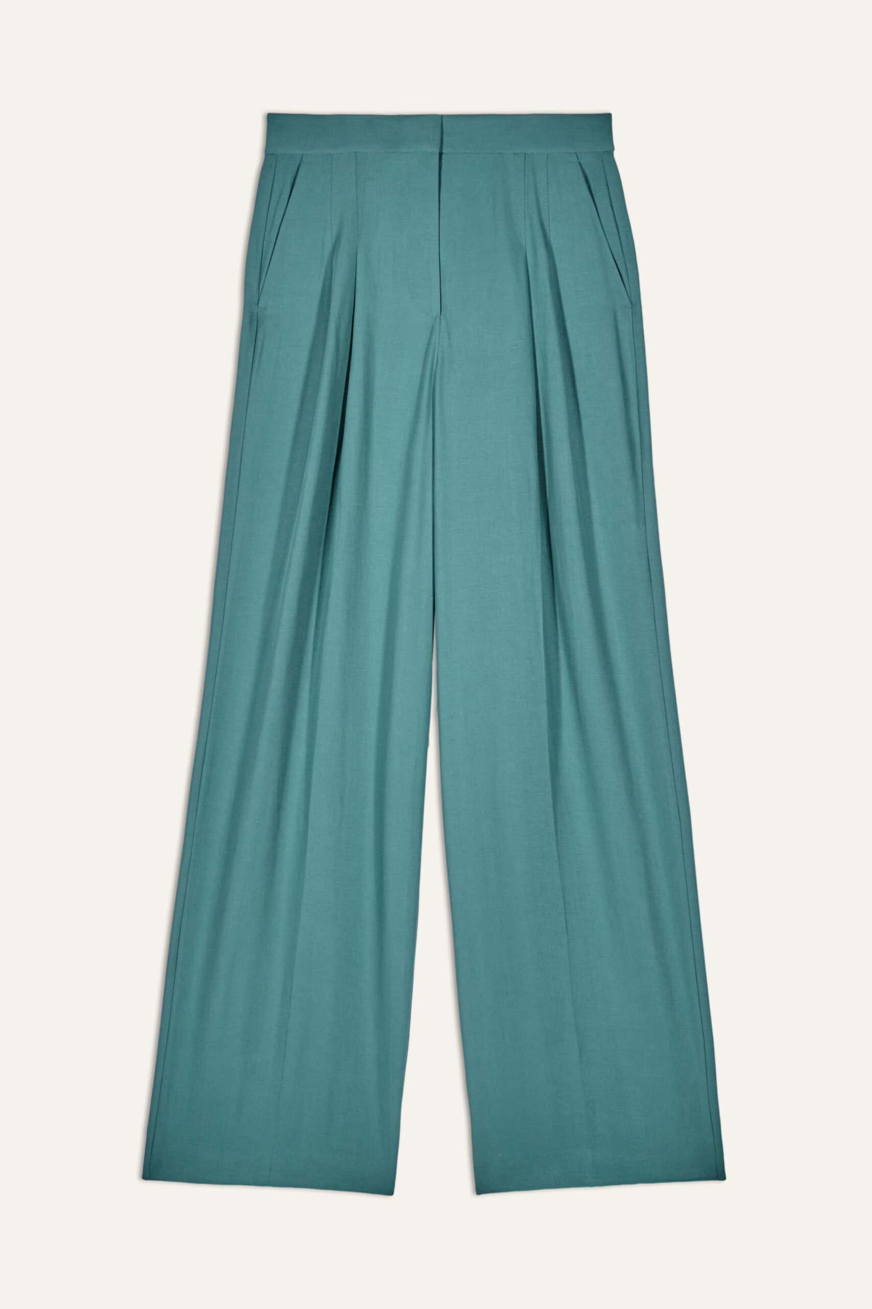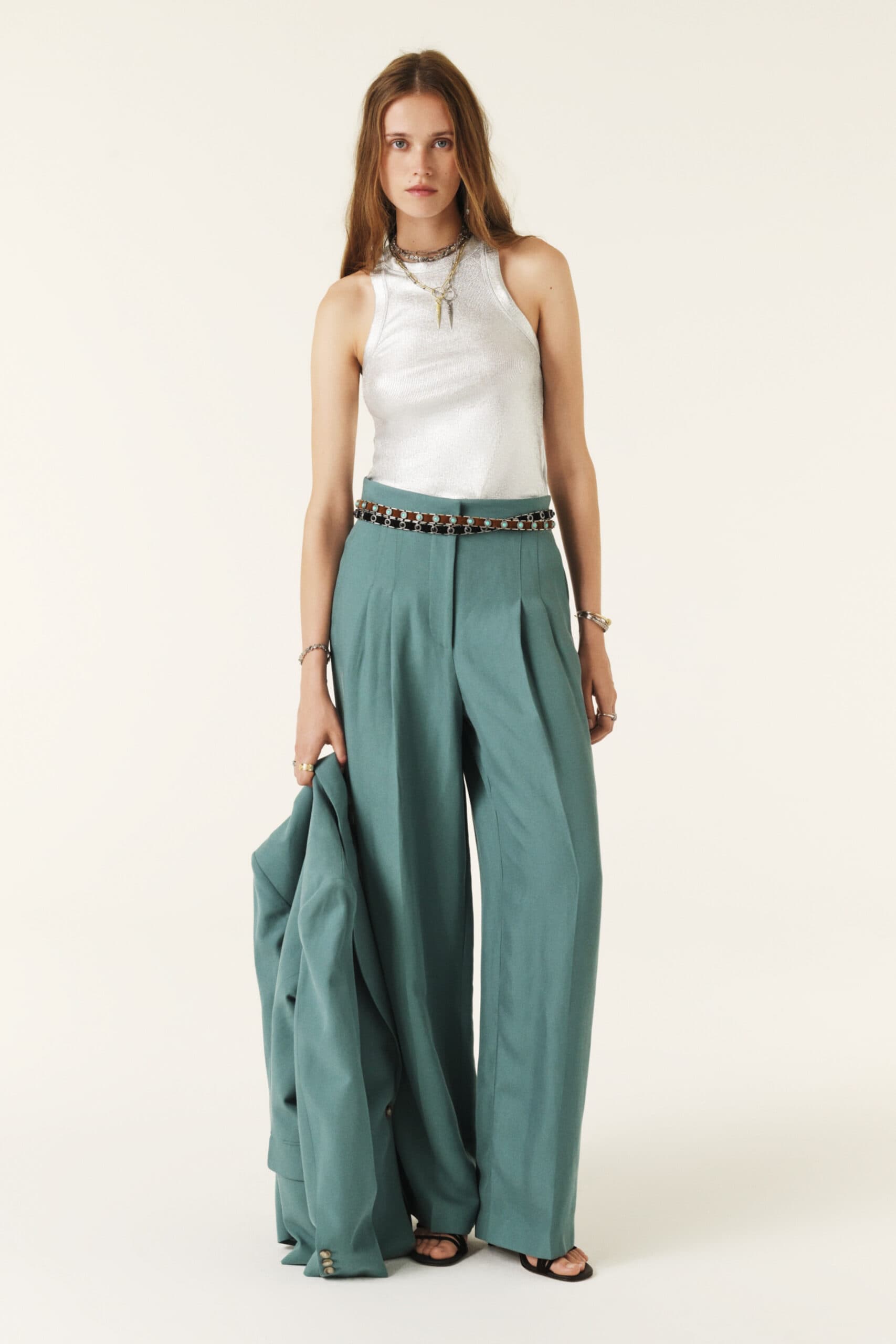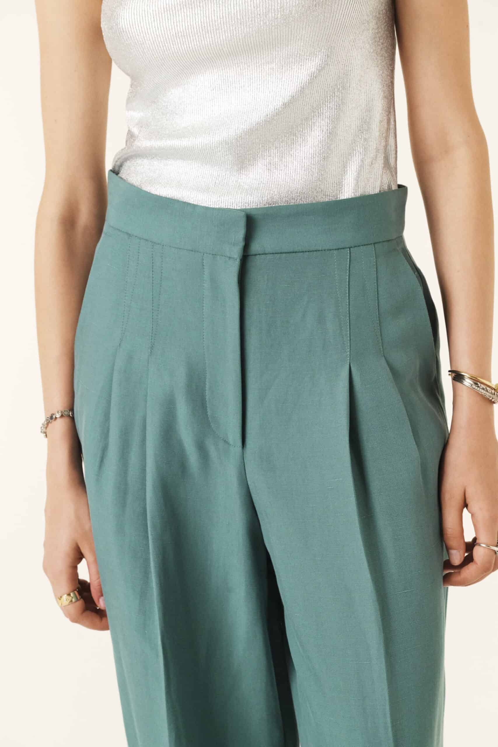 The BA&SH Gadwin Trousers Vert is a cross over between formal and stylish. The trousers are in a beautiful turquoise blue-green made from a lyocell-linen blend slub texture. Featuring a flattering wide leg with pleated detail, pair perfectly with the BA&SH Gayne Jacket for a perfect co-ord.