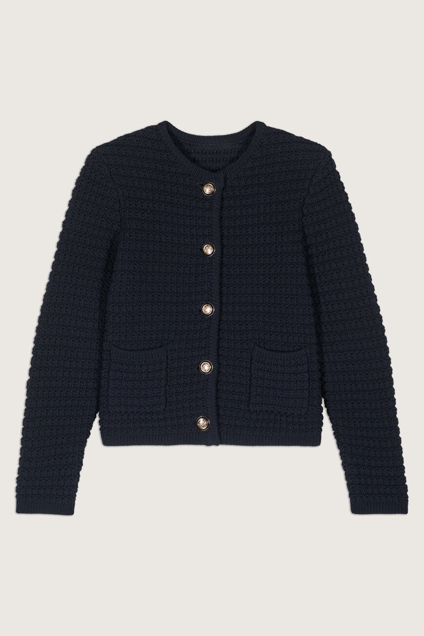 The BA&SH Gaspard Cardigan Marine is easy to wear as part of any style. With mid-length sleeves and a round neck, it's elegant and modern. This piece reveals your wrists and the crest buttons at the front catch the light to make you shine. The cardigan has a technical knitted design with decorative ottoman stitching and is textured to create an irresistible tweed effect. We also love the shoulder pads for added structure and class. Wear with a skirt or trousers for the perfect look!