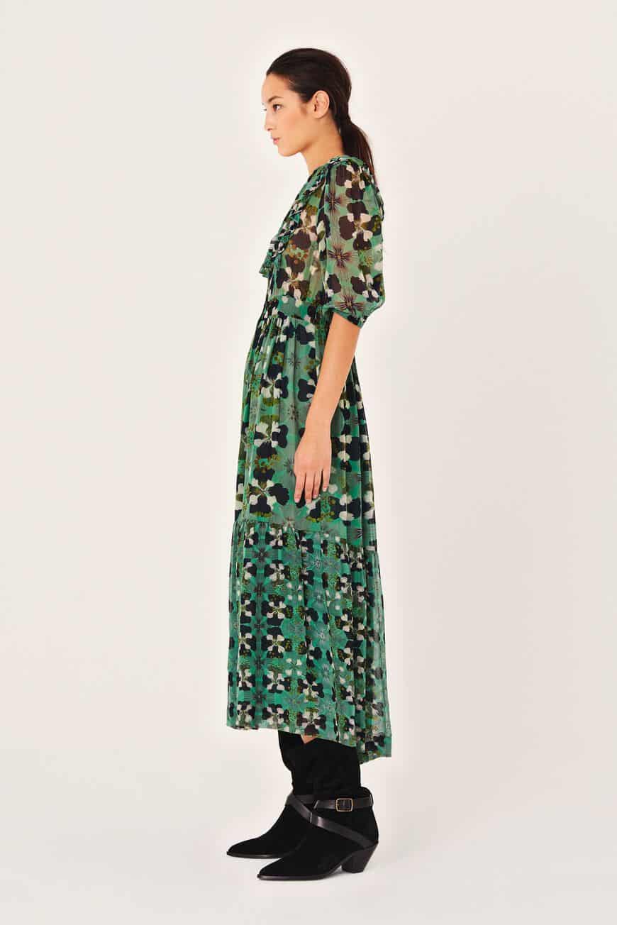 This BA&SH Hooper Dress in Vertdeau has a beautiful floral print and very feminine details which create lots of alluring style: a shirt-dress-inspired button-placket, a very feminine V-neck, ¾-length sleeves, a bust panel enhanced with frill, a marked waist, and flowing drape. This dress will light up your closet this season.