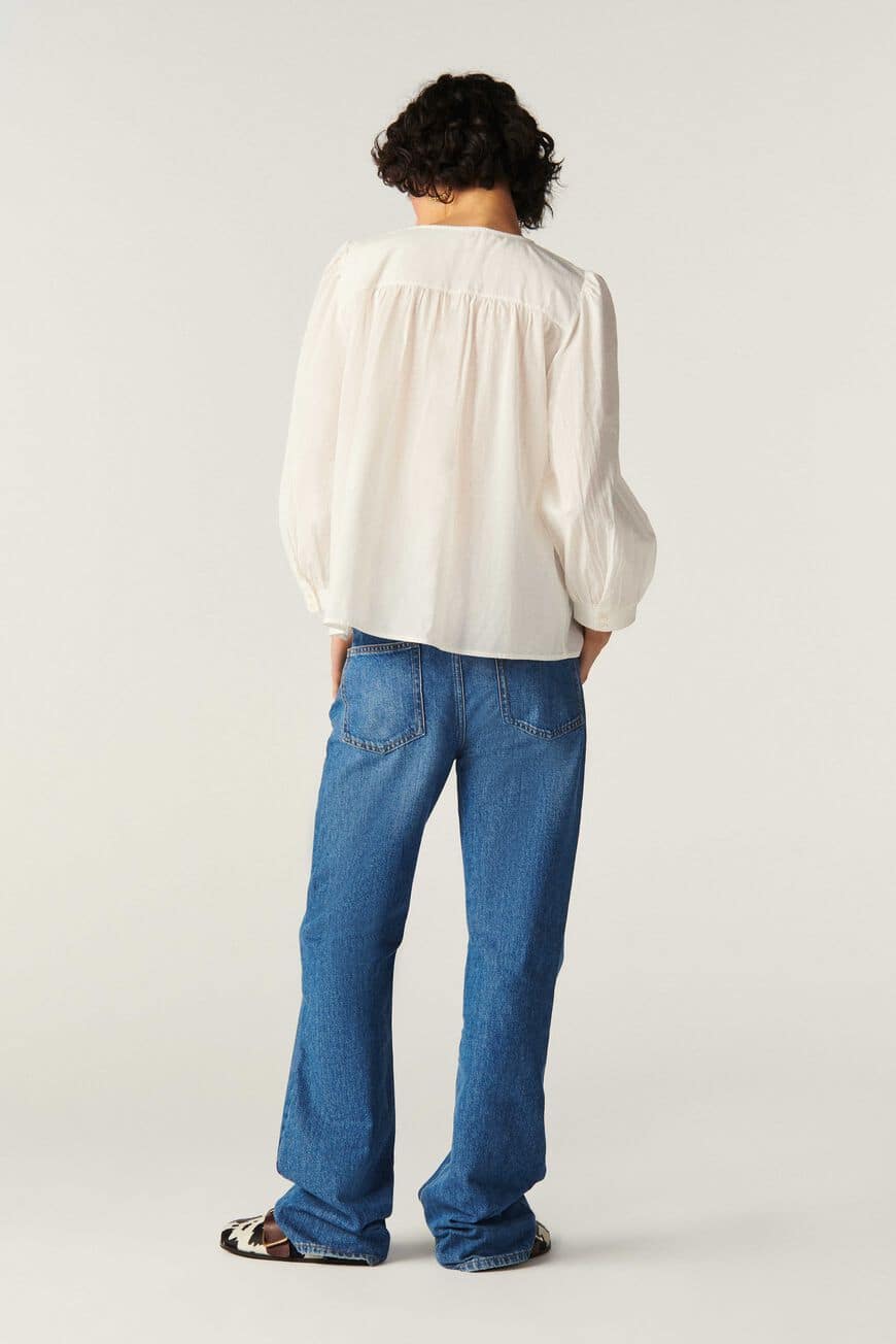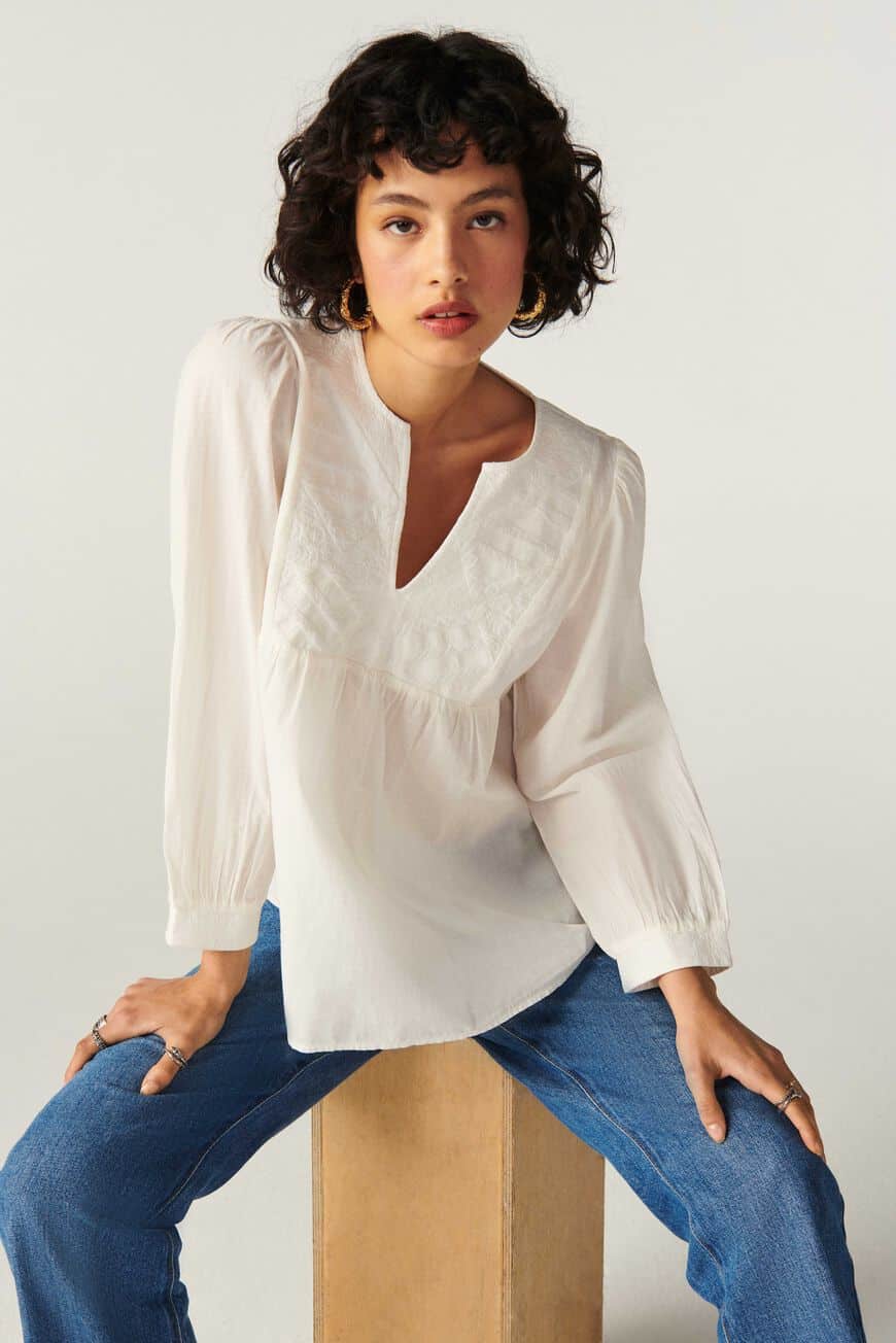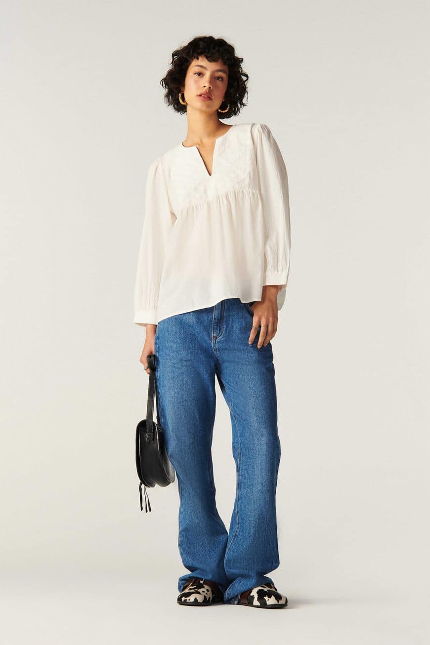 The vibrant BA&SH ILO blouse in ecru evokes lightweight comfort. This blouse has 3/4 sleeves with gathering on the shoulders, a round neckline with one button that plunges into a split, and a straight hem. The cotton has been given a subtle weathered appearance. Featuring fashionable front and back bibs, which are cushioned, embroidered in the same colour, and finished with gathering under the seam for attractive volume. Over jeans or a patterned skirt, this embroidered shirt with exotic elements looks stunning.