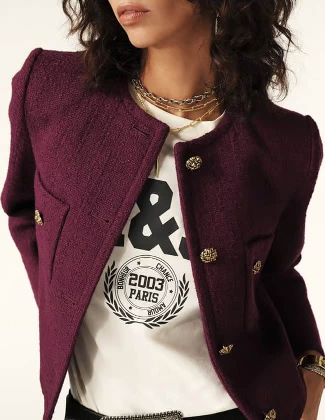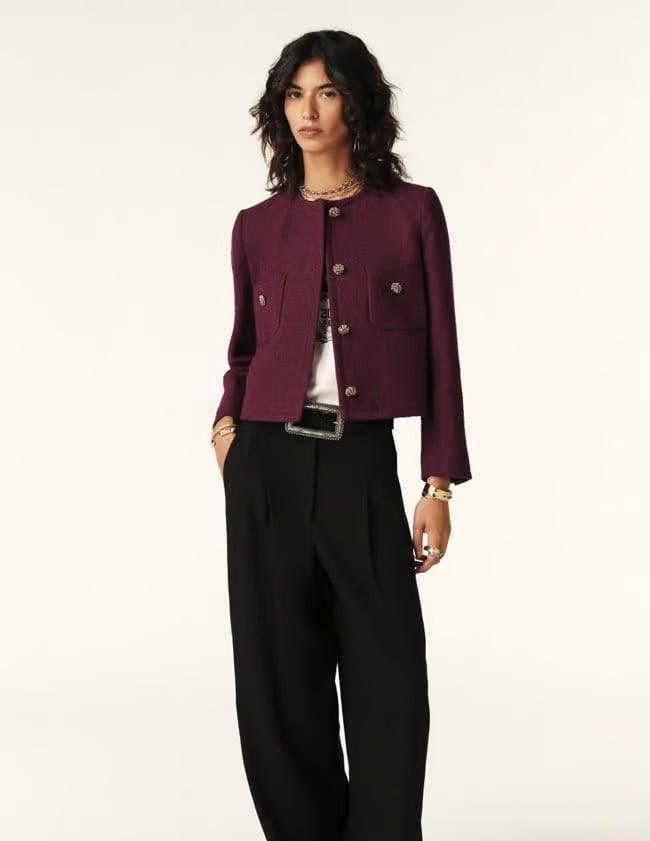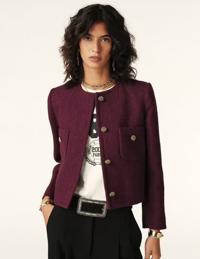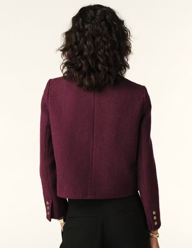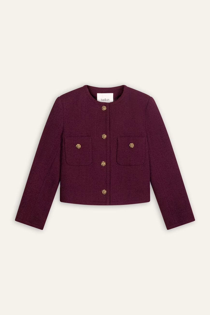 The BA&SH Meredith Jacket Bordeaux is a timeless style that will become your everyday go-to! This chic cropped jacket will elevate any outfit and we love how easy it is to wear for that effortlessly stylish look. It has a round neck with 2 patch pockets and is finished beautifully with gold crafted buttons. Pair with high-waisted trousers or denim for an urban look or a skirt for a chic style. Pair with the Sasha trousers for a smarter look or Harper jeans for an urban look, both from Paige.