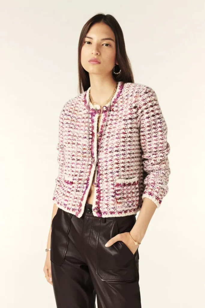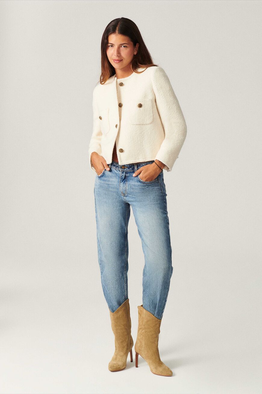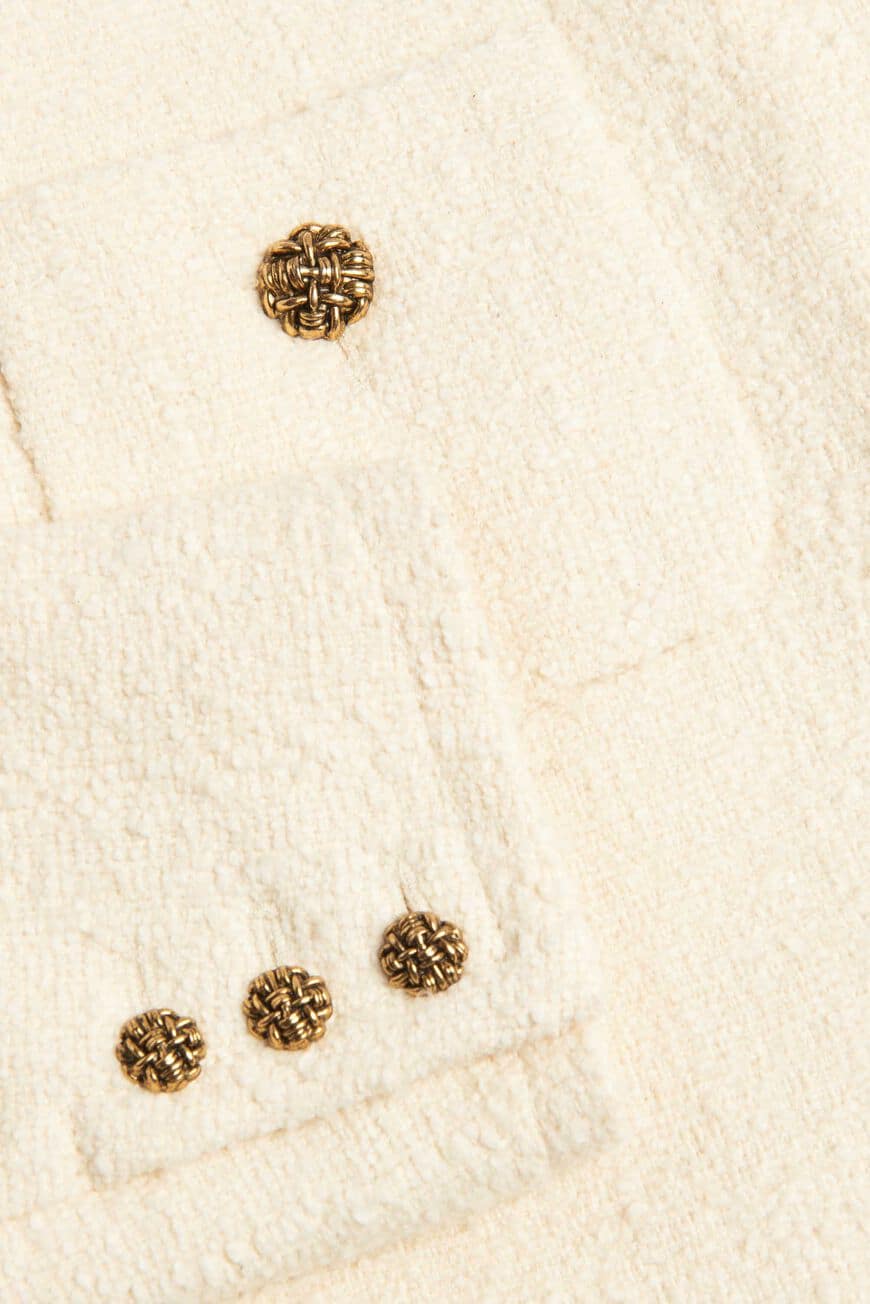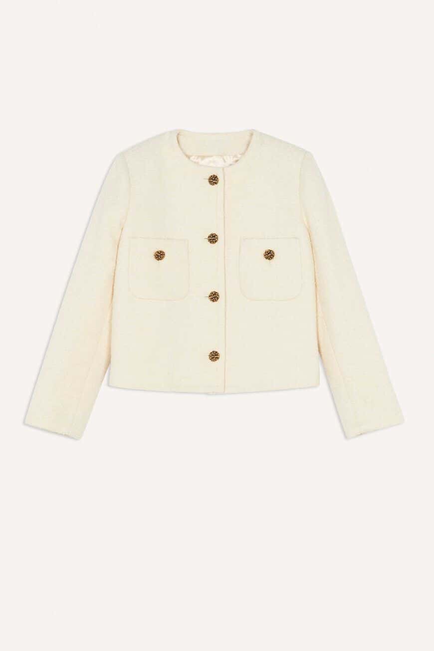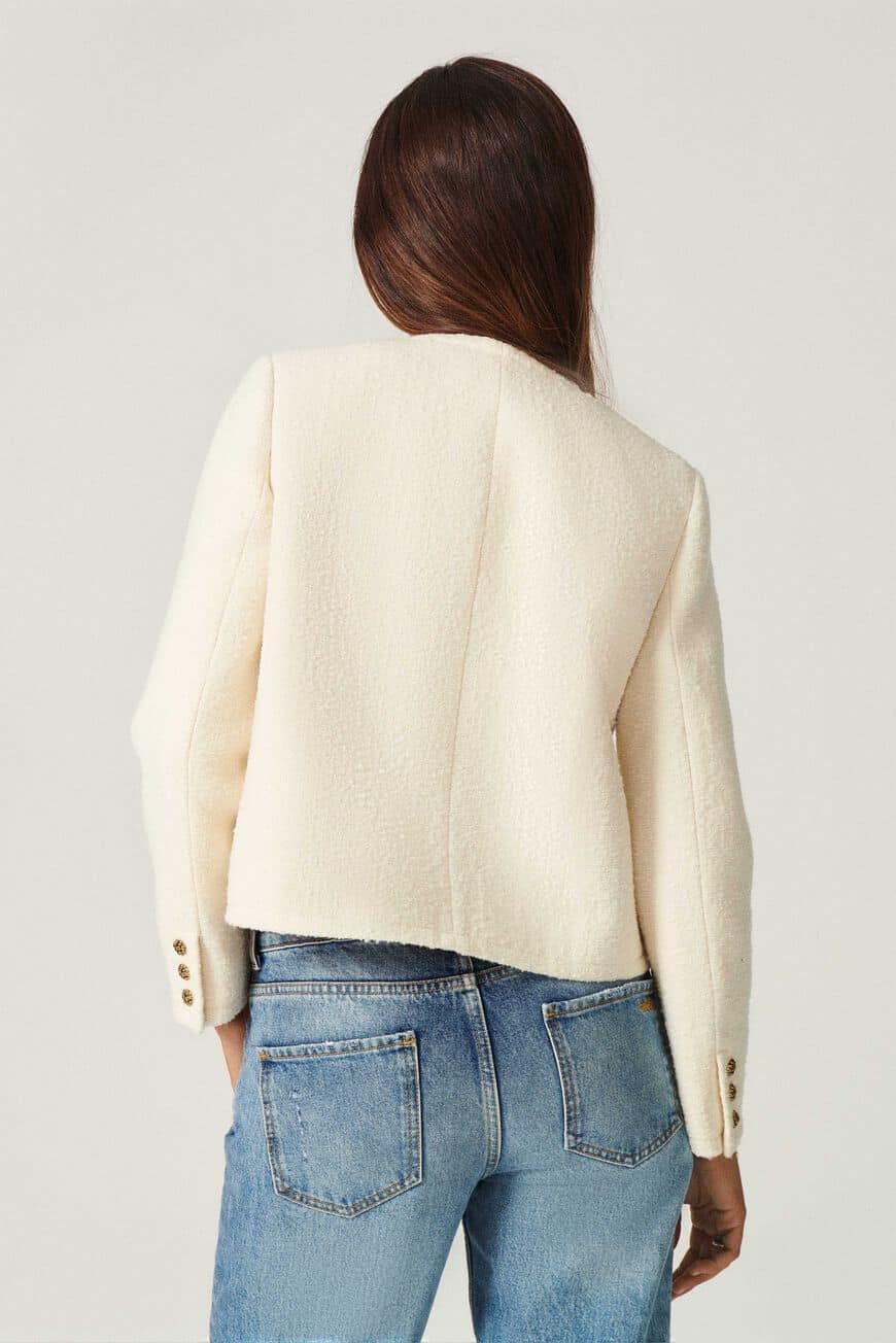 The BA&SH Meredith Jacket Ecru is a chic cropped jacket. The ecru wool and cotton mix Meredith jacket from Ba&sh is a statement jacket is so versatile and can elevate denim or is perfect to wear draped round your shoulders over eventwear this season. The jacket has a round neck, patch pockets and gold tone buttons to the front and cuffs.