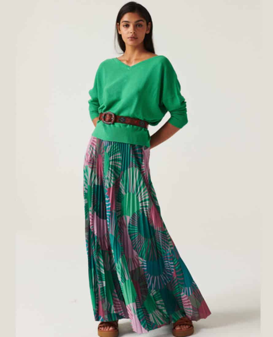The BA&SH Neo Skirt Green, designed in a lightweight, fluid fabric, features a stunning green and pink tropical inspired print. This statement skirt features a pleated waistband with elasticated band at the back, in a maxi length with a side zip closure and a fun tropical inspired print.