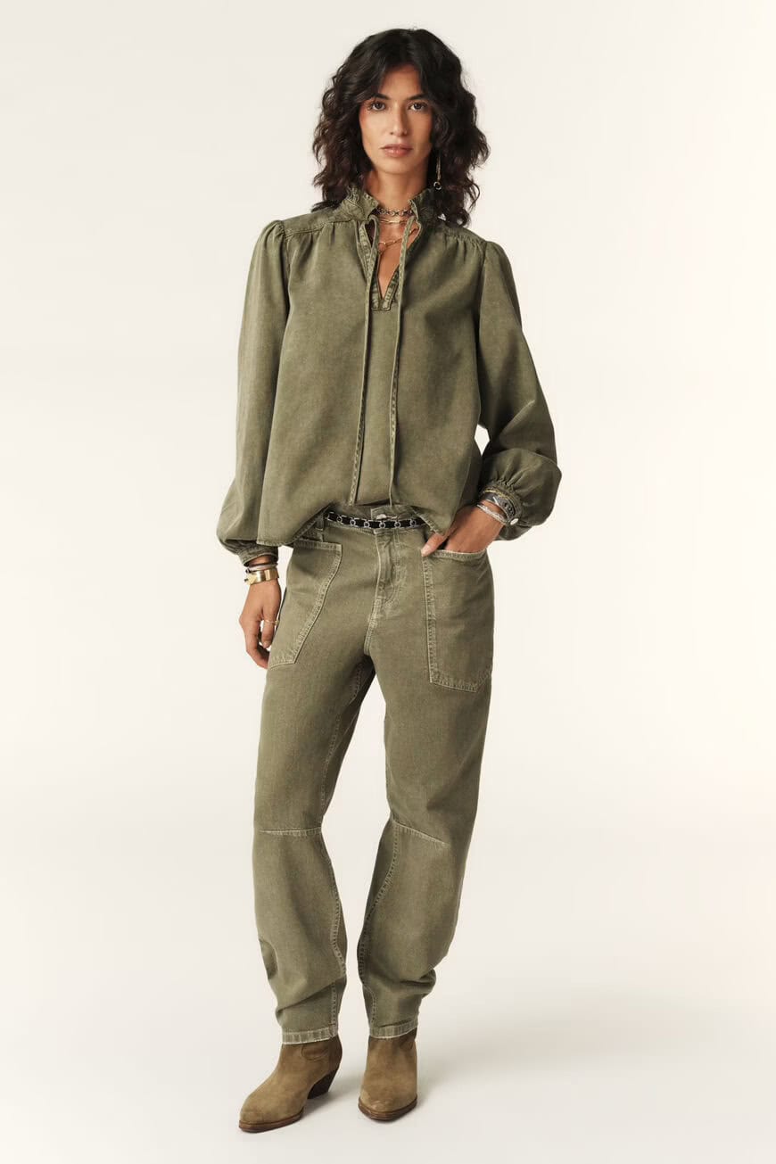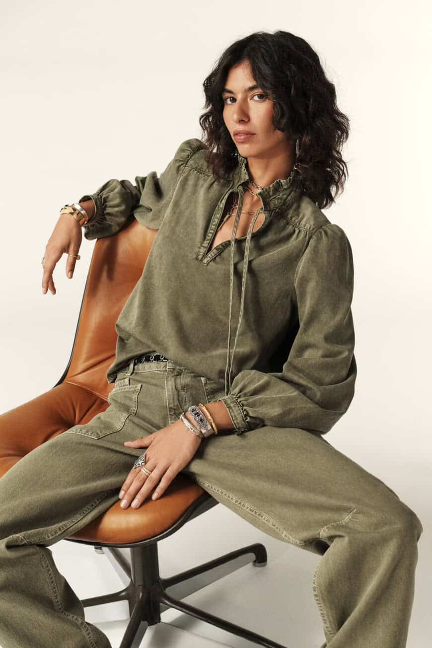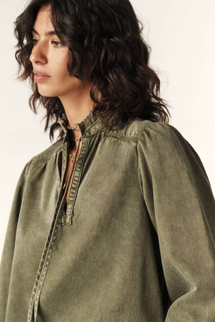 The BA&SH Olouise Blouse Khaki is a unique trendy top. Featuring visible stitching in a regular length, high-neck, long-sleeved and buttoned cuffs. The drawstring detail gives the top a relaxed feel and a the faded wash adds texture. Pair with your favourite denim and trench for the ultimate stylish look.
