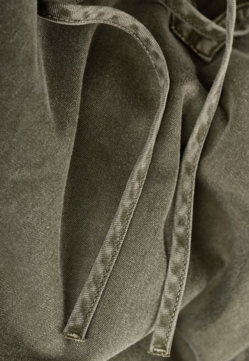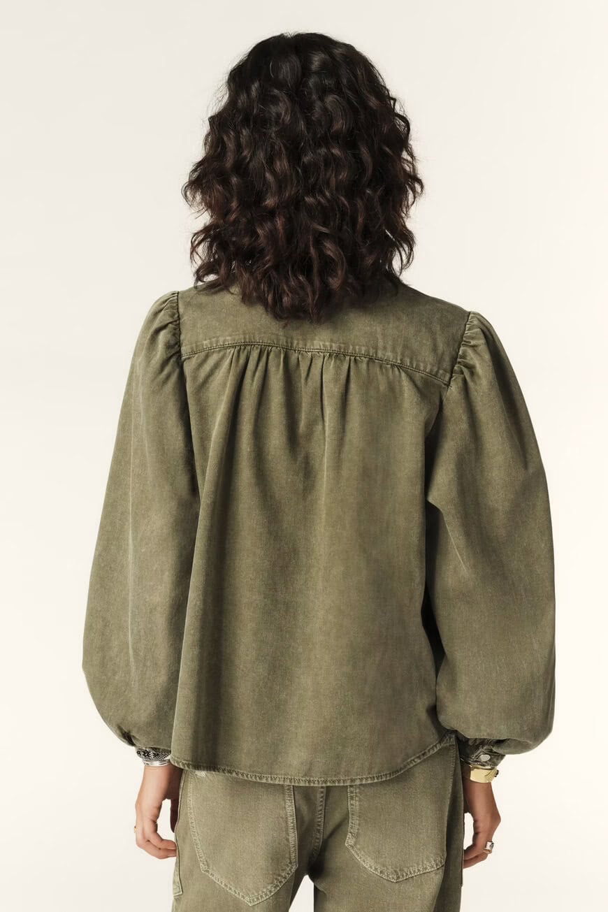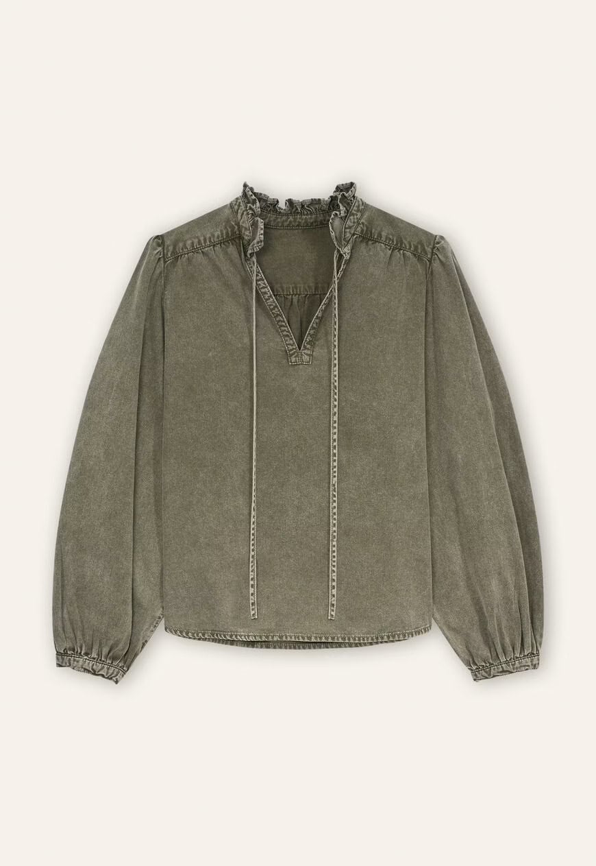 The BA&SH Olouise Blouse Khaki is a unique trendy top. Featuring visible stitching in a regular length, high-neck, long-sleeved and buttoned cuffs. The drawstring detail gives the top a relaxed feel and a the faded wash adds texture. Pair with your favourite denim and trench for the ultimate stylish look.