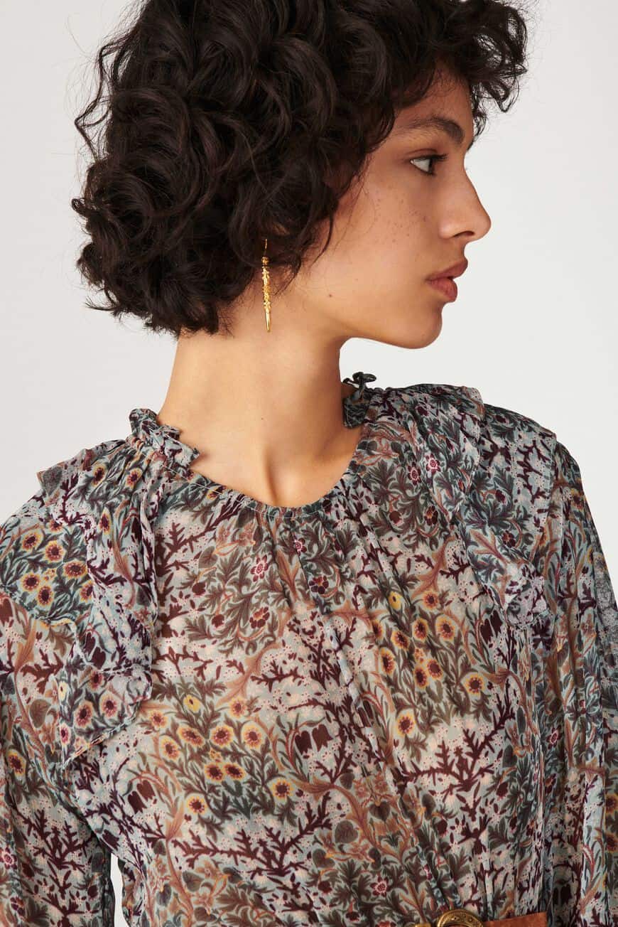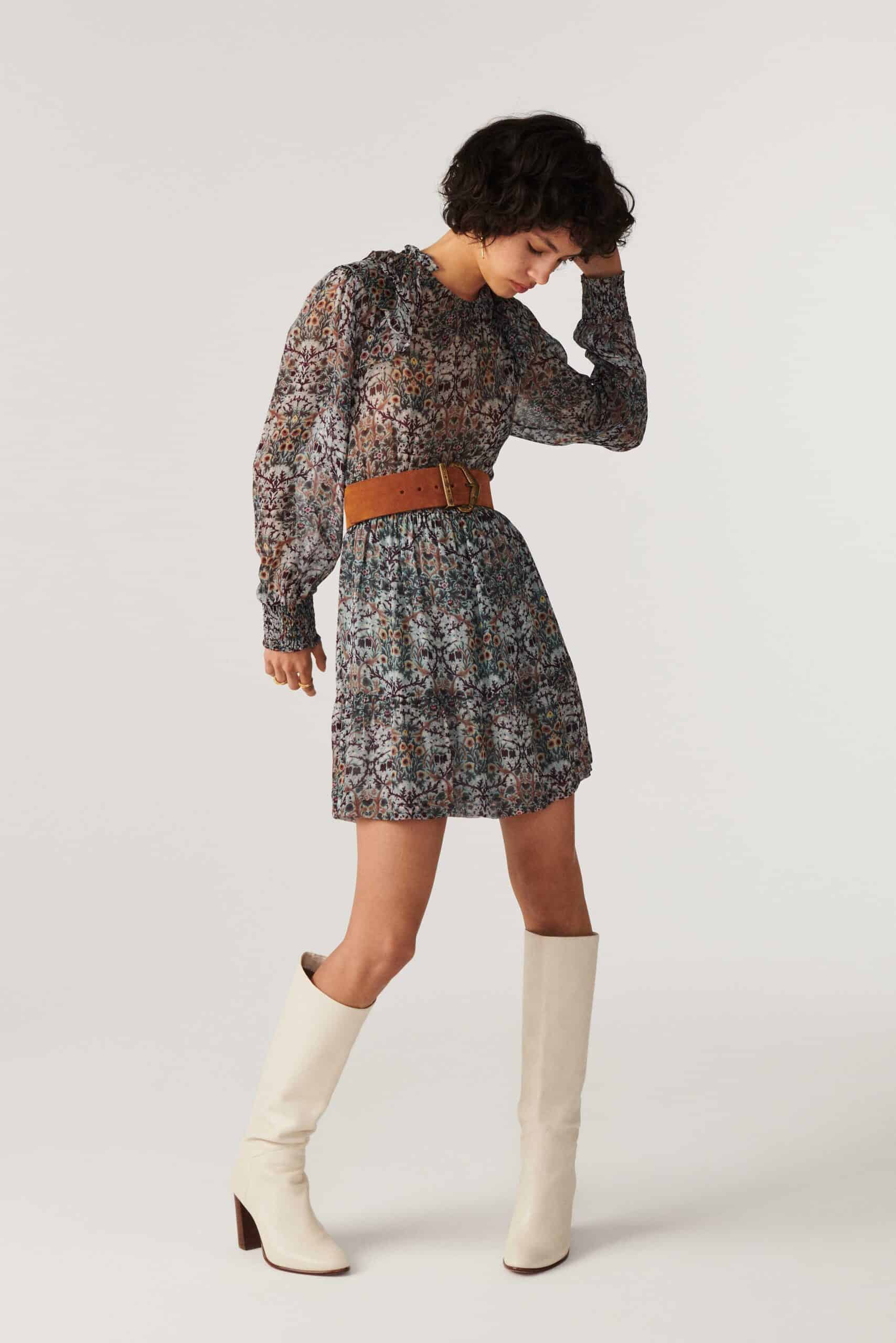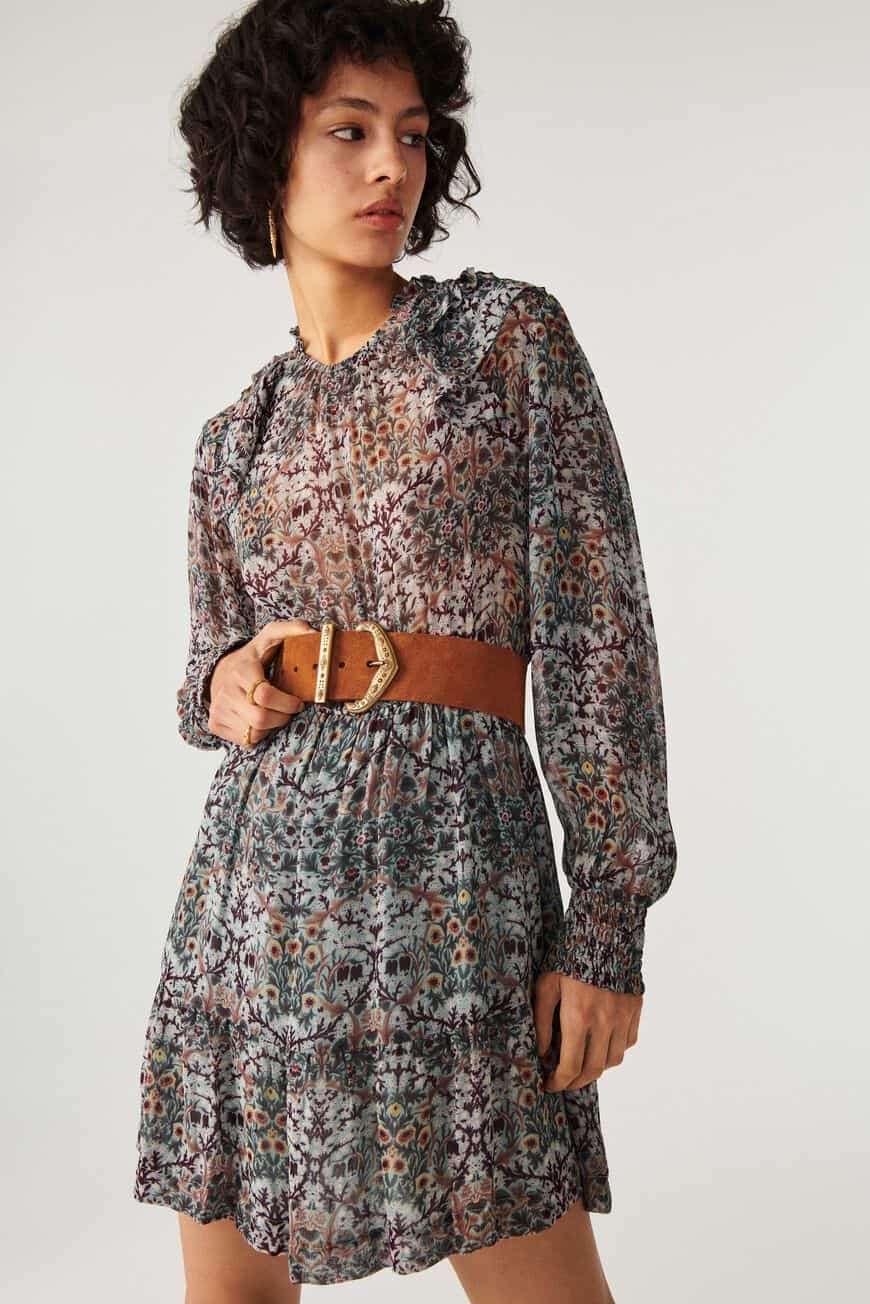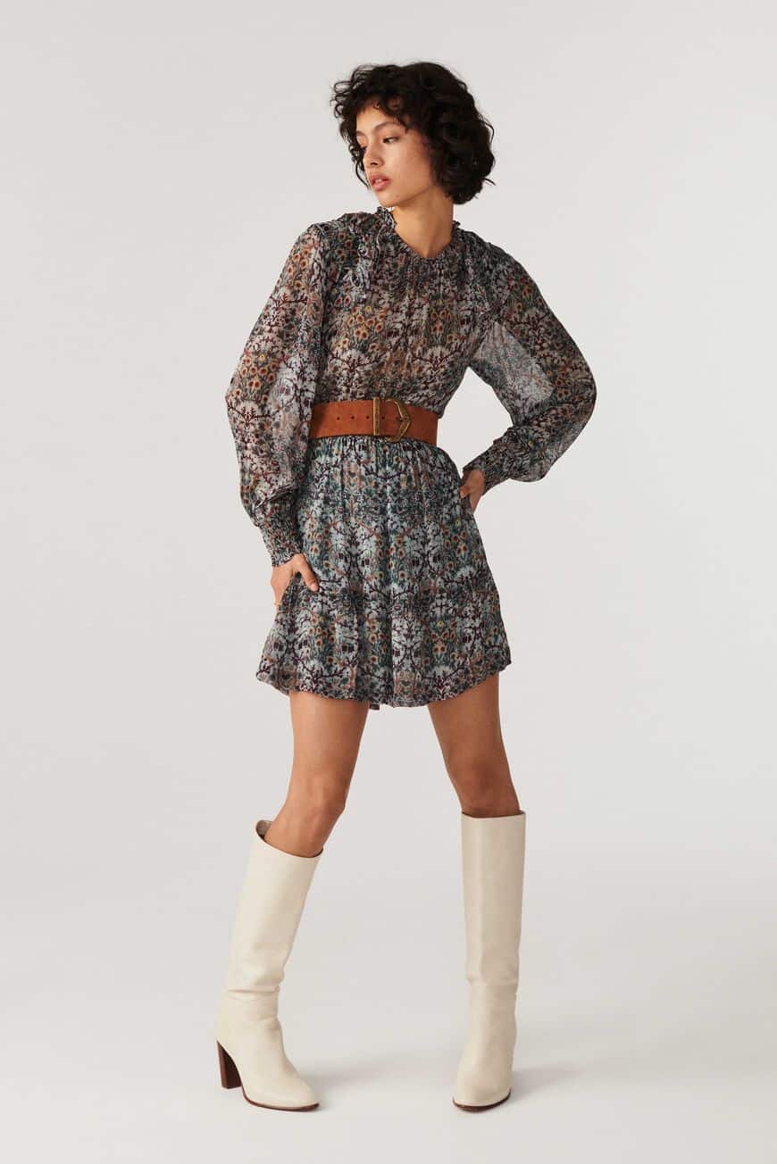 The BA&SH Presley Dress in amande is a beautiful mini dress. Featuring a feminine ruffled collar, loose fit sleeves and cuffed sleeve hems. This mini dress has a gorgeous flow to it that swings blissfully through a breeze. The ditsy floral leaf pattern print makes this perfect for autumn. Looks great paired with a chunky belt to pull you in at the waist.