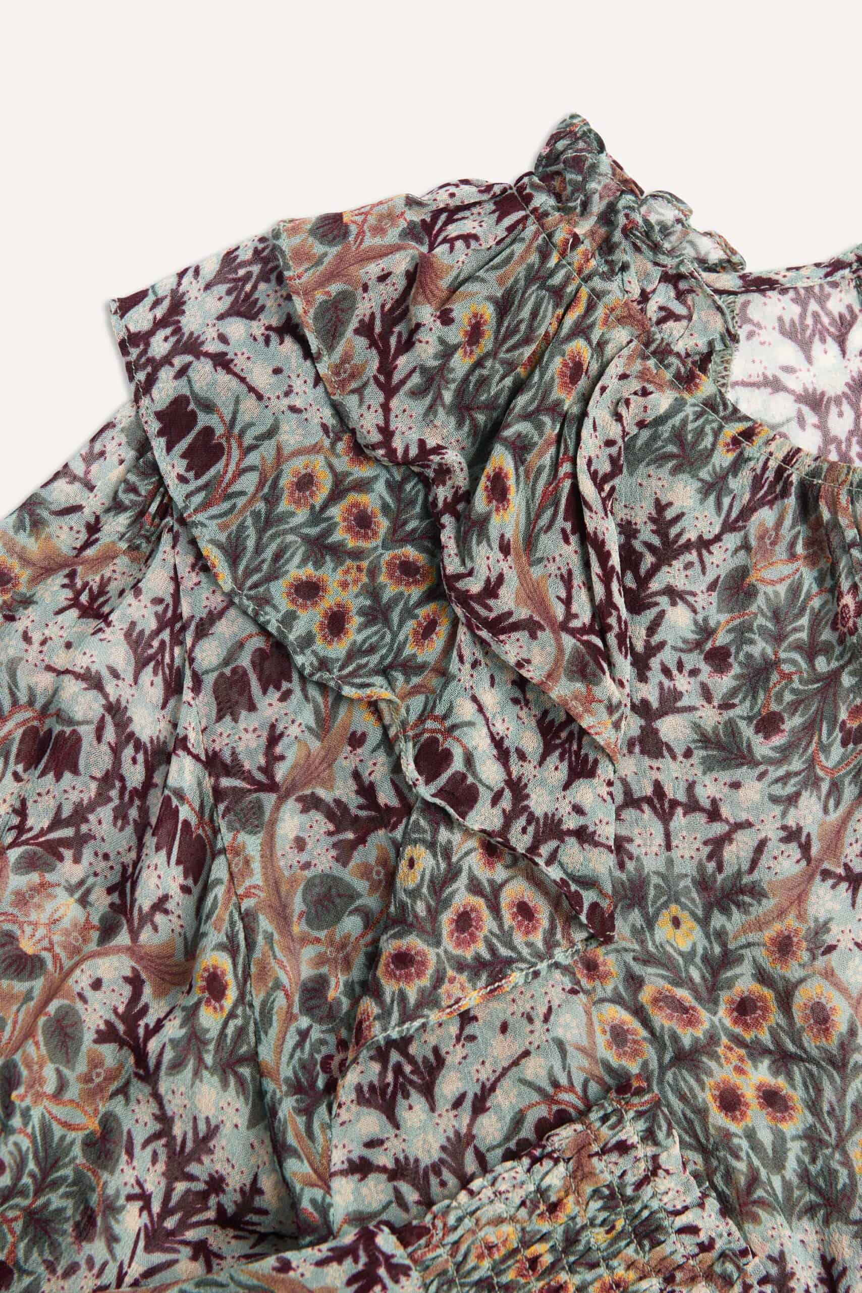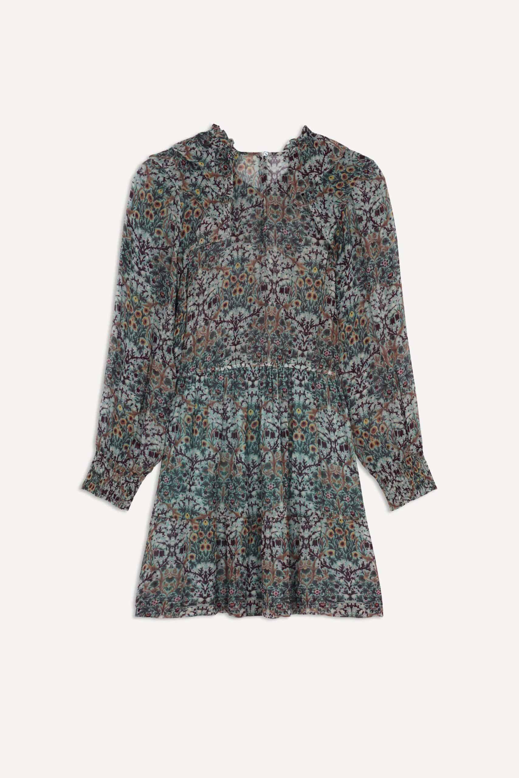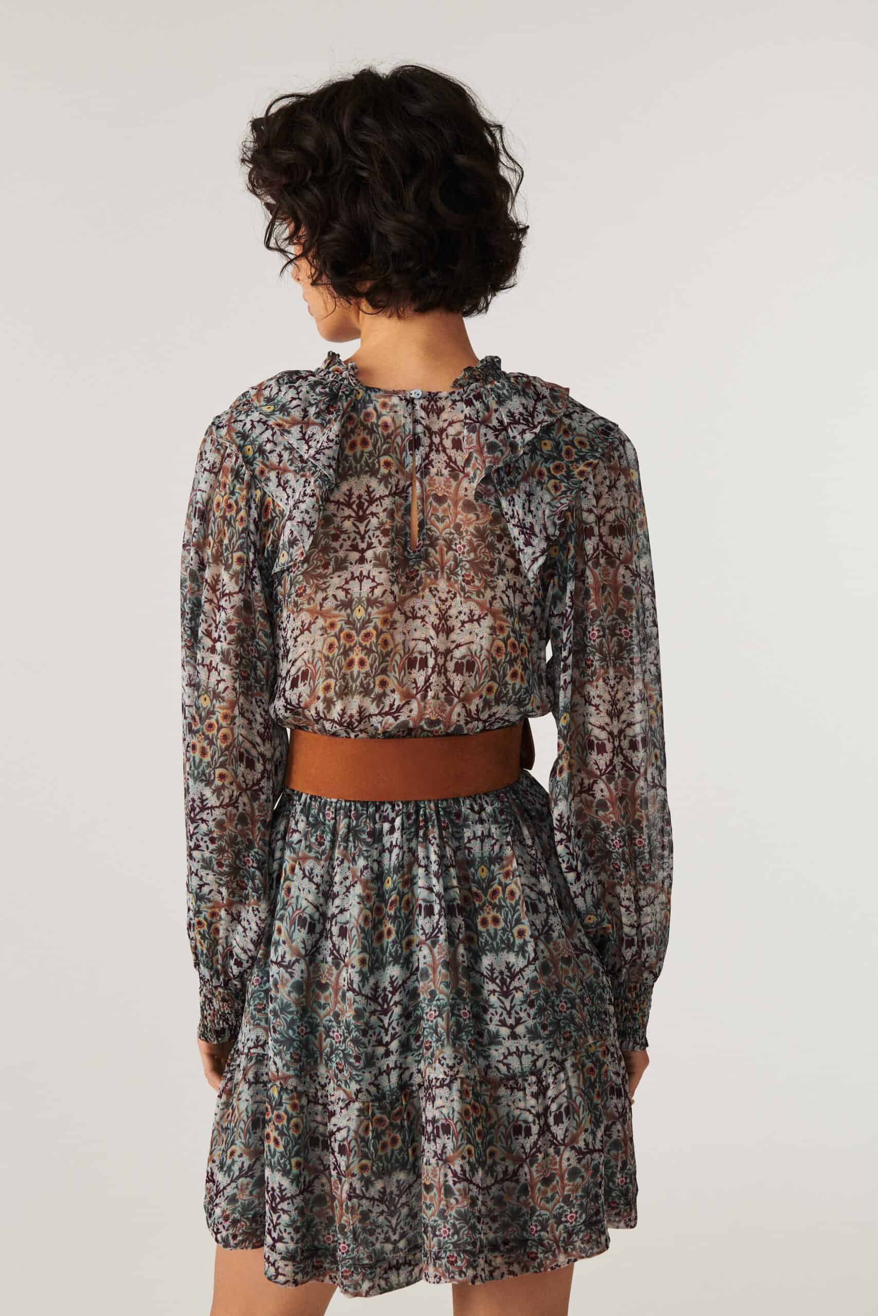 The BA&SH Presley Dress in amande is a beautiful mini dress. Featuring a feminine ruffled collar, loose fit sleeves and cuffed sleeve hems. This mini dress has a gorgeous flow to it that swings blissfully through a breeze. The ditsy floral leaf pattern print makes this perfect for autumn. Looks great paired with a chunky belt to pull you in at the waist.