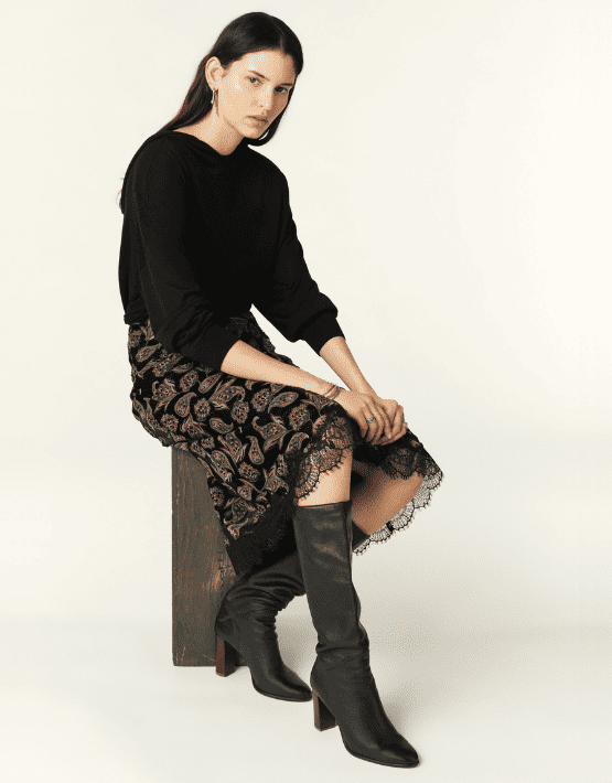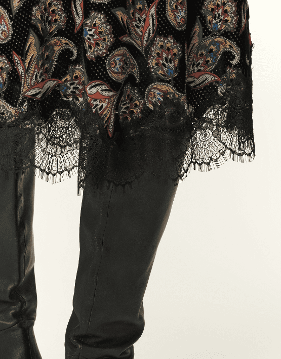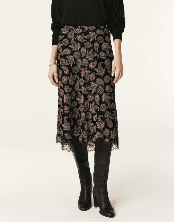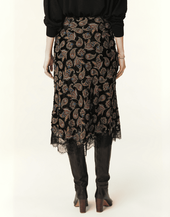 The BASH Rita Skirt Black is a gorgeous high-waist, midi-length skirt finished with a chantilly lace hem. It features a beautiful flocked velvet, 70s style paisley print design throughout. Style yours with boots and an oversized knit.