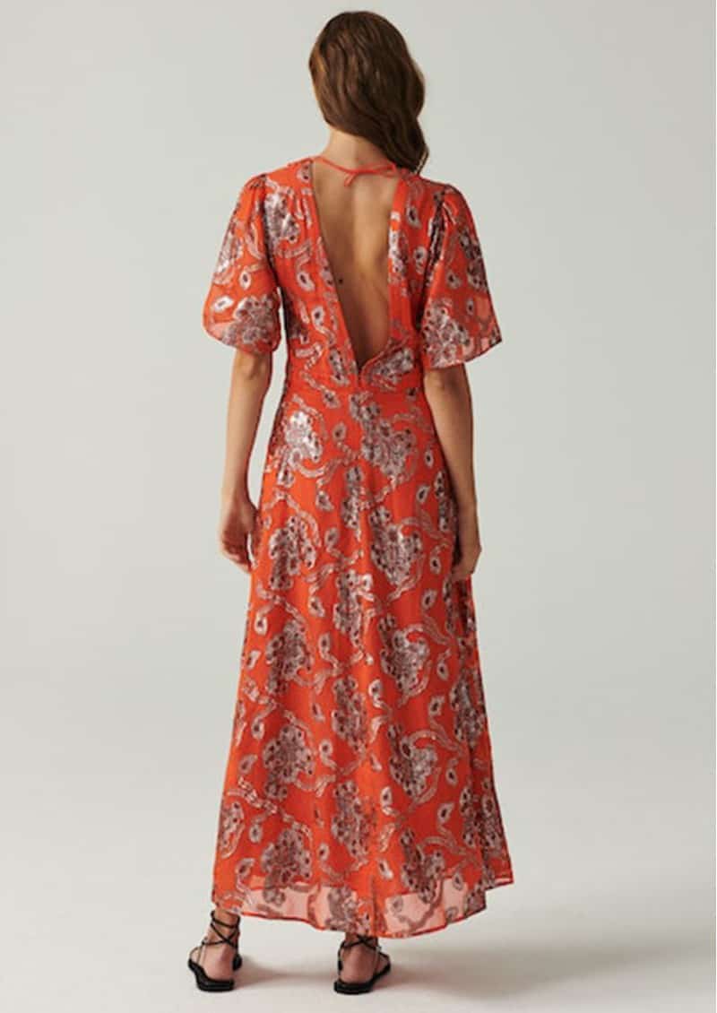 The BA&SH Shelby Dress Orange is a showstopper dress with a luxe look and feel that is perfect for summer occasions. Shelby is a maxi style dress with a deep V-neck and low back. It has floaty sleeves detailing and comes in a stunning deep orange with sliver thread.