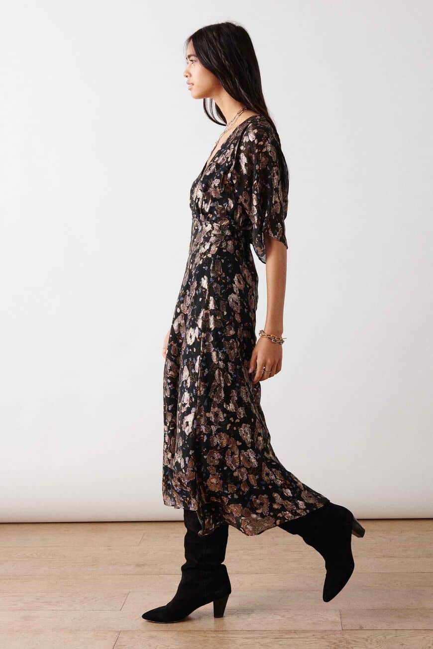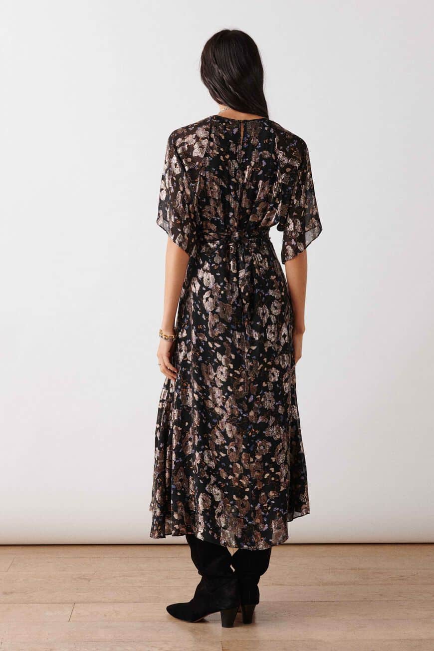 The BA&SH Tee dress in black is an absolutely stunning midi dress with a sexy V-neck and short, flowing sleeves. The dress is fitted at the waist and fastens at the back with the self fabric tie creating the perfect silhouette with the split down the top of the back allowing you to show off a bit of skin. The dress has a beautiful floral pattern all over it highlighted with metallic thread detailing. Style it with heels a stylish evening look.