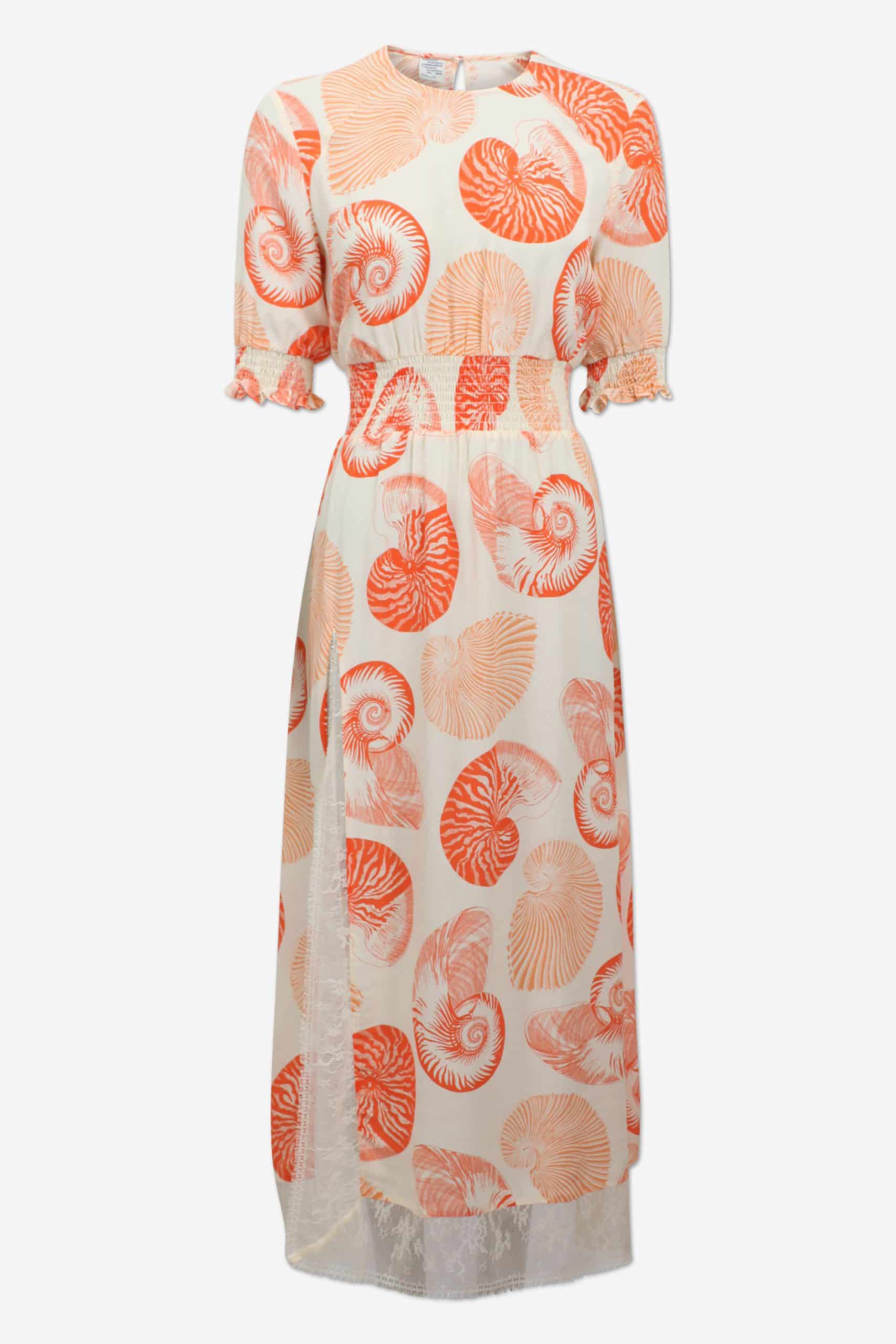 The Baum und Pferdgarten Aleela Dress in Cream Shell is a long dress with a shirred waist and sleeves, cut from a smooth silk blend fabric. An elegant style with a high slit exposing a delicate lace fabric. *Long Dress *Sheered Waist & Sleeves *High slit exposing delicate lace fabric *The model is 178cm tall and is wearing a size 36 / small.