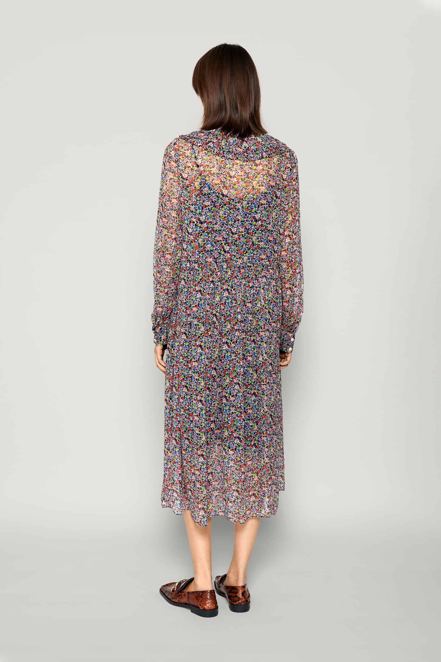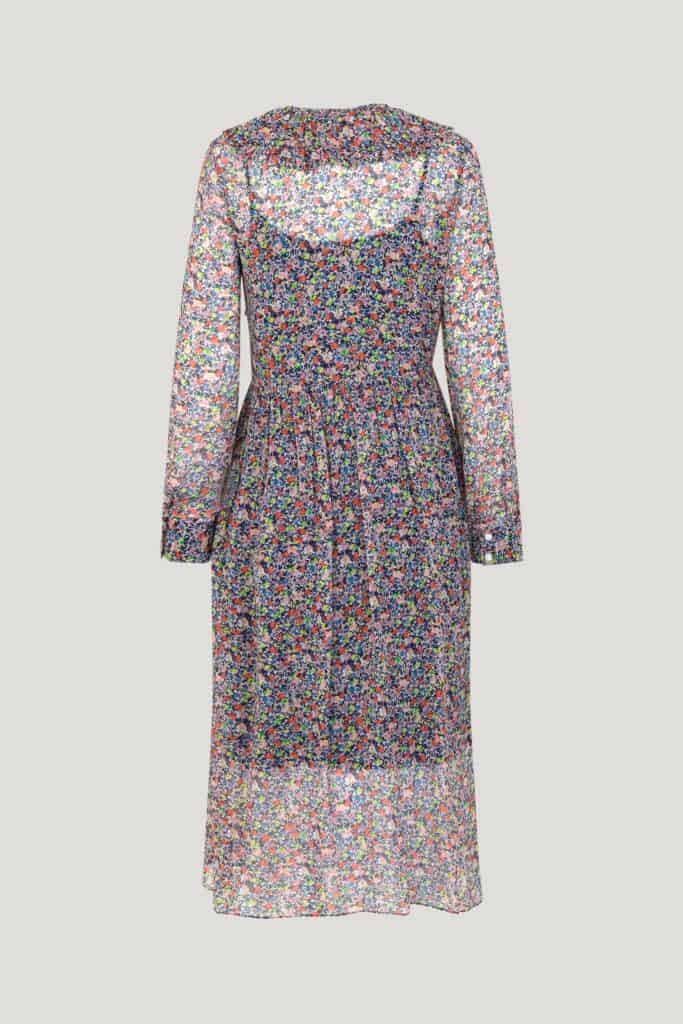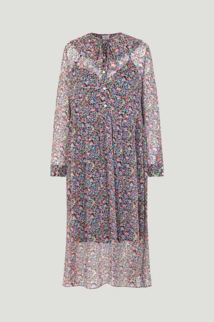 The Baum Und Pferdgarten Amaira dress in redish flower field is a beautiful long sleeve, midi length dress with buttons to the waist and an oversized ruffled collar with a tie at the neck. This dress has a lovely ditsy floral print throughout with a sheer top layer and a knee length slip underneath. It is the perfect dress for taking you from day to night. Style it with a denim jacket and trainers for a stylish casual day look and then swap to heels and a leather jacket for a dressier look for the evening.