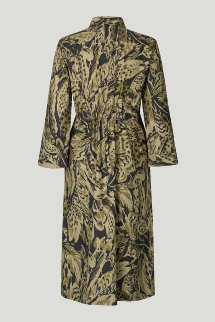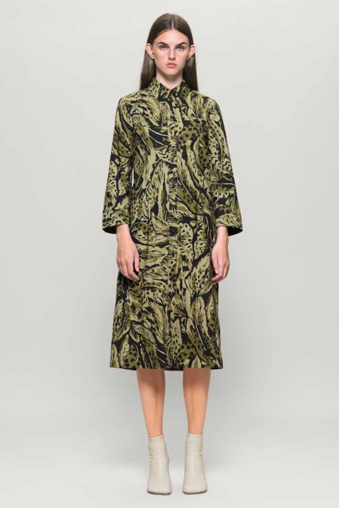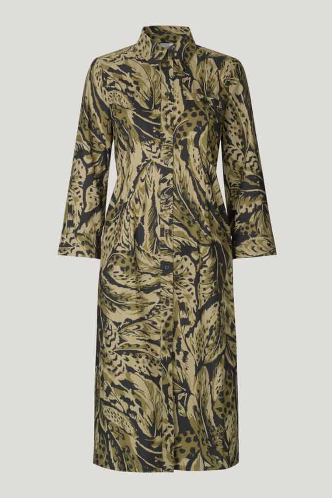 The Baum Und Pferdgarten Arlene dress in Olive Feather is a mid-length shirt dress with cropped trumpet sleeves, side pockets and elastic detail in the back at the waistline. Wear with thick tights and boots when it is colder and then trainers when it gets a bit warmer.