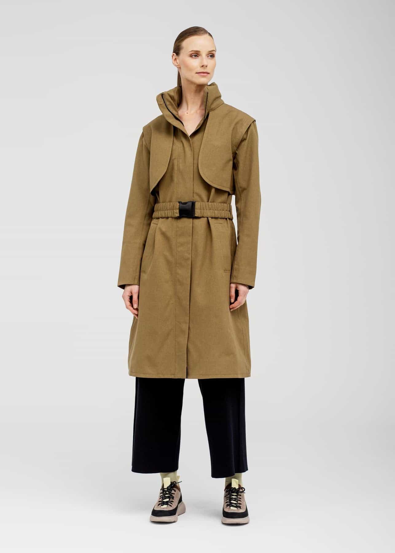 The BRGN Skyet coat in lizard green is designed to flaunt your figure and enhance your shape. With a tailored and narrow fit, the scrunch belt becomes an accessory. Featuring taped seams to protect from water, magnetic buttons, YKK zips and reflective trims. Perfect for the colder seasons.