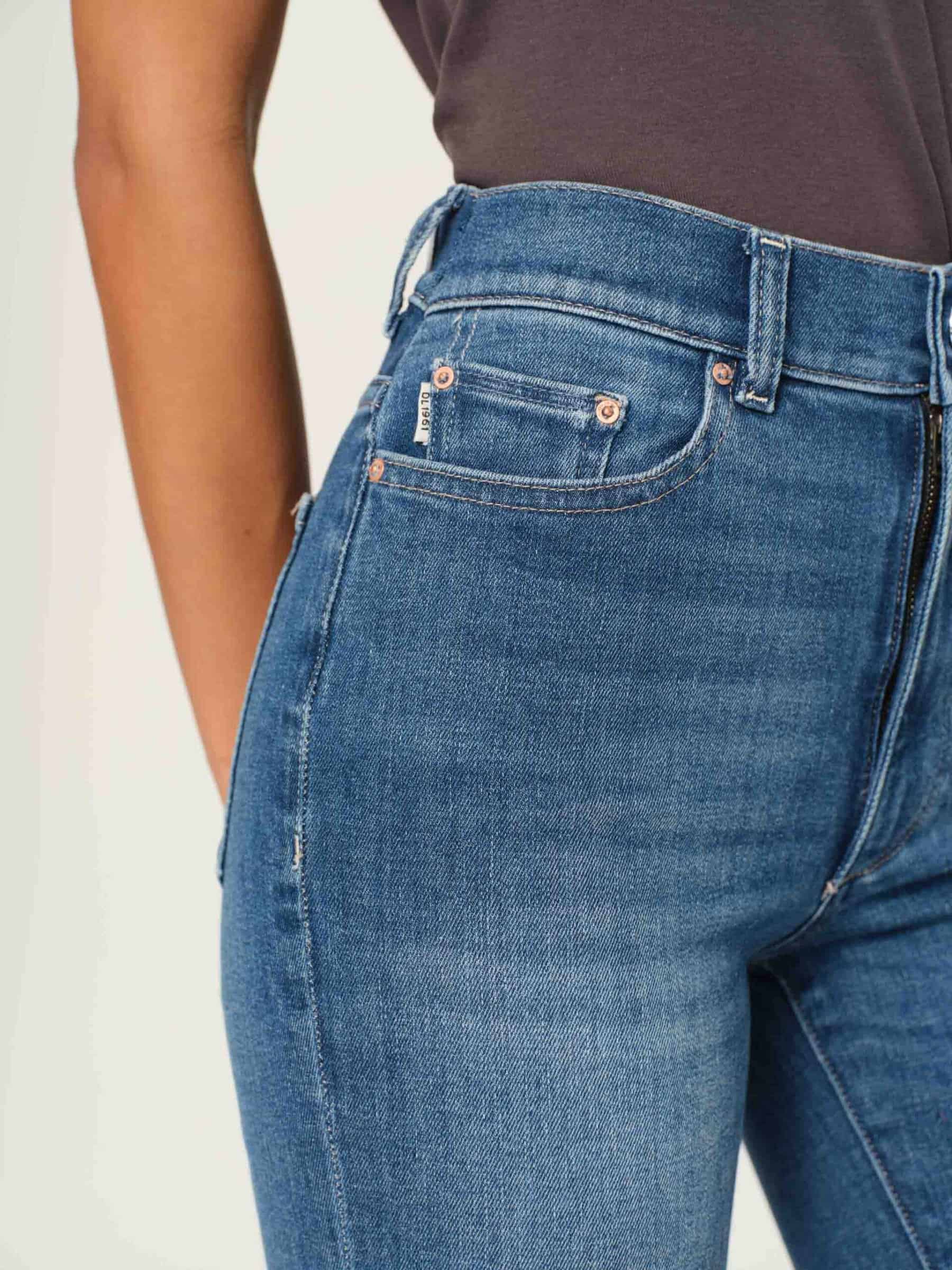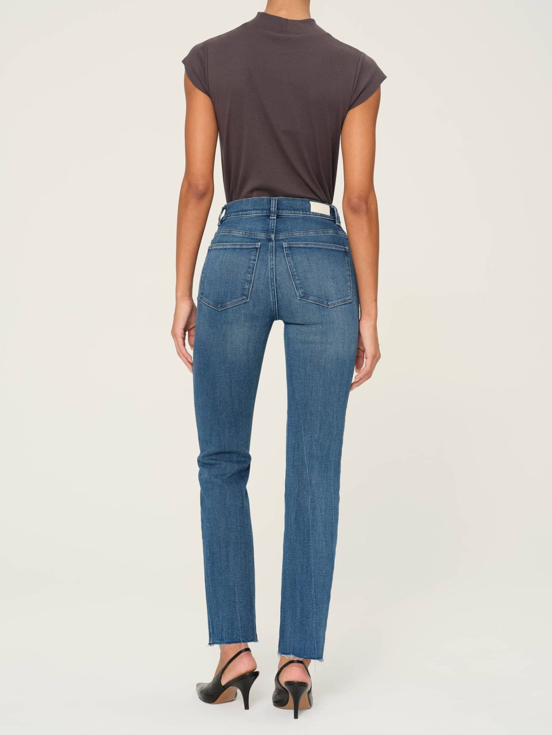 The DL1961 Halle Straight leg jeans in palm springs are the perfect high rise jeans with a 29" inseam crafted from the brand's Instasculpt technology to smooth, sculpt, and conform to your body for the perfect fit. The jeans are in a bright, mid-indigo wash with subtle fading for a worn-in look and features a shiny silver shank, matte copper rivets, multi-coloured stitching and a raw hem.