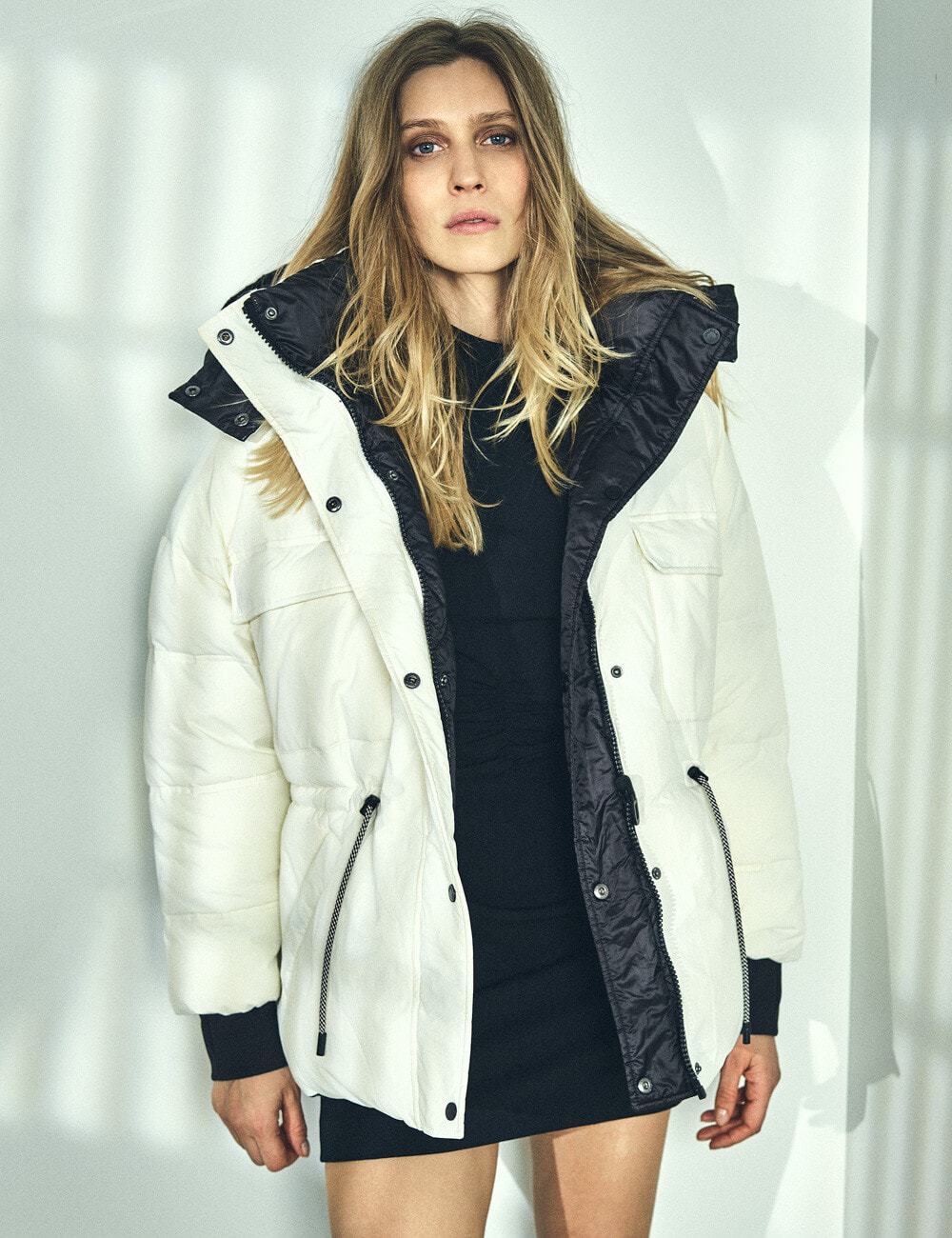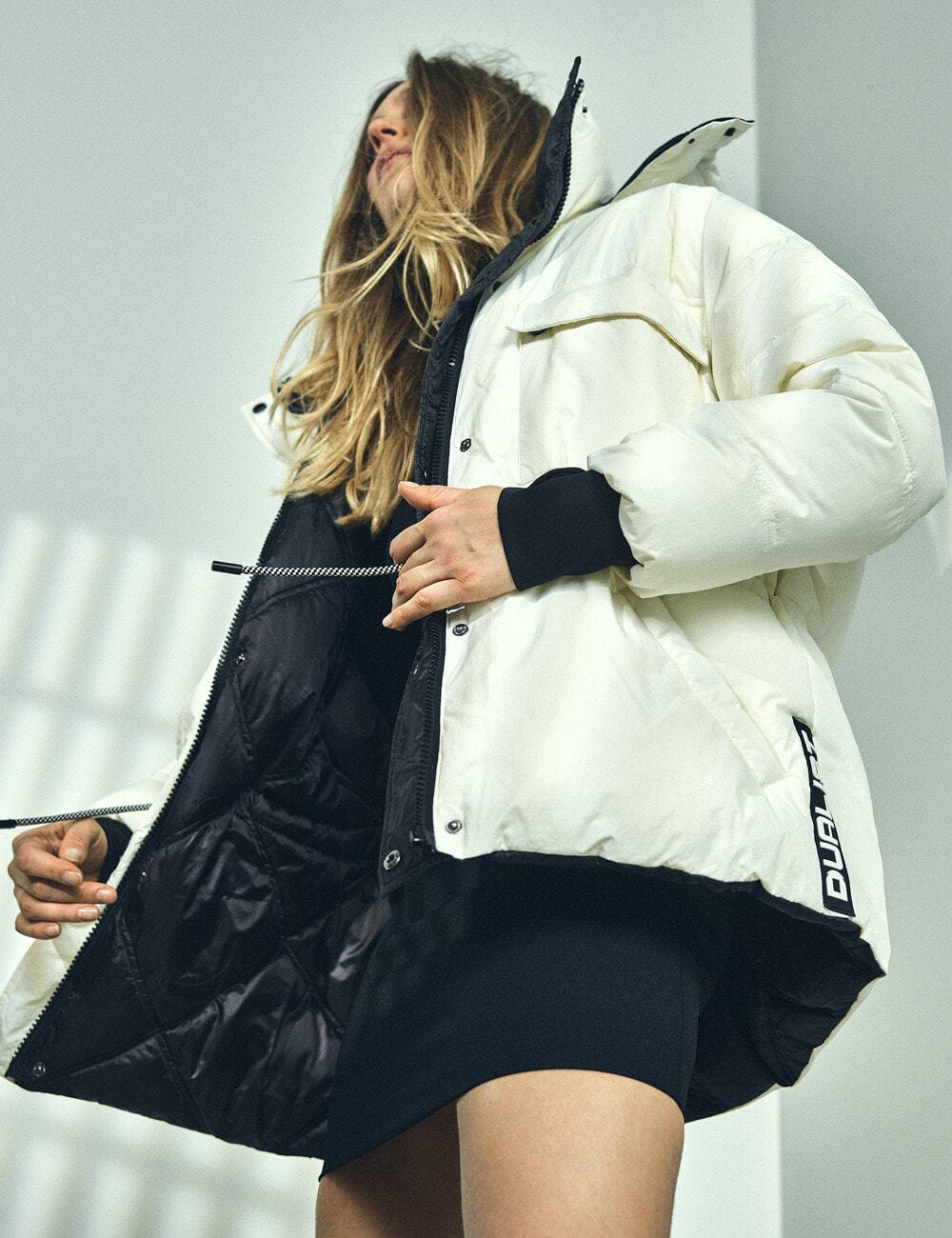 The Dualist Zorah coat in white is a stunning yet practical winter down coat. The coat is the ideal length finishing at the top of the leg leaving you free to move around. it is reversible, lightweight and 100% animal free, being made from a plant-based technical down that provides thermal support down to -10 °C. The Zorah coat is the perfect combination of comfort and style that creates a timeless look. Choose to to wear it with either the plain black on the outside or the white with the black trim detailing.