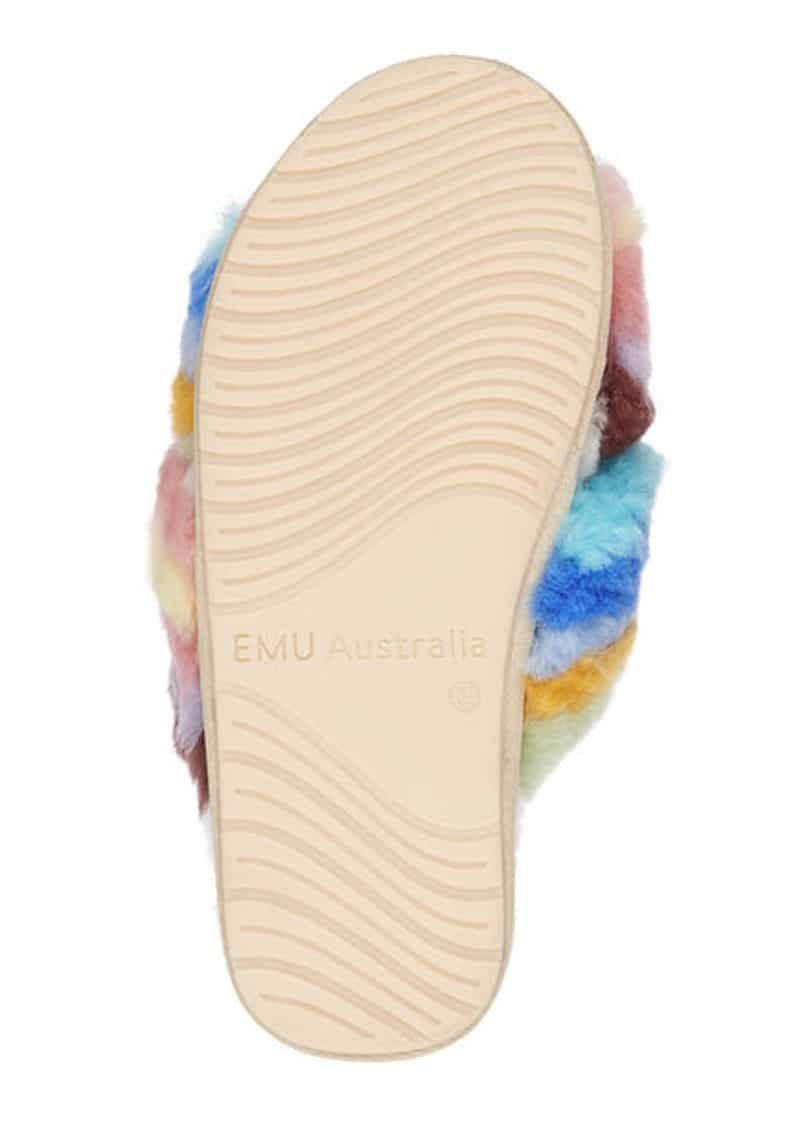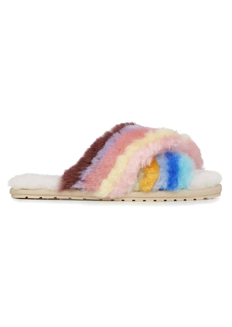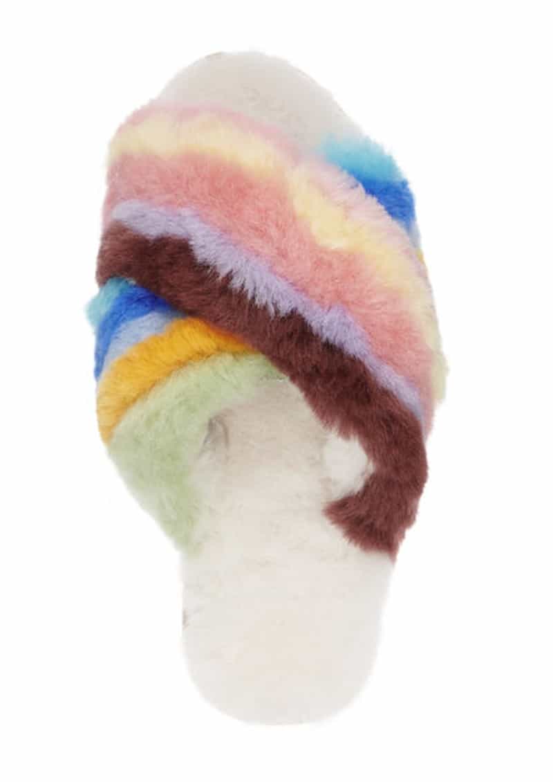 These EMU Australia Mayberry Rainbow Slipper in multi are the ultimate in fluffy and cosy. This women's slider slipper encloses your feet in year-round luxury Australian sheepskin with statement multicoloured rainbow stripes. Wide crossover straps made with the softest real Australian sheepskin wrap feet in comfort while the lightweight flexible rubber outsole provides traction indoors and out. Ideal for keeping your feet warm around the house, or wearing out during the summer, the Mayberry slider slipper really adds a touch of pretty style to the everyday. In 100% real Australian sheepskin. It’s trendy and fashionable, but also super comfortable and warm. The crossover design makes for easy wear, not to mention it’s super soft, and also Woolmark accredited.