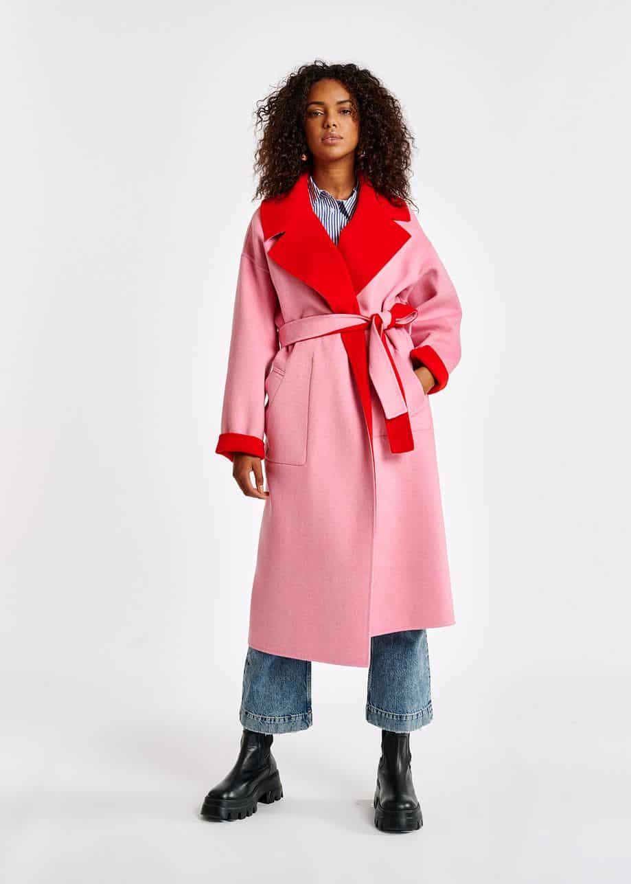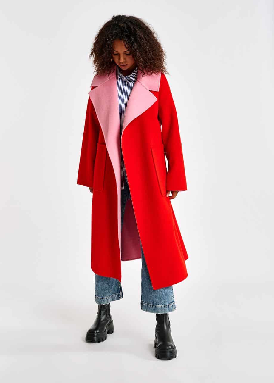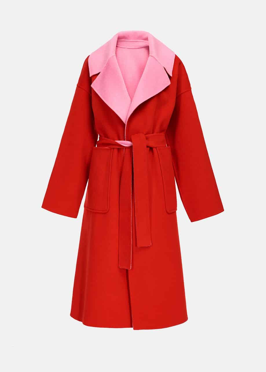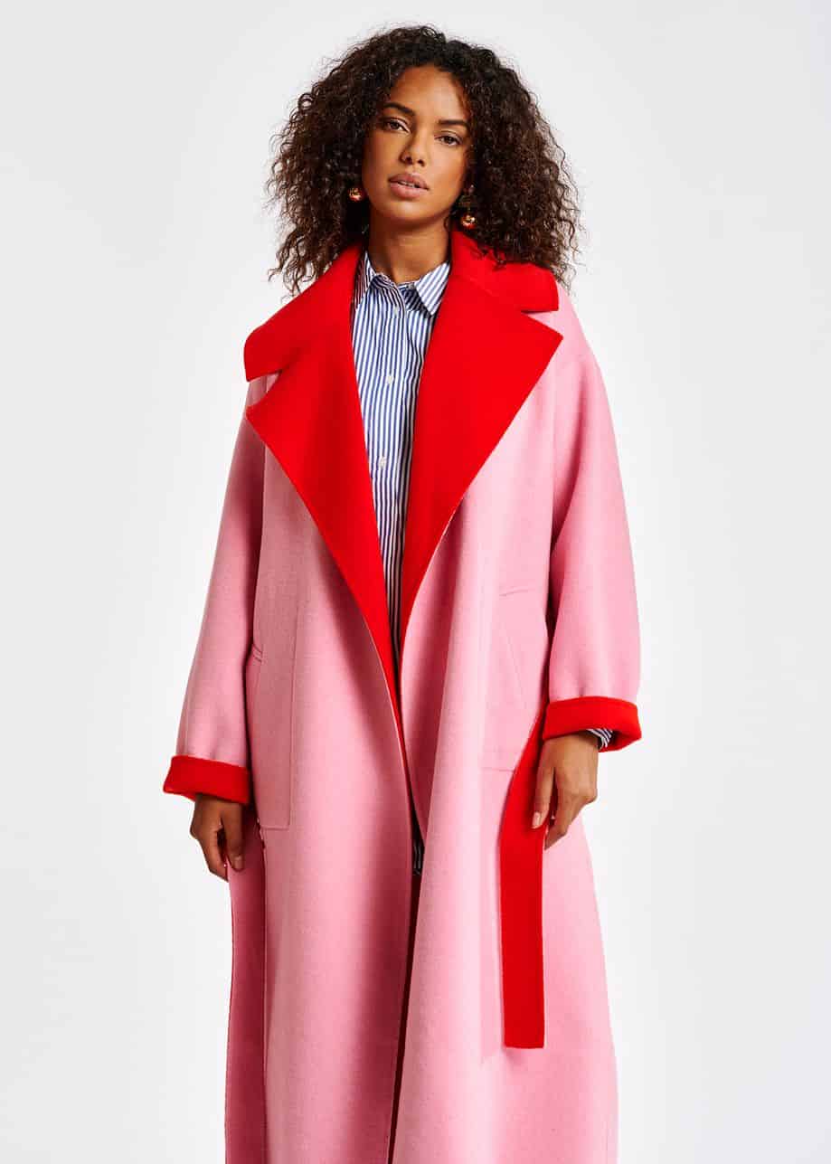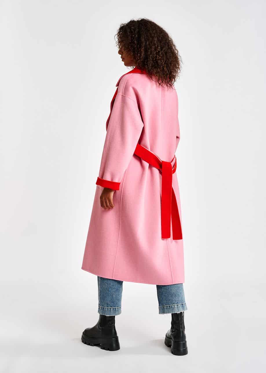 The Essentiel Antwerp Affluent double face coat in coral queen is a super stylish, wool blend felt coat. A loose fit, the coat has a double faced tie belt at the waist, a collar and pockets. This statement coat is great for injecting colour into your winter wardrobe and is the perfect statement coat for layering over knitwear. Guaranteed to get you noticed, this coat is not for the faint hearted.